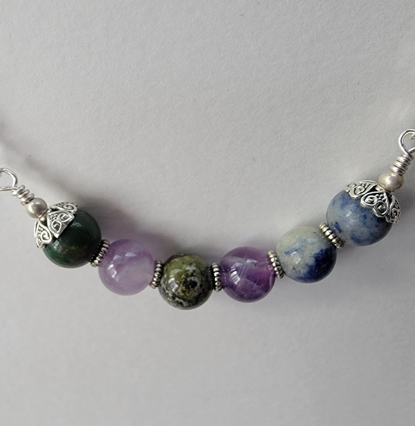 This necklace is put together on silver plated wire with heart bead caps, textured spacers, and round silver tone beads. The necklace measures approximately 21.5 inches. Each necklace comes in a box with a card that lists the stones it contains.