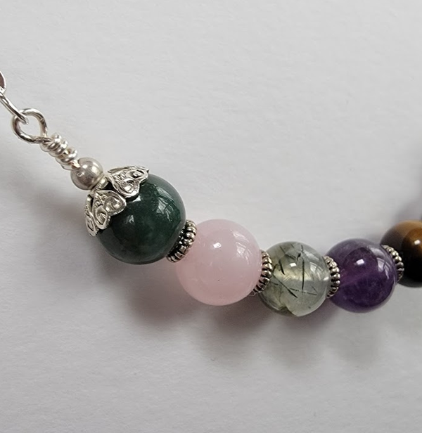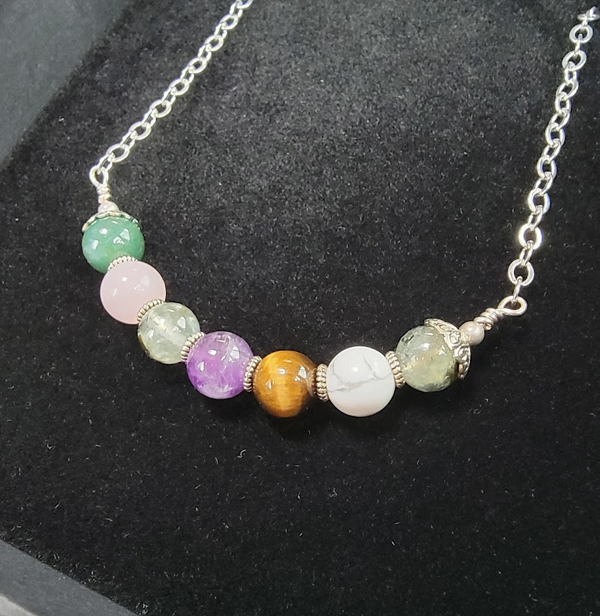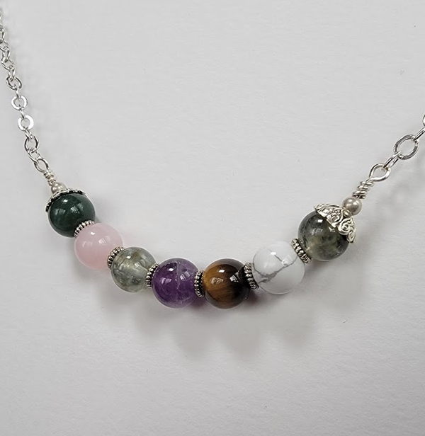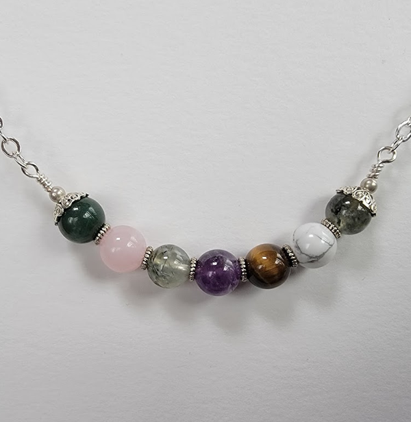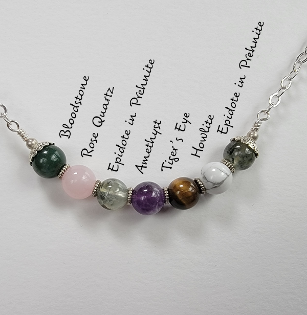 This necklace is put together on silver plated wire with heart bead caps, textured spacers, and round silver tone beads. The necklace measures approximately 22 inches. Each necklace comes in a box with a card that lists the stones it contains.