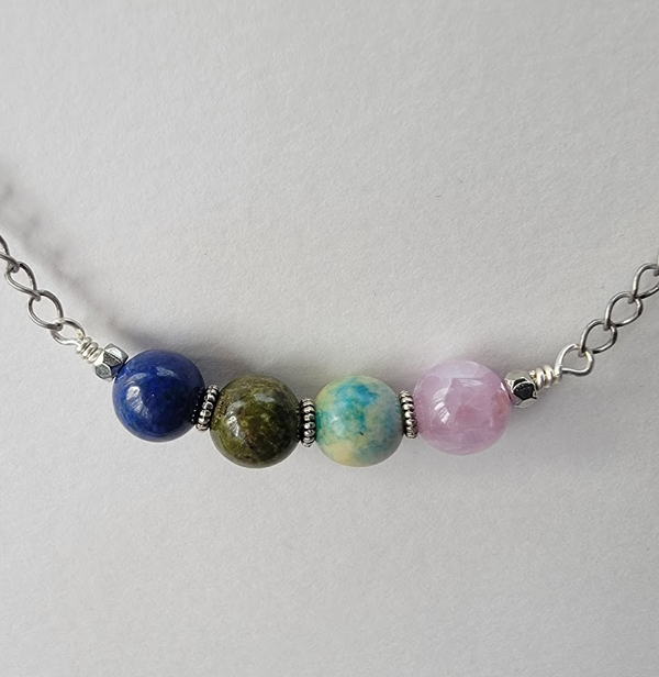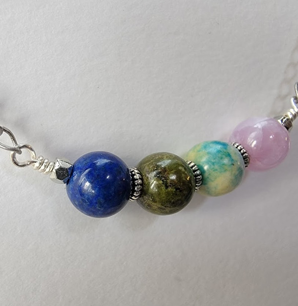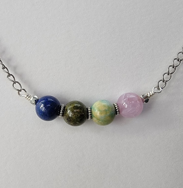 This necklace is put together on silver plated wire with hexagonal beads and textured spacers. The necklace measures approximately 19 inches. Each necklace comes in a box with a card that lists the stones it contains.