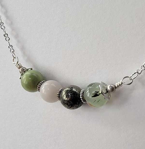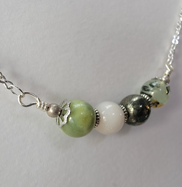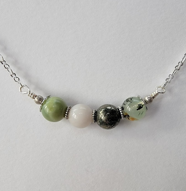 This necklace is put together on silver plated wire with flower bead caps, textured spacers, and round silver tone beads. This one is shorter than most at 16 inches. Each necklace comes in a box with a card that lists the stones it contains.