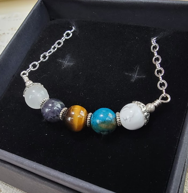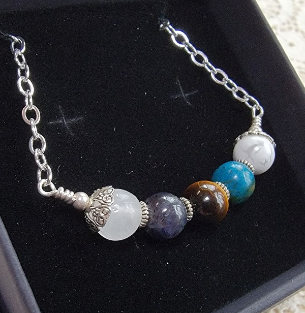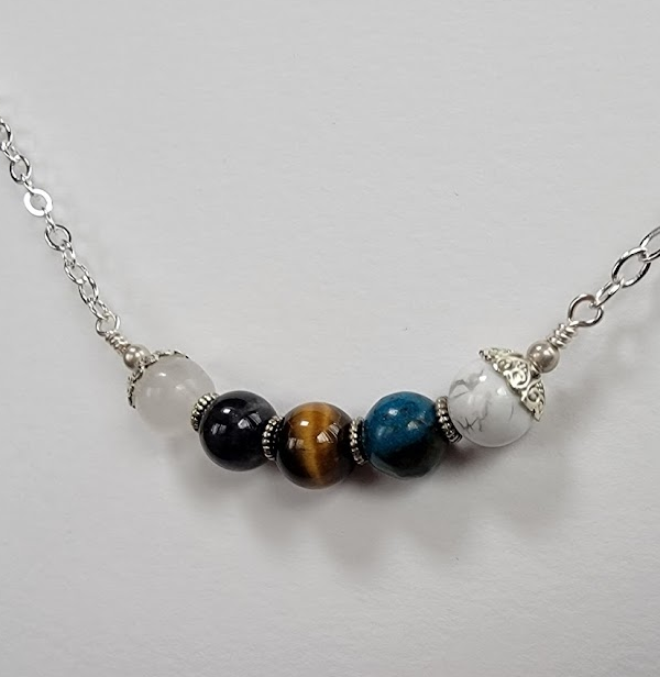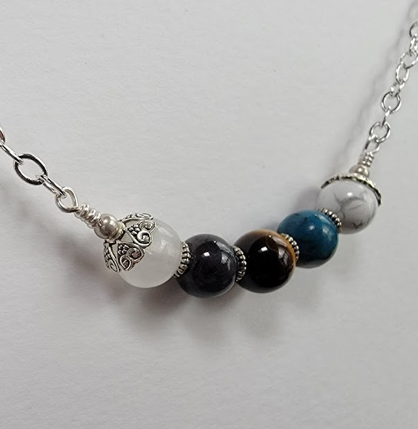 This necklace is put together on silver plated wire with heart bead caps, textured spacers, and round silver tone beads. The necklace measures approximately 22 inches. Each necklace comes in a box with a card that lists the stones it contains.