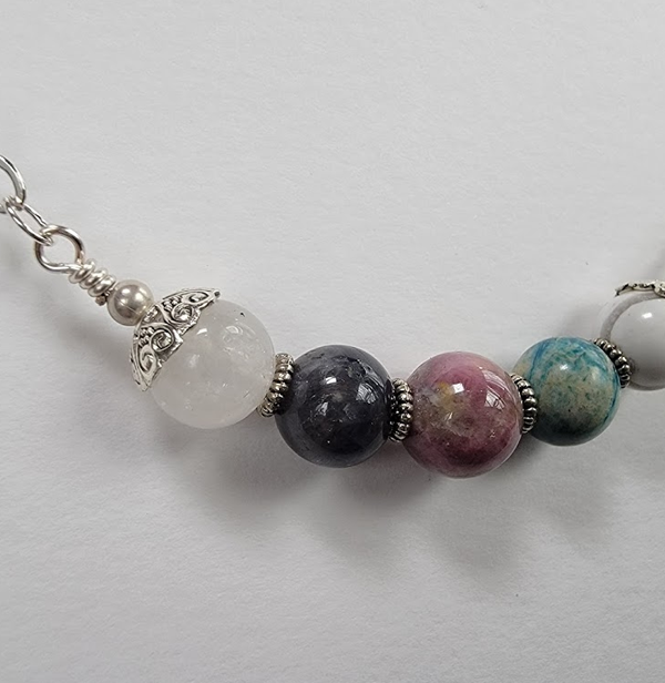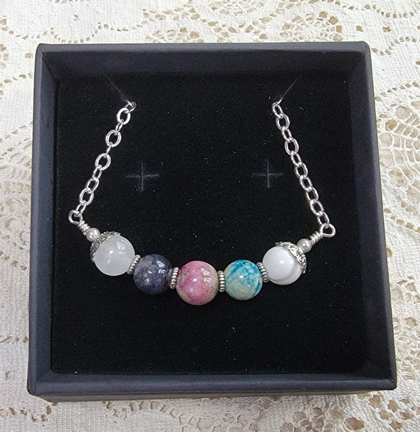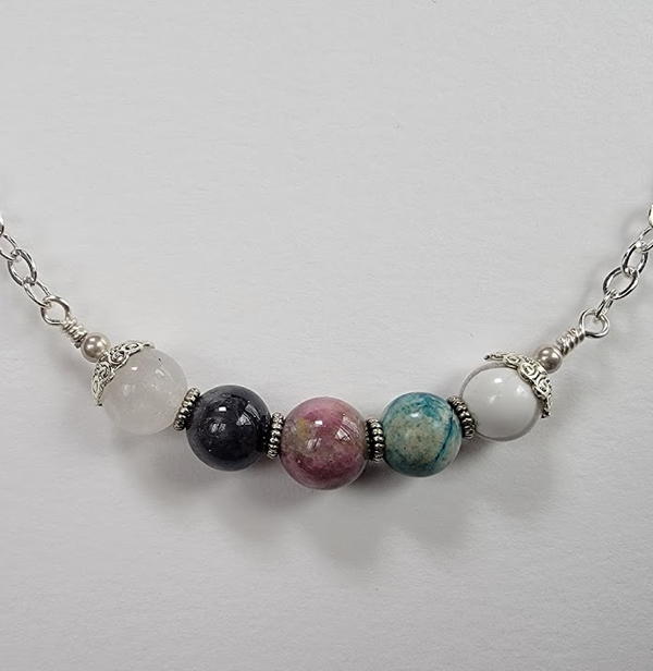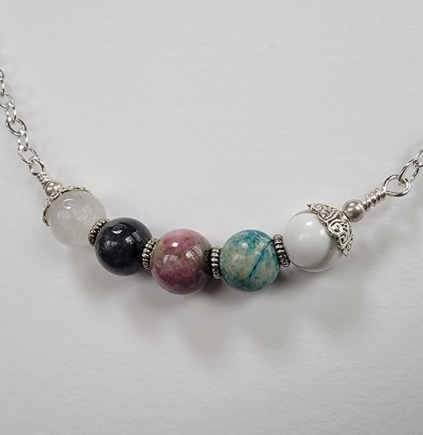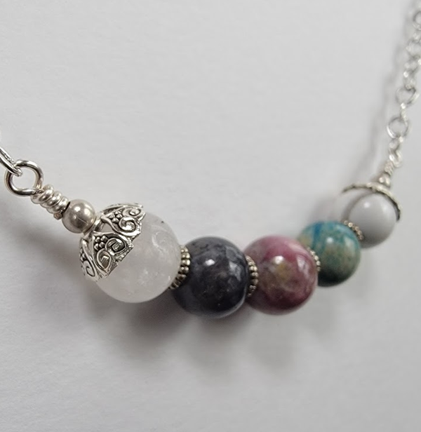 This necklace is put together on silver plated wire with heart bead caps, textured spacers, and round silver tone beads. The necklace measures approximately 21.5 inches. Each necklace comes in a box with a card that lists the stones it contains.