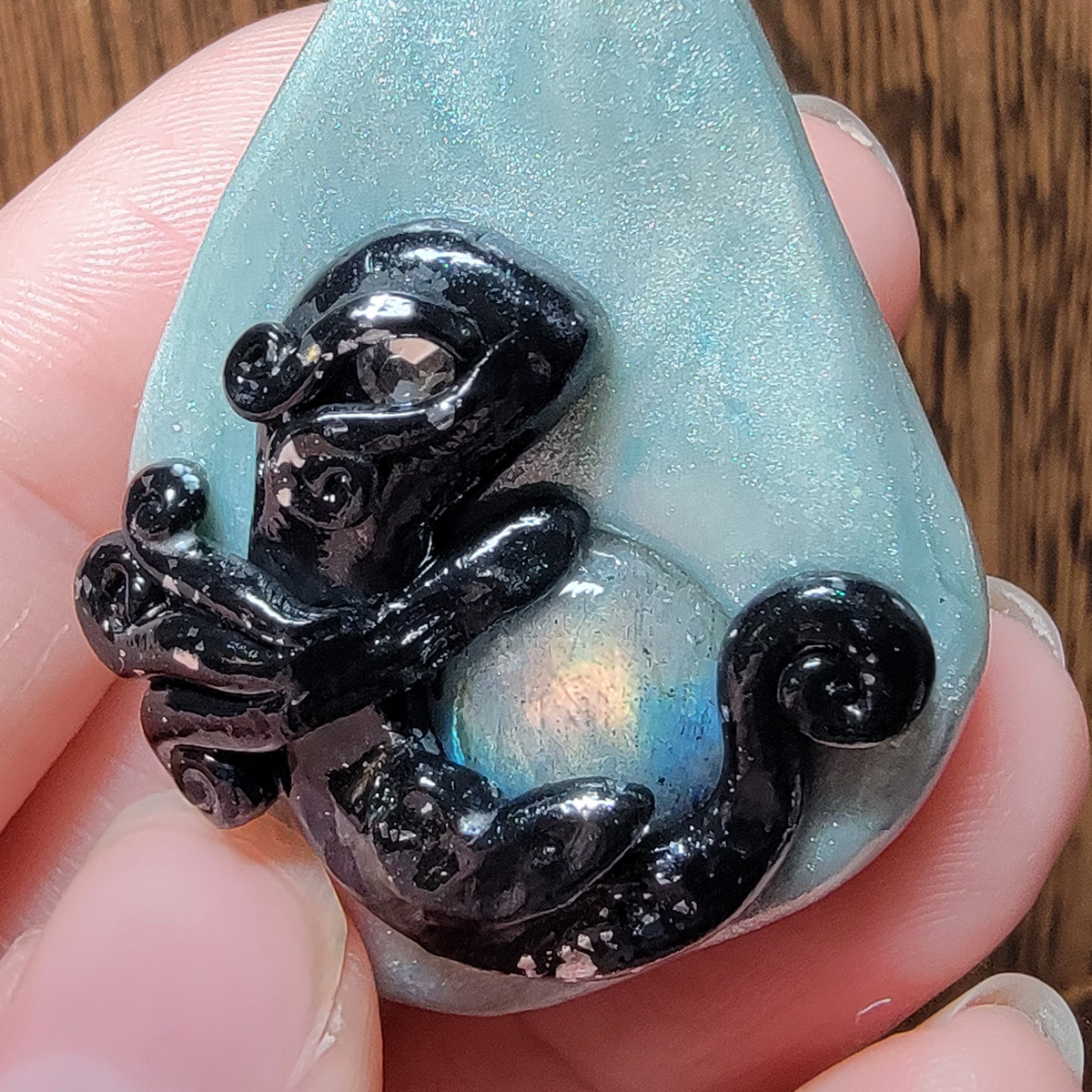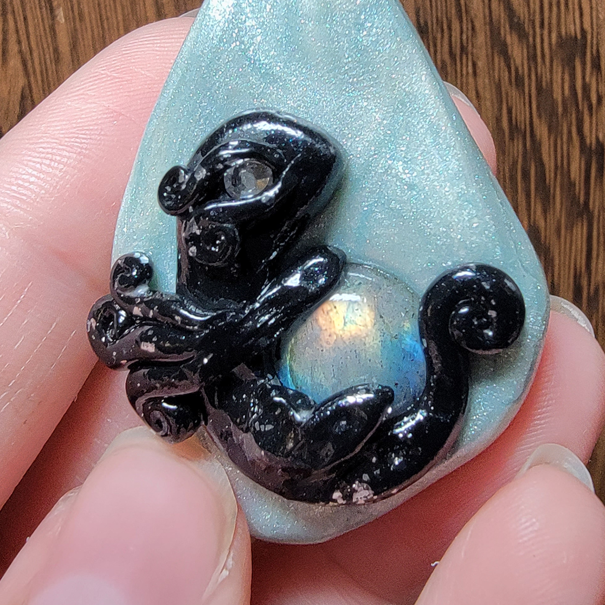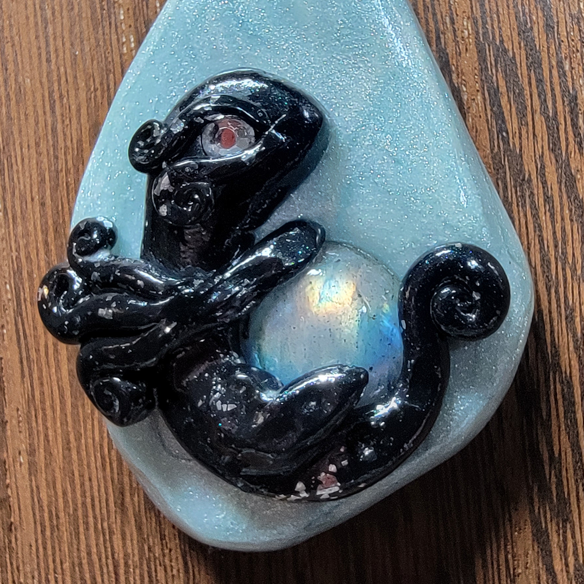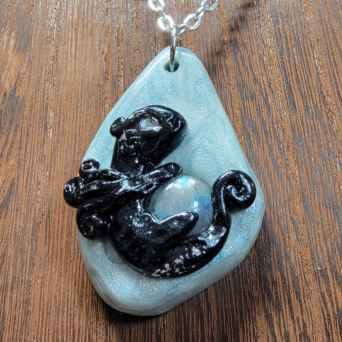 A polymer clay dragon pendant wrapped up around it's labradorite stone treasure. This piece of labradorite flashes dramatically in many different colors!
