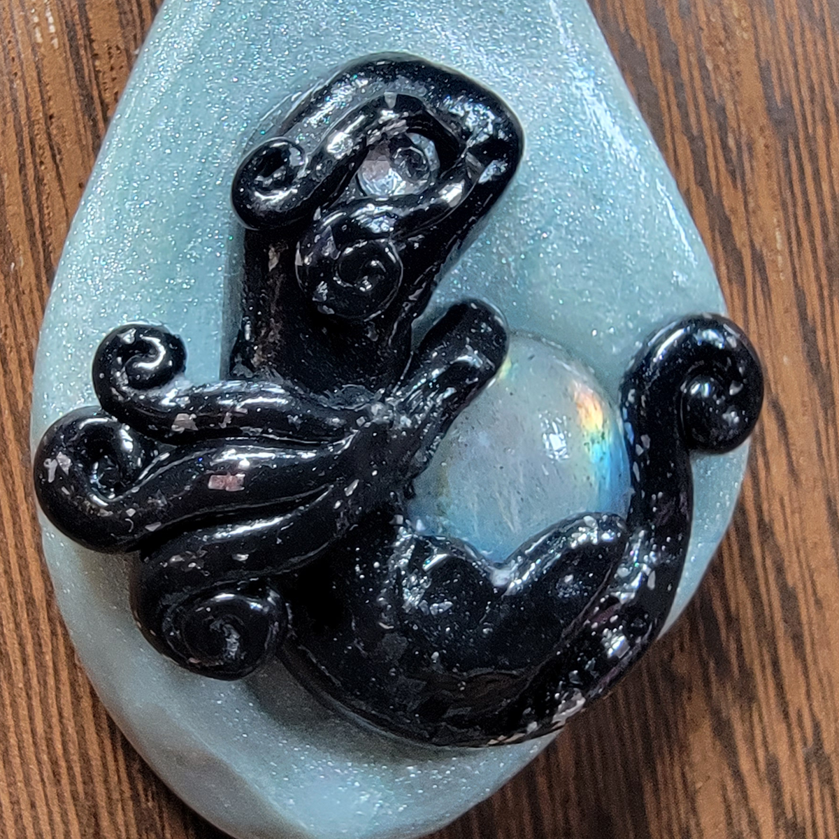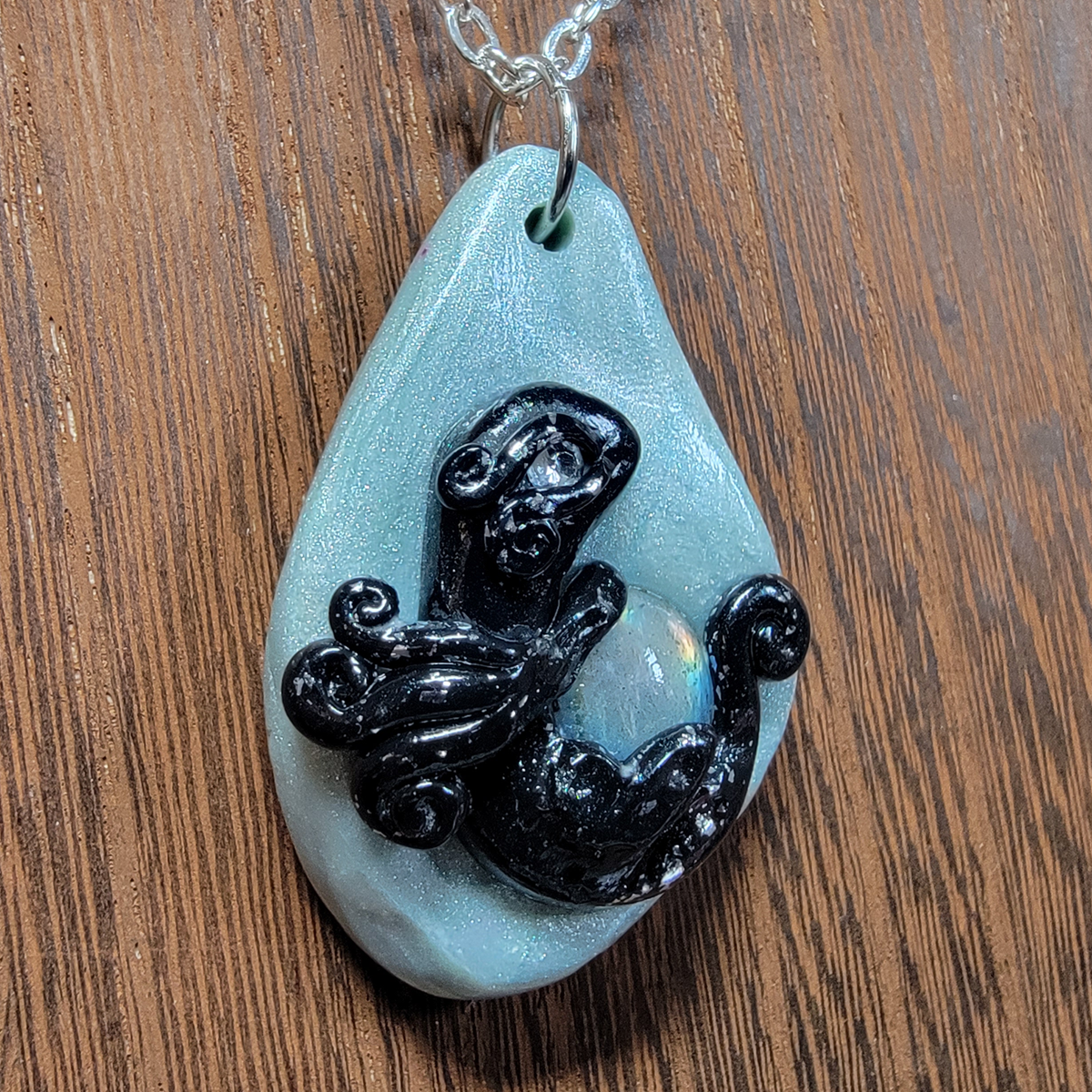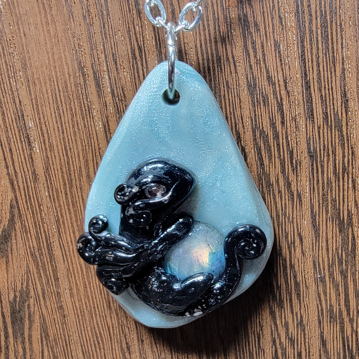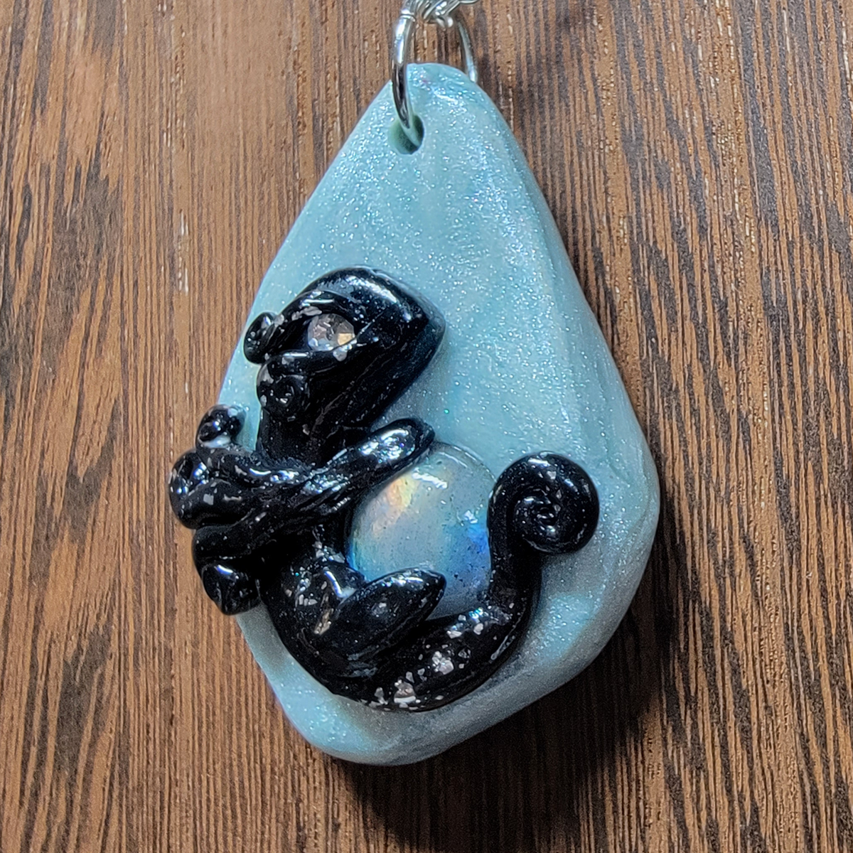 The dragon is hand sculpted with black clay and has some imitation silver foil flakes. It has a Preciosa rhinestone eye. The background is a shimmering blue.