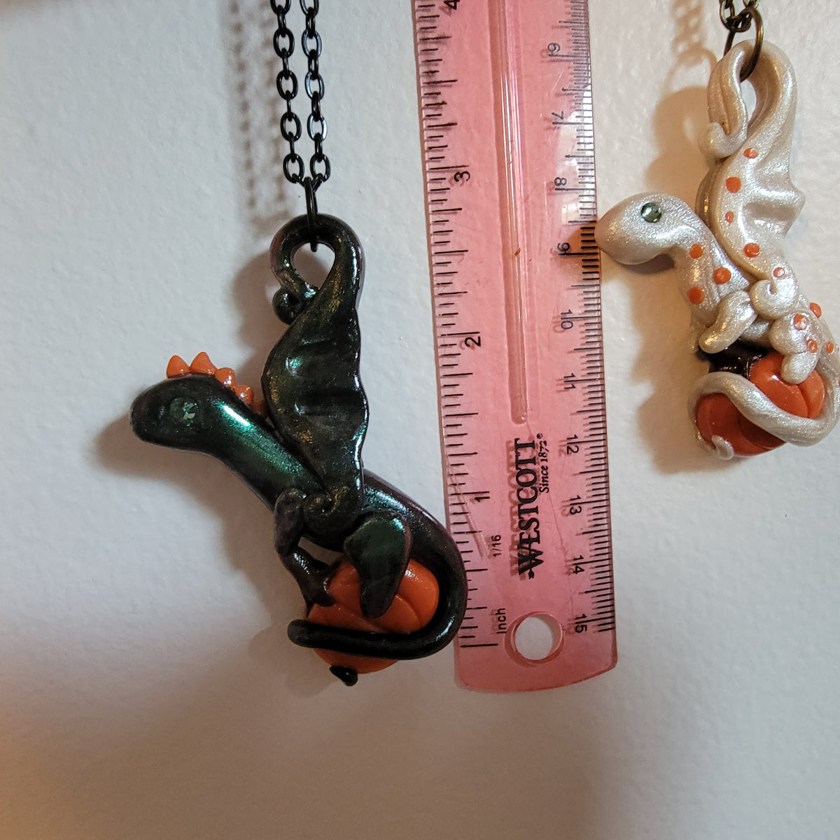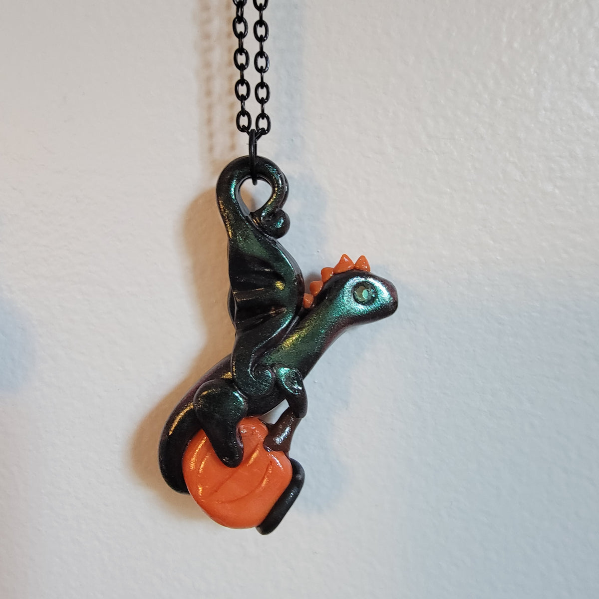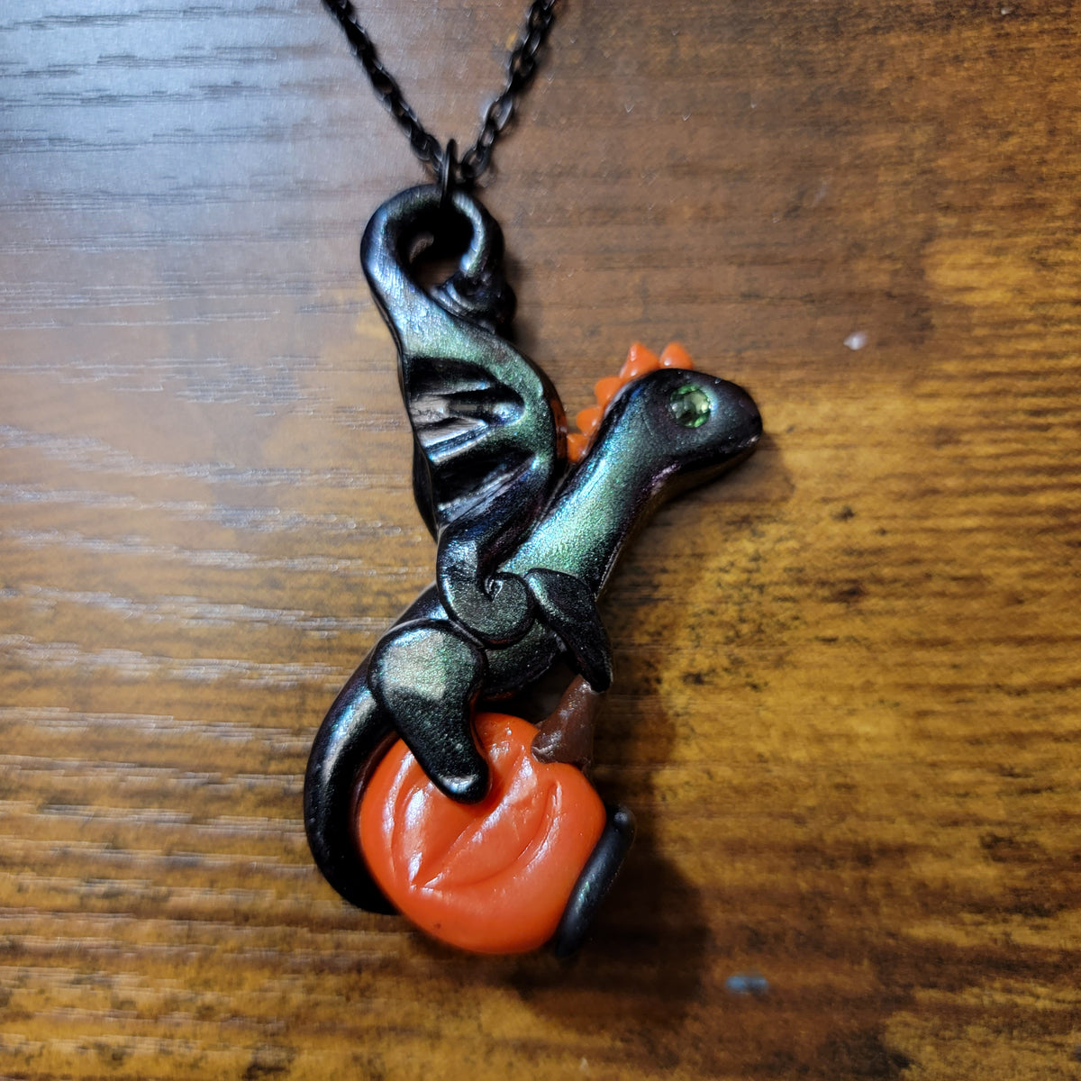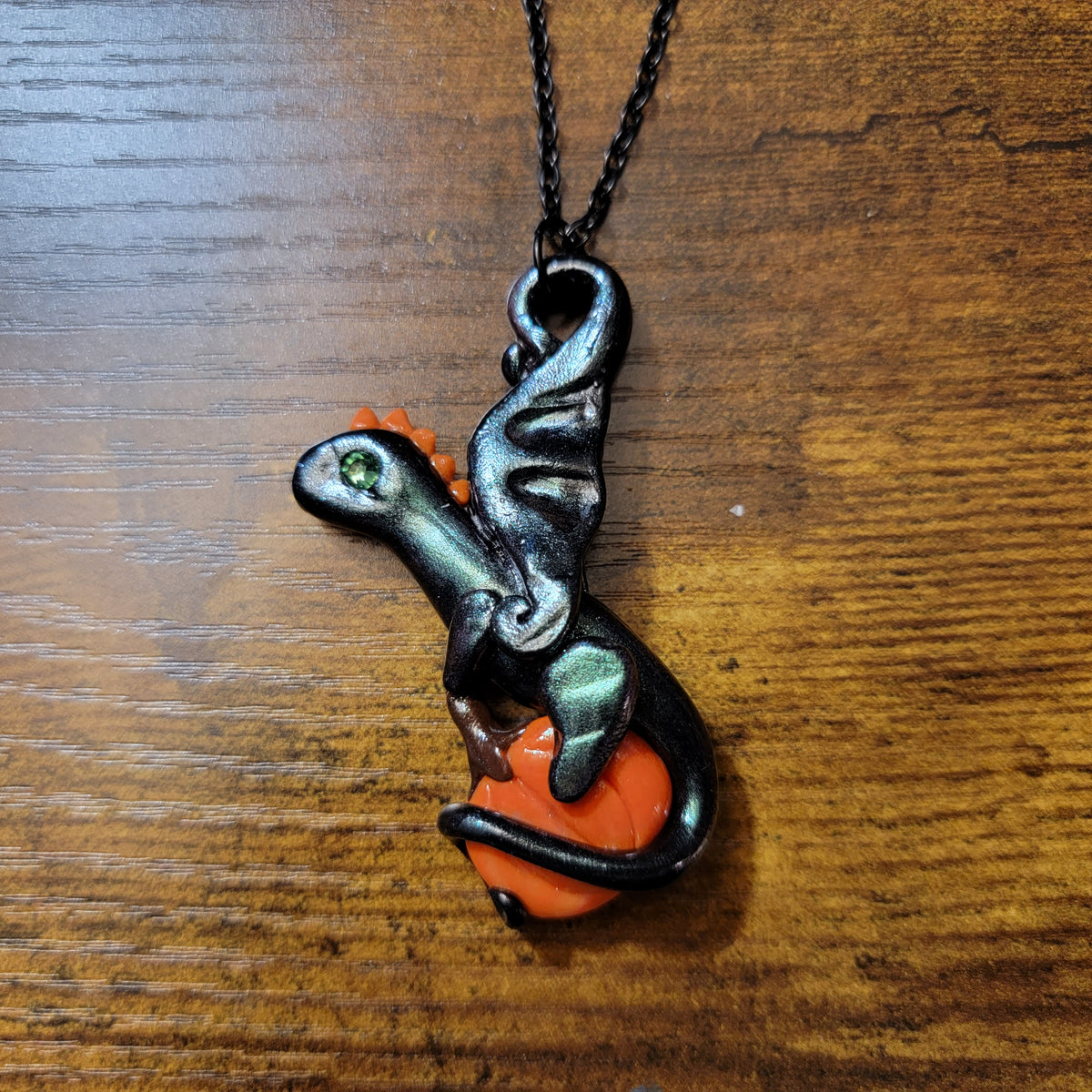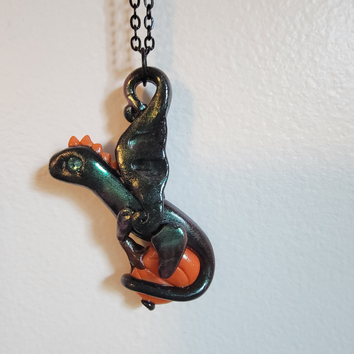 A handmade polymer clay dragon hanging onto a pumpkin. It is a black and green shimmer dragon with orange spikes and green rhinestone eyes.
