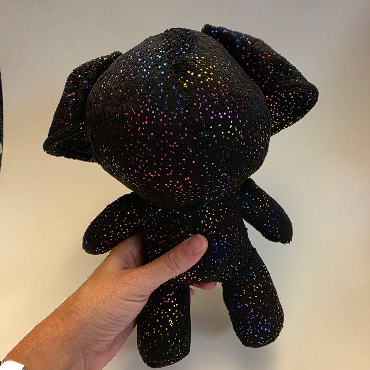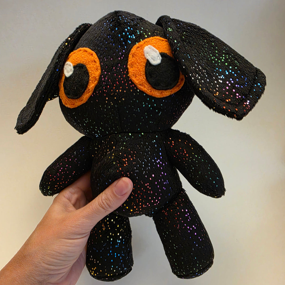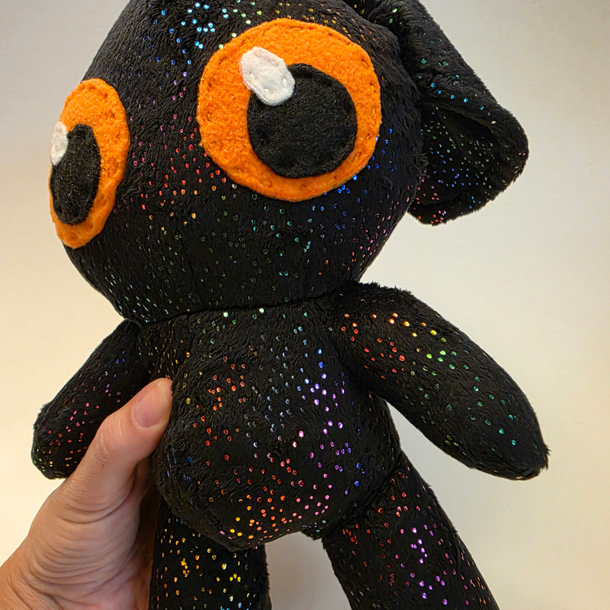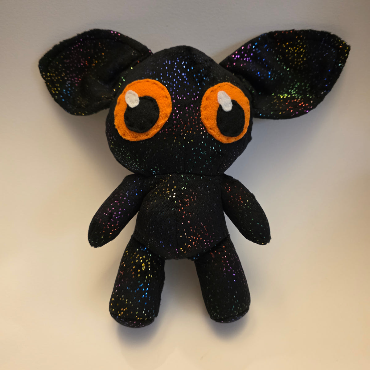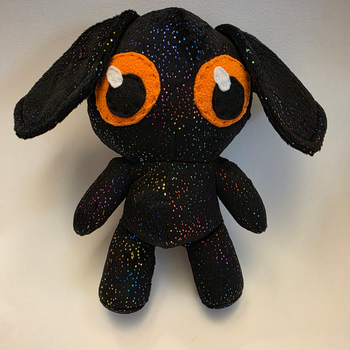 A gremlin that is ready to celebrate Halloween with you year-round!  This gremlin is made with a black minky with rainbow sparkles, with bright orange eyes. Measures about 10 inches tall with an ear-span of about 14 inches.