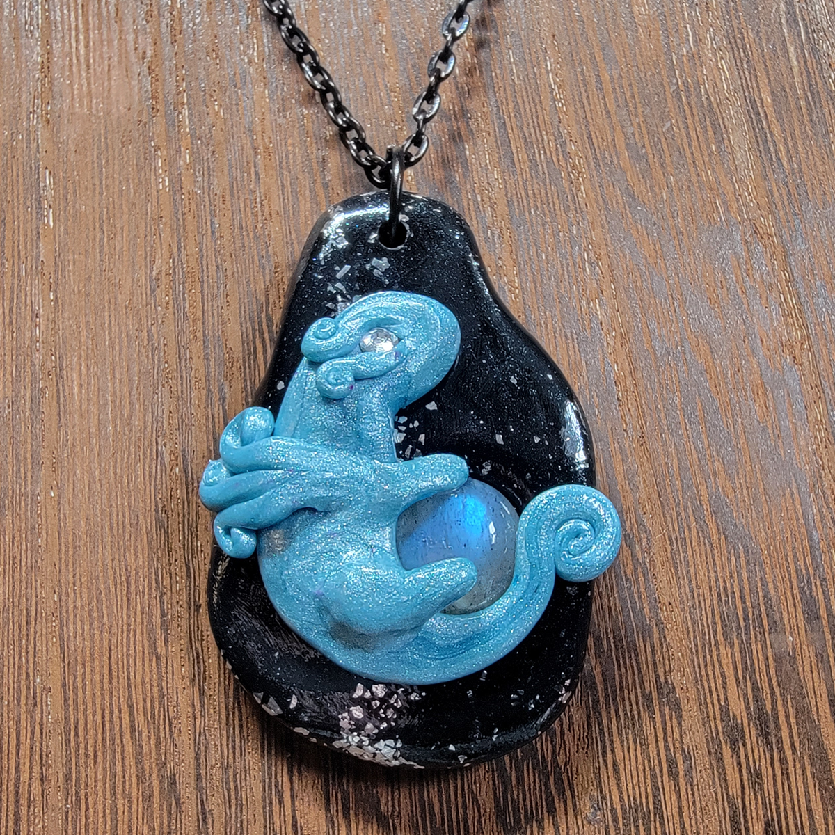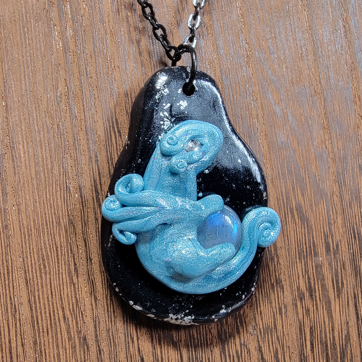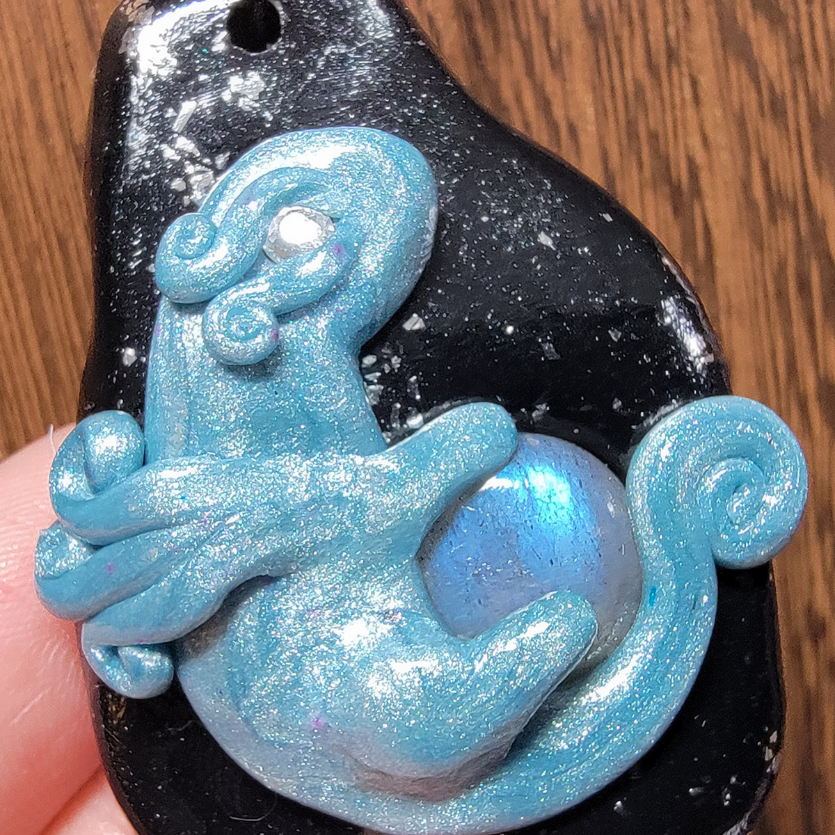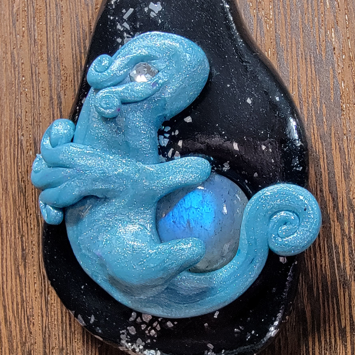 A polymer clay dragon pendant wrapped up around it's labradorite stone treasure. This piece of labradorite flashes a lovely blue to match its dragon!