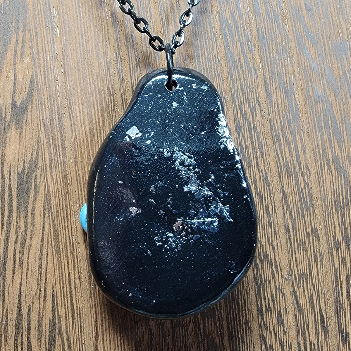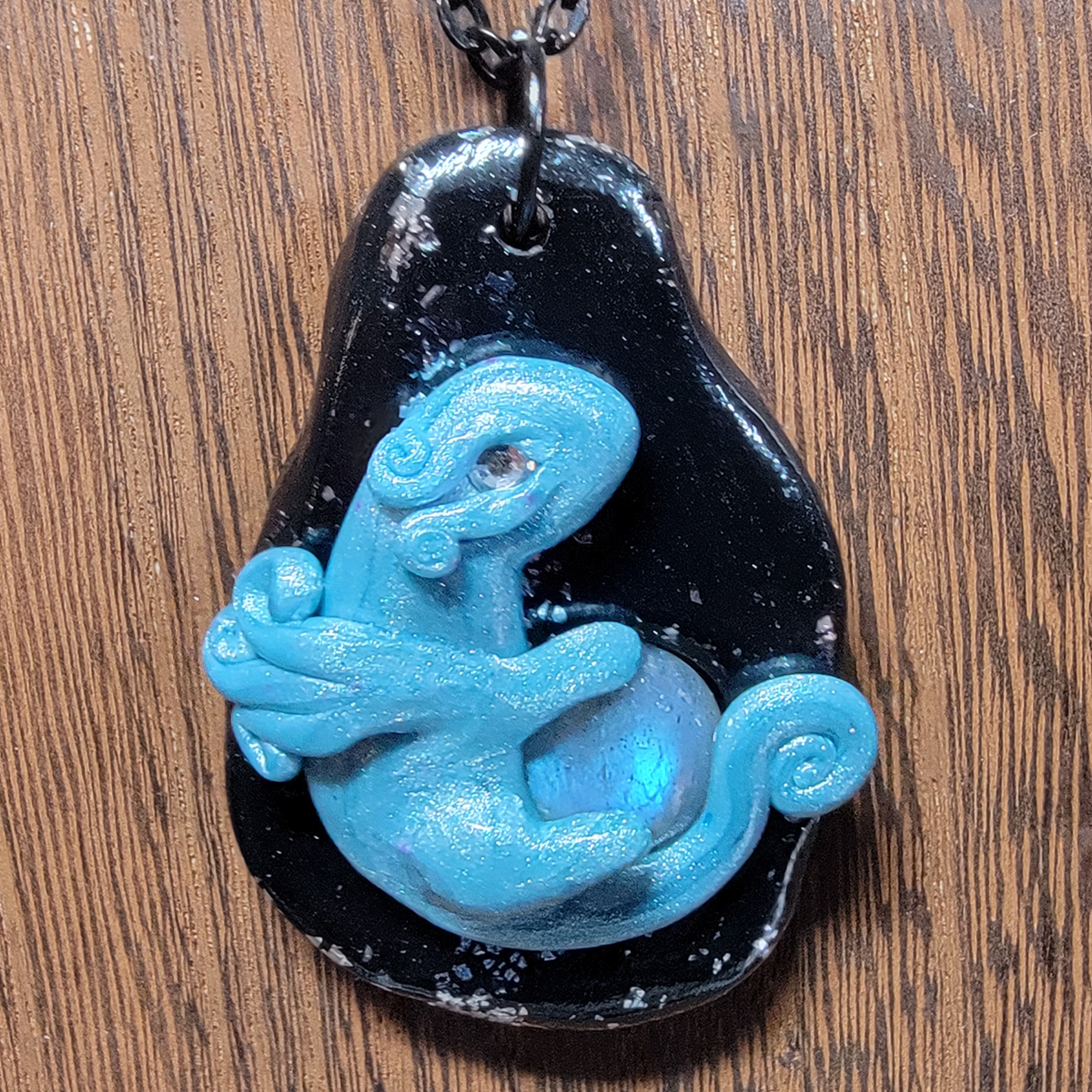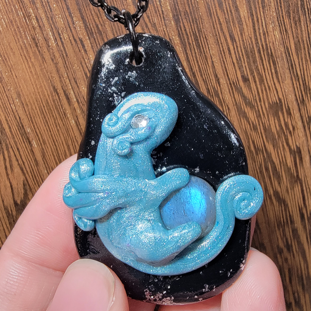 The dragon is hand sculpted with a shimmery pearl blue clay and has a Preciosa rhinestone eye. The background is black with imitation silver foil flakes. The pendant has been sealed with a glaze for extra shine and protection.