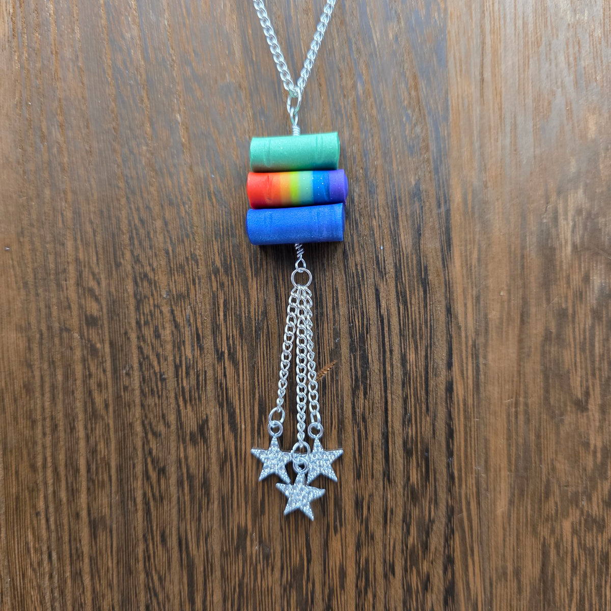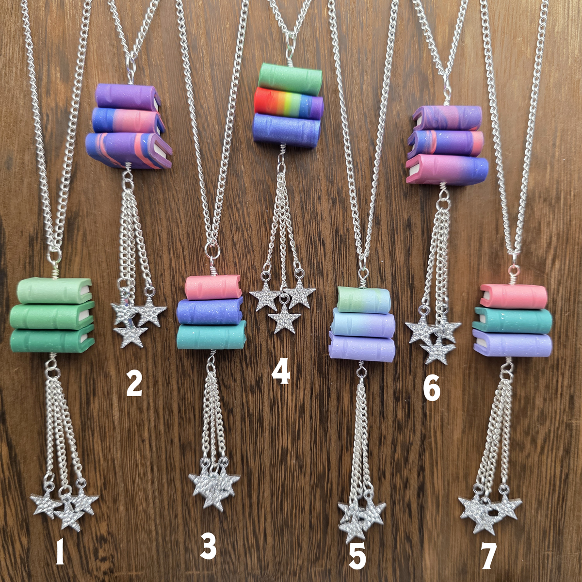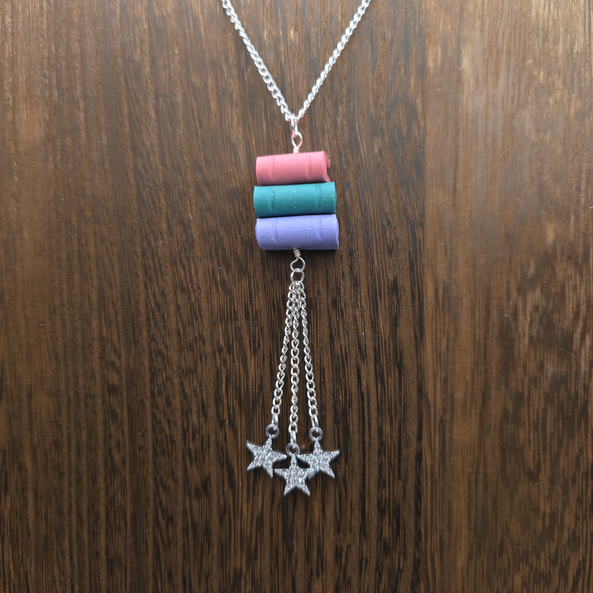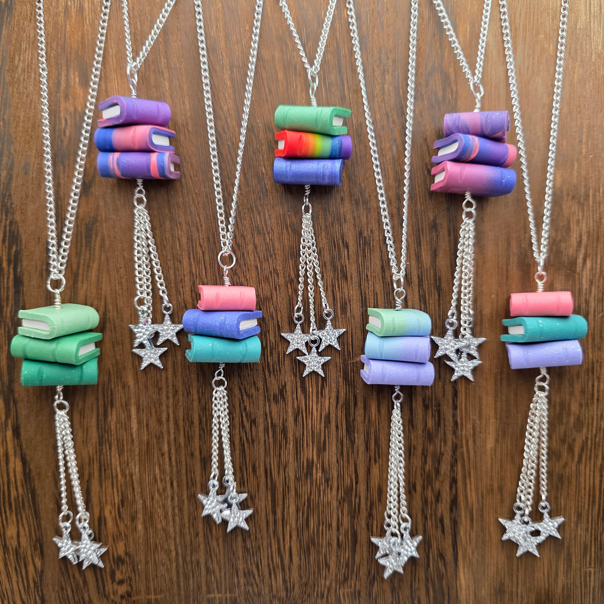 Pendants made from stacks of handmade polymer clay books with stars hanging beneath them.  These pendants are made with scrap clay from other projects, so the color combinations are unique and unlikely to be repeated! Books are all handmade individually, and are able to turn on the pendant, making them excellent fidgets.