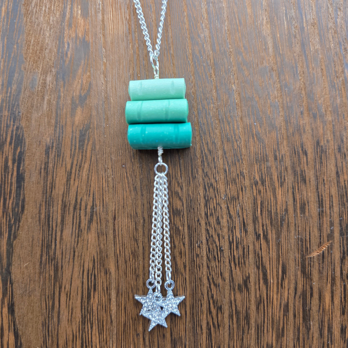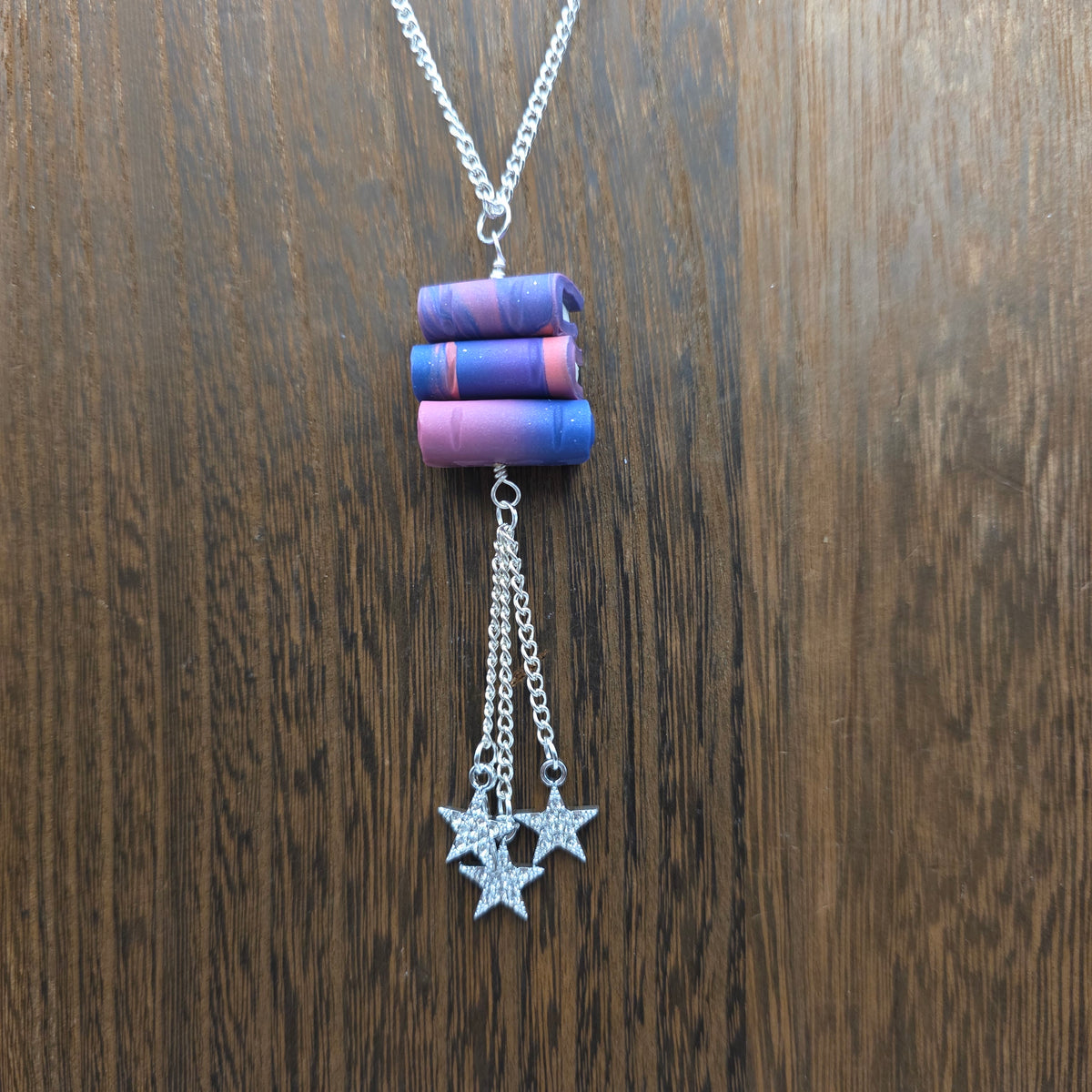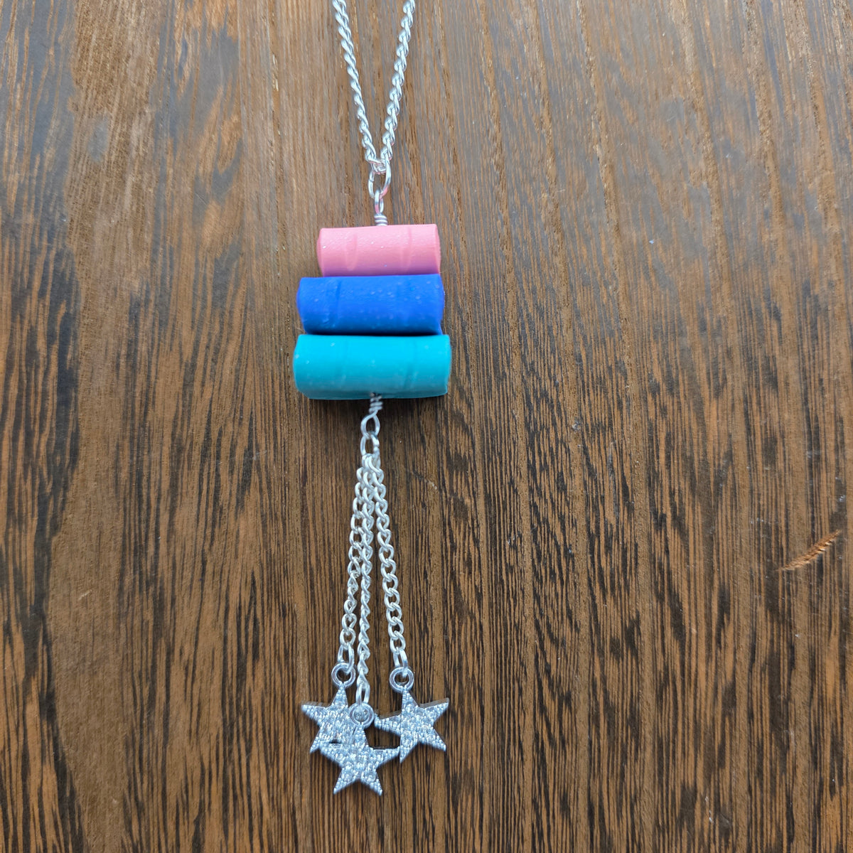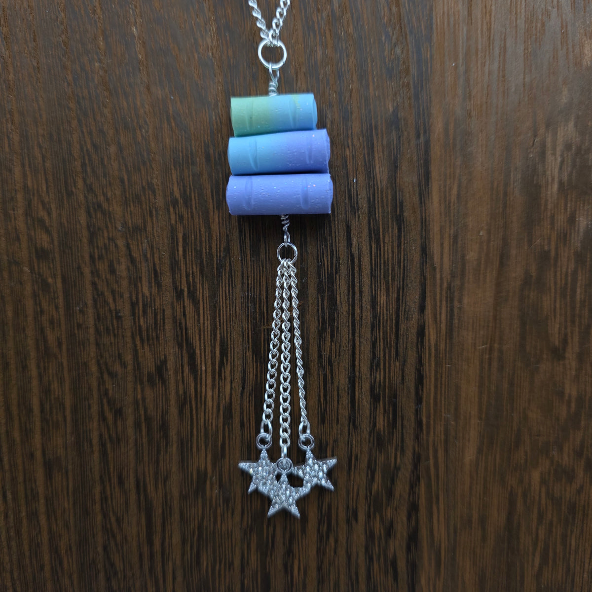 Pendants made from stacks of handmade polymer clay books with stars hanging beneath them.  These pendants are made with scrap clay from other projects, so the color combinations are unique and unlikely to be repeated! Books are all handmade individually, and are able to turn on the pendant, making them excellent fidgets.