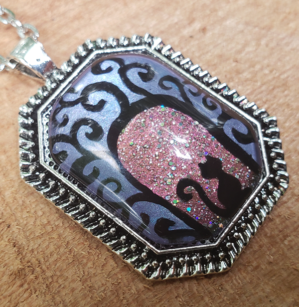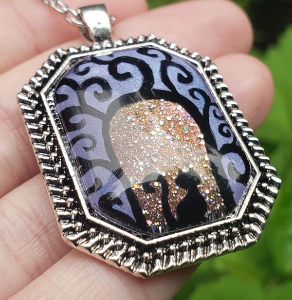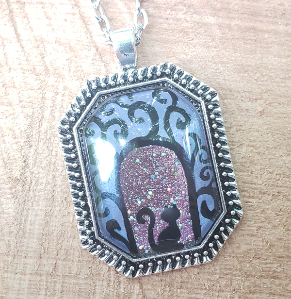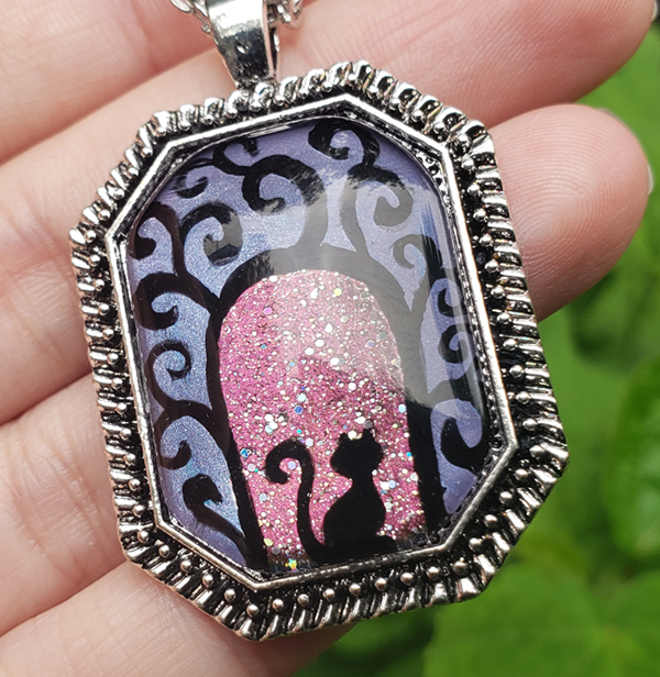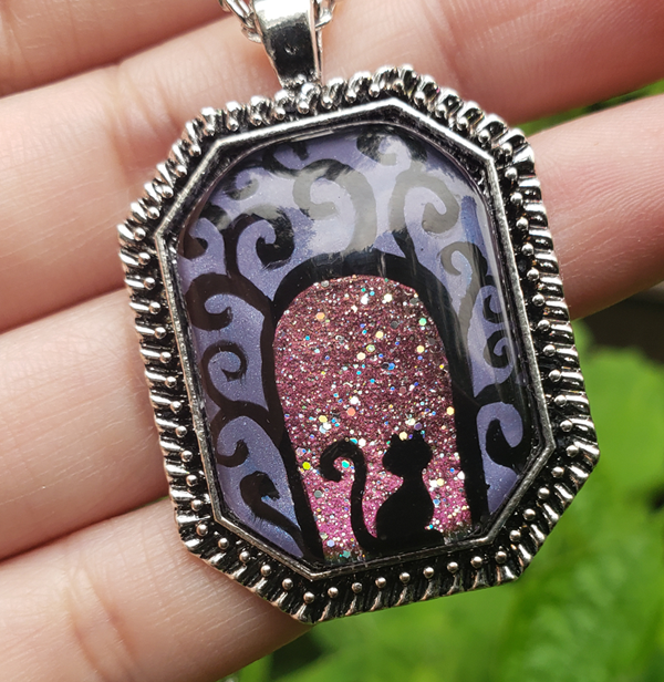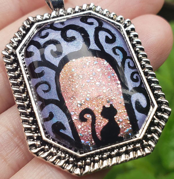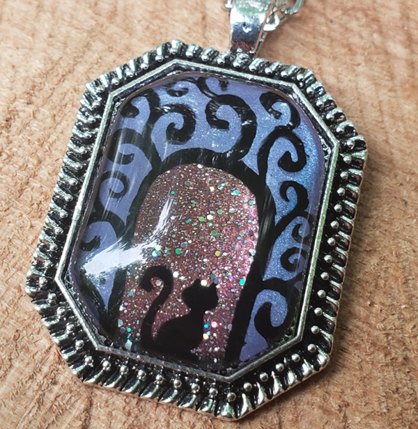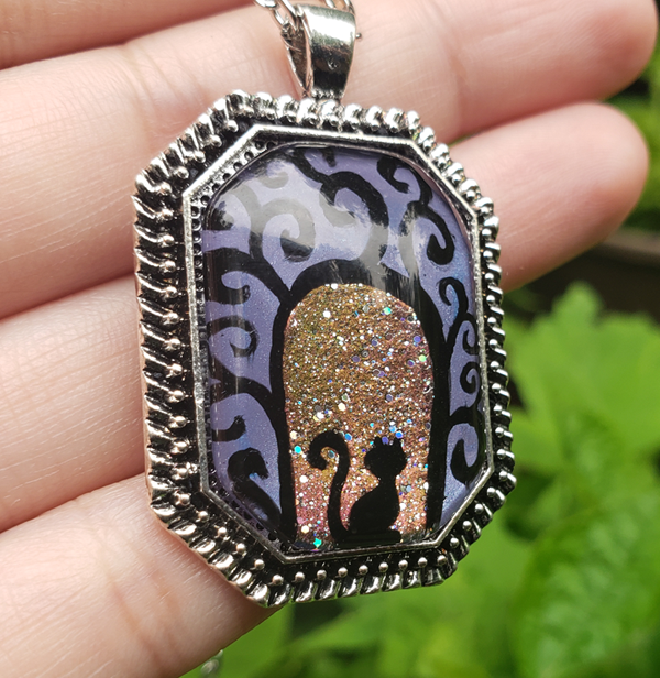 A swirly gateway with a cat sitting beneath it, waiting to take you on a magical journey.  You can see versions of this hand-painted pendant with other creatures as well.
