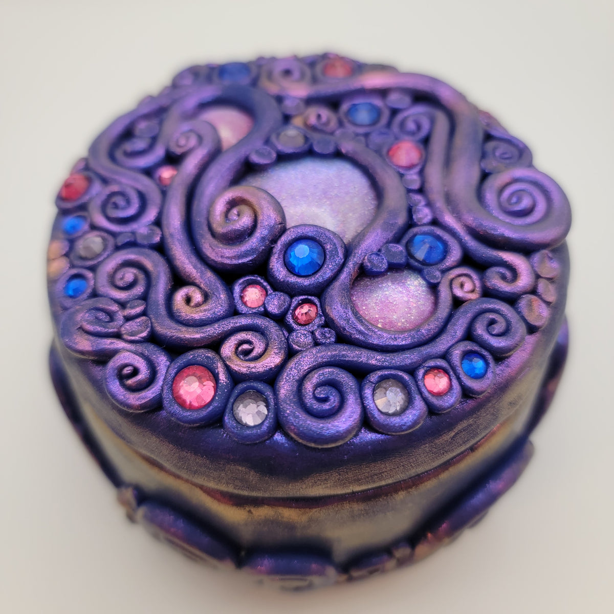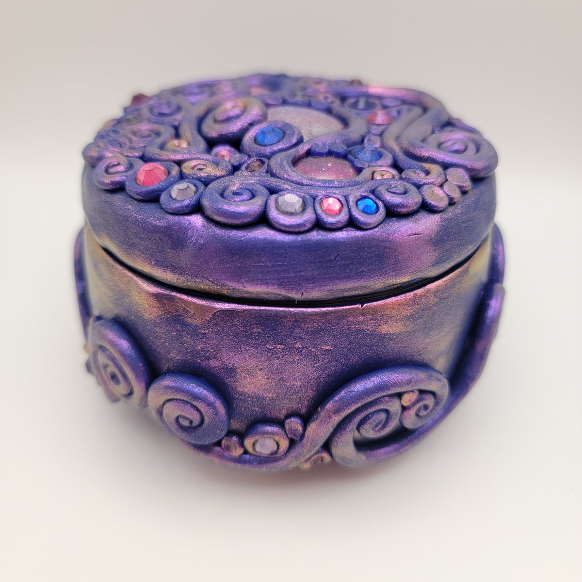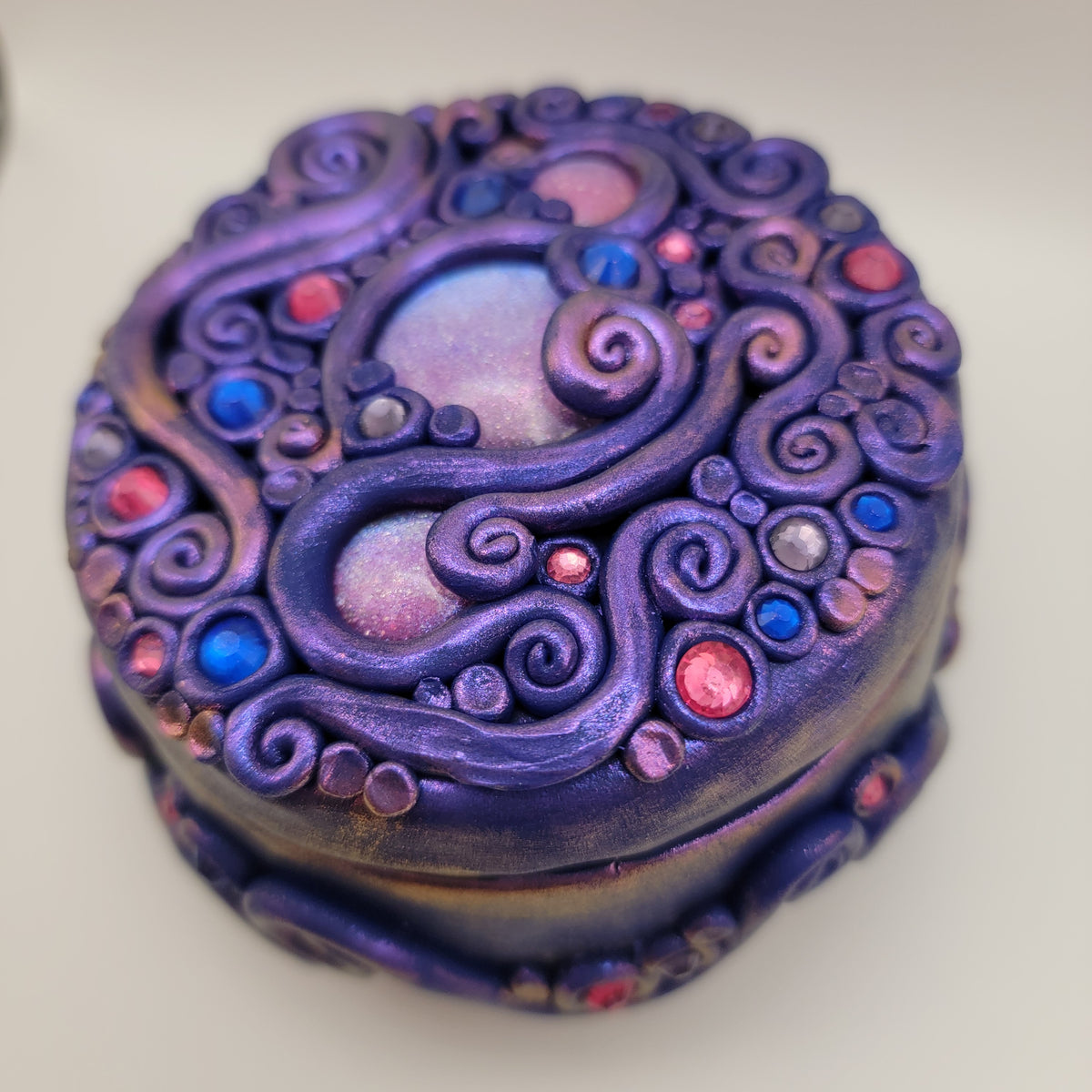A polymer clay trinket box with a base of bright blue clay. The three glass cabochons are painted with a glittery iridescent paint that shimmers from blue to purple to pink. The cabochons are surrounded by swirls, dotted with rhinestones of hot pink, blue, and lavender. The whole box is brushed with chameleon powder of pink and purple, giving the whole box even a more delightfully chaotic look.