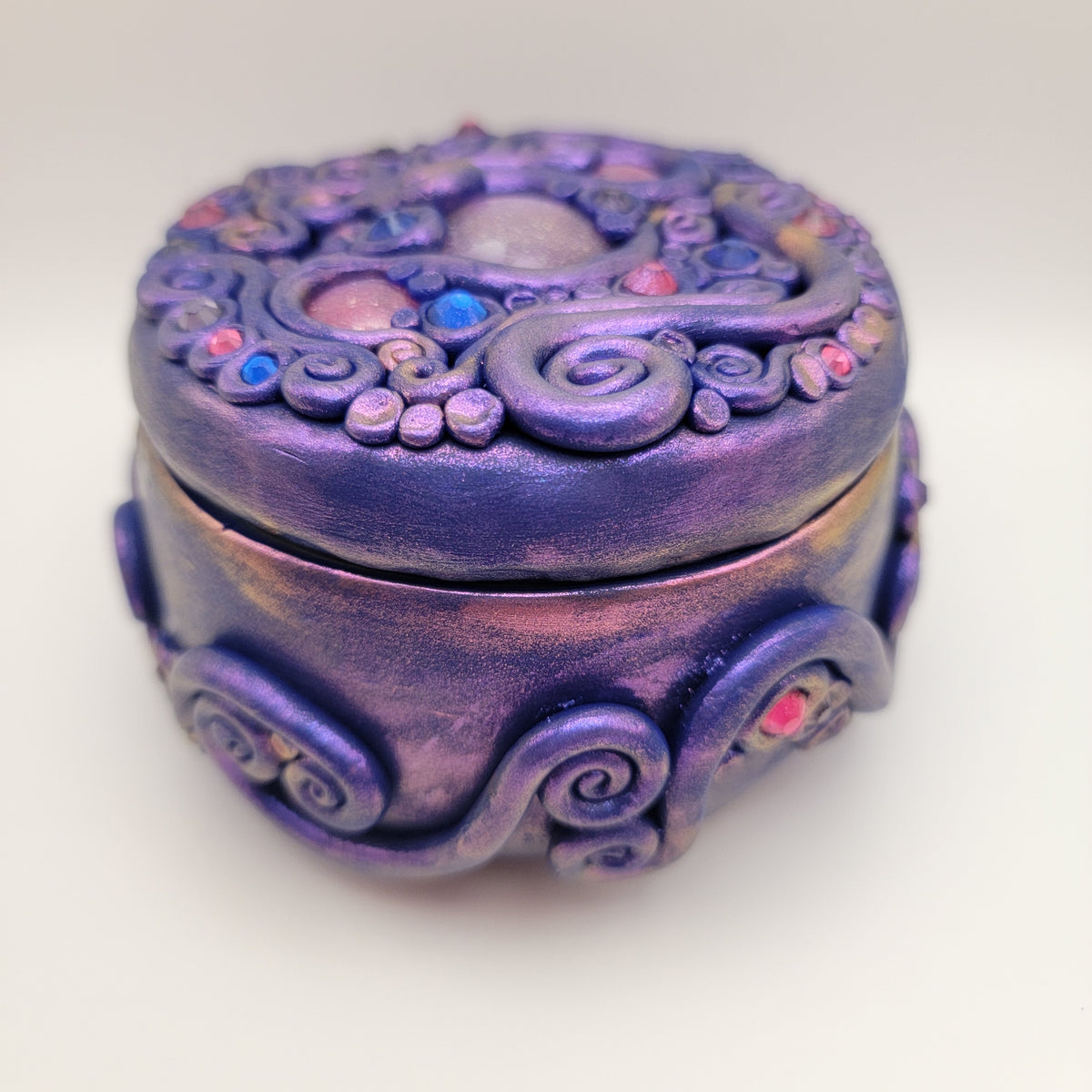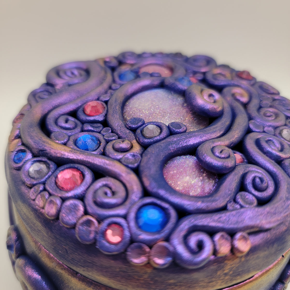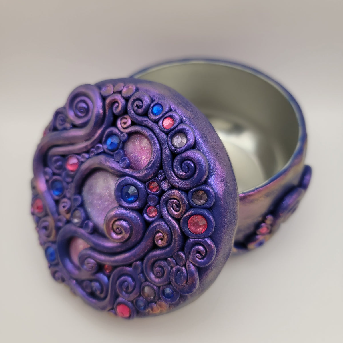 A polymer clay trinket box with a base of bright blue clay. The three glass cabochons are painted with a glittery iridescent paint that shimmers from blue to purple to pink. The cabochons are surrounded by swirls, dotted with rhinestones of hot pink, blue, and lavender. The whole box is brushed with chameleon powder of pink and purple, giving the whole box even a more delightfully chaotic look.