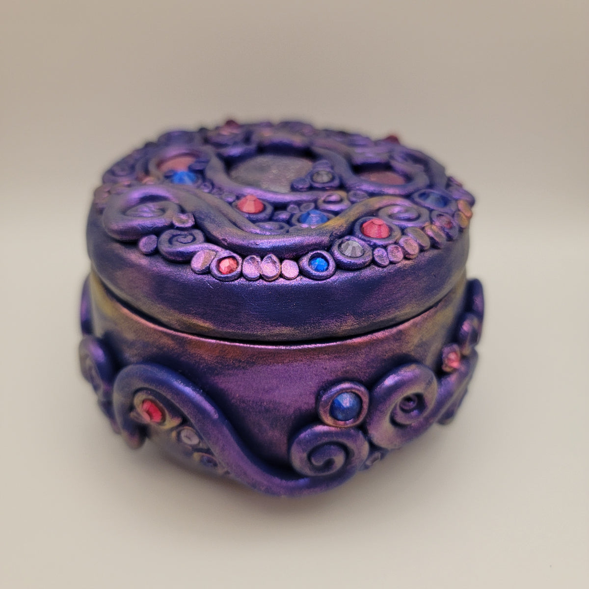 Trinket boxes are built around metal boxes that measure 3.5 inches at the base, 3.25 inches at the top, and are 2.25 inches tall. Actual size will be a bit larger with the added layers of clay.