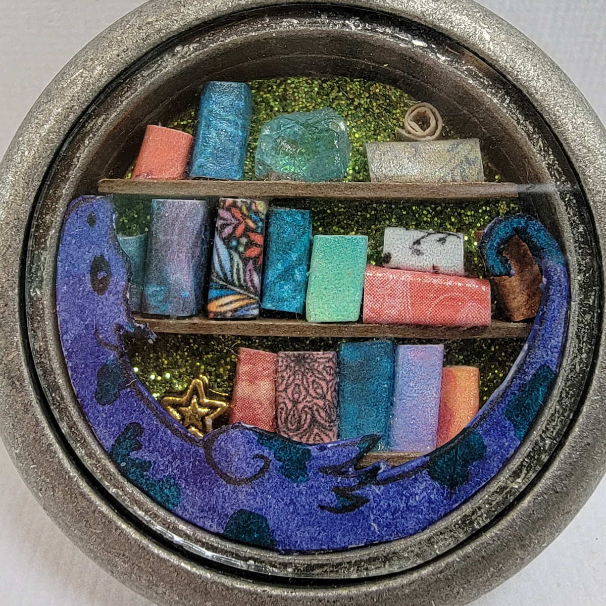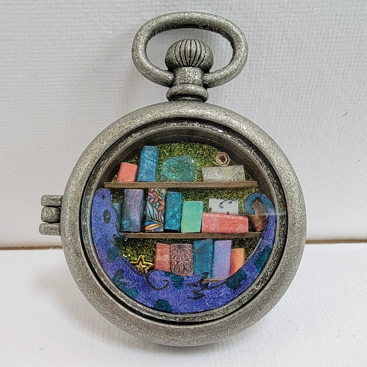 A miniature library guarded by a purple-blue inside of an antique silver toned pocket watch style case with a clear window.