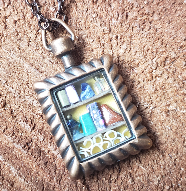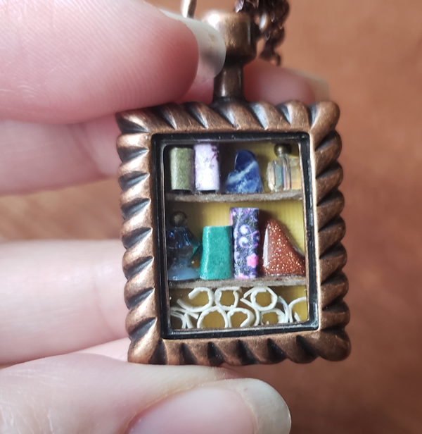 A miniature library packed with magical curiosities. In this pendant you'll find handmade scrolls, books, and potion bottles, along with goldstone and lapis stones.