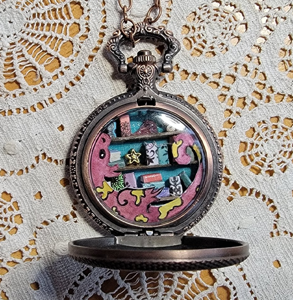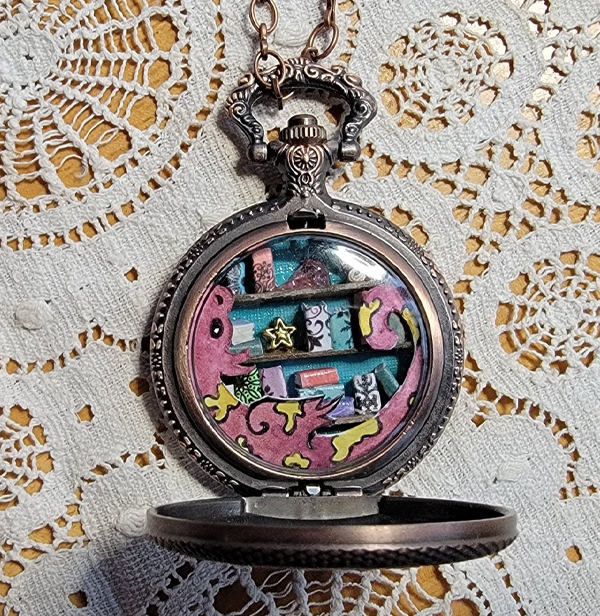 A miniature library hidden away inside of a beautiful pocket watch case. This magical little library is guarded by a dragon with a paint pattern.