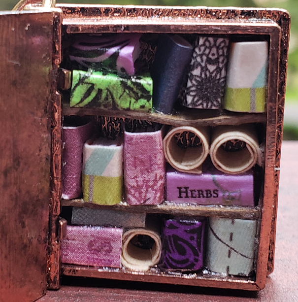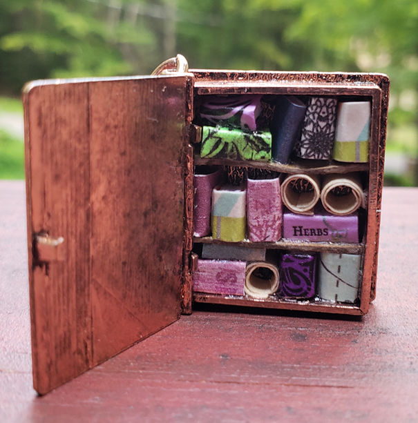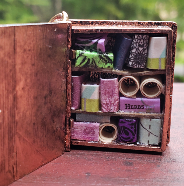 A miniature library hidden away inside of a book-shaped locket. This library contains beautifully patterned handmade books, as well as three parchment scrolls.