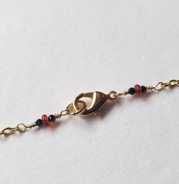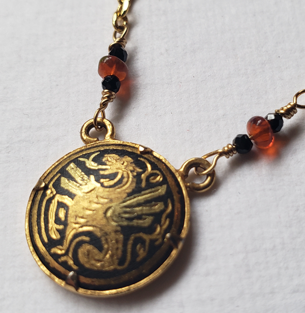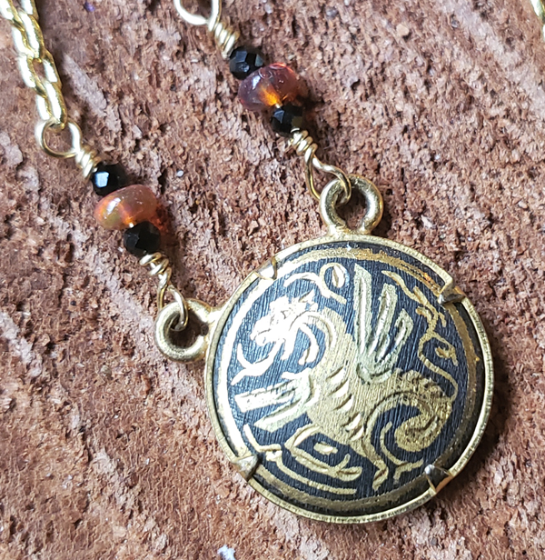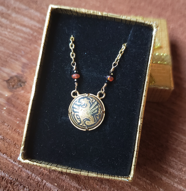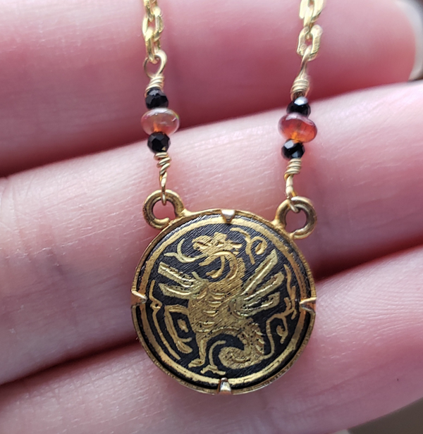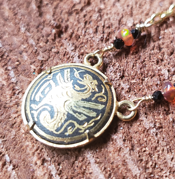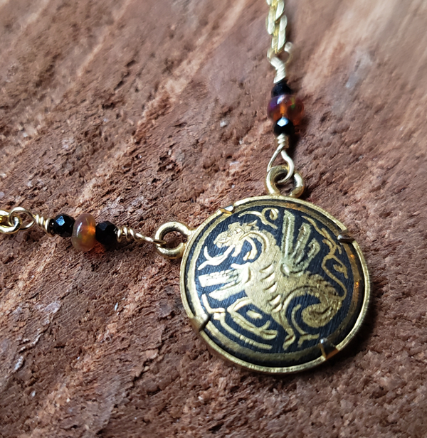 This dainty necklace is made of up of a vintage damascene medallion featuring a dragon set between black spinel and opal beads on a gold tone chain.