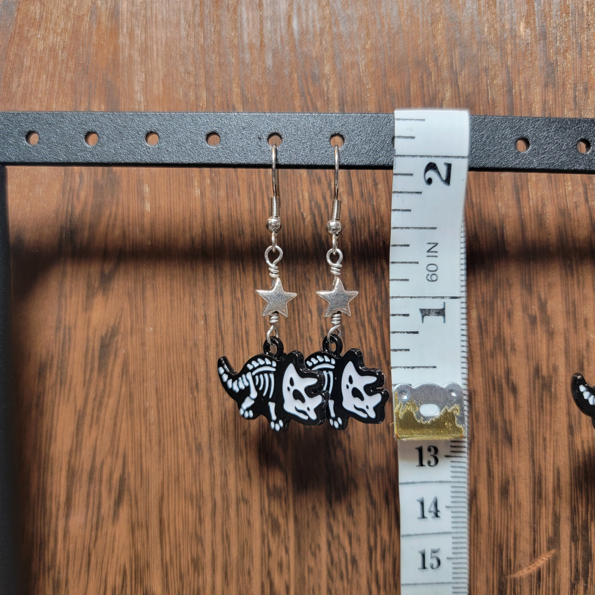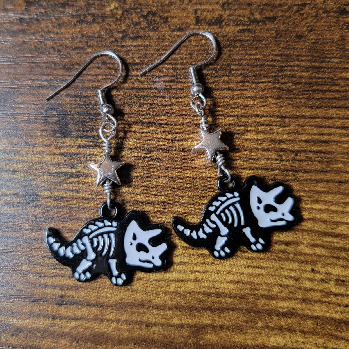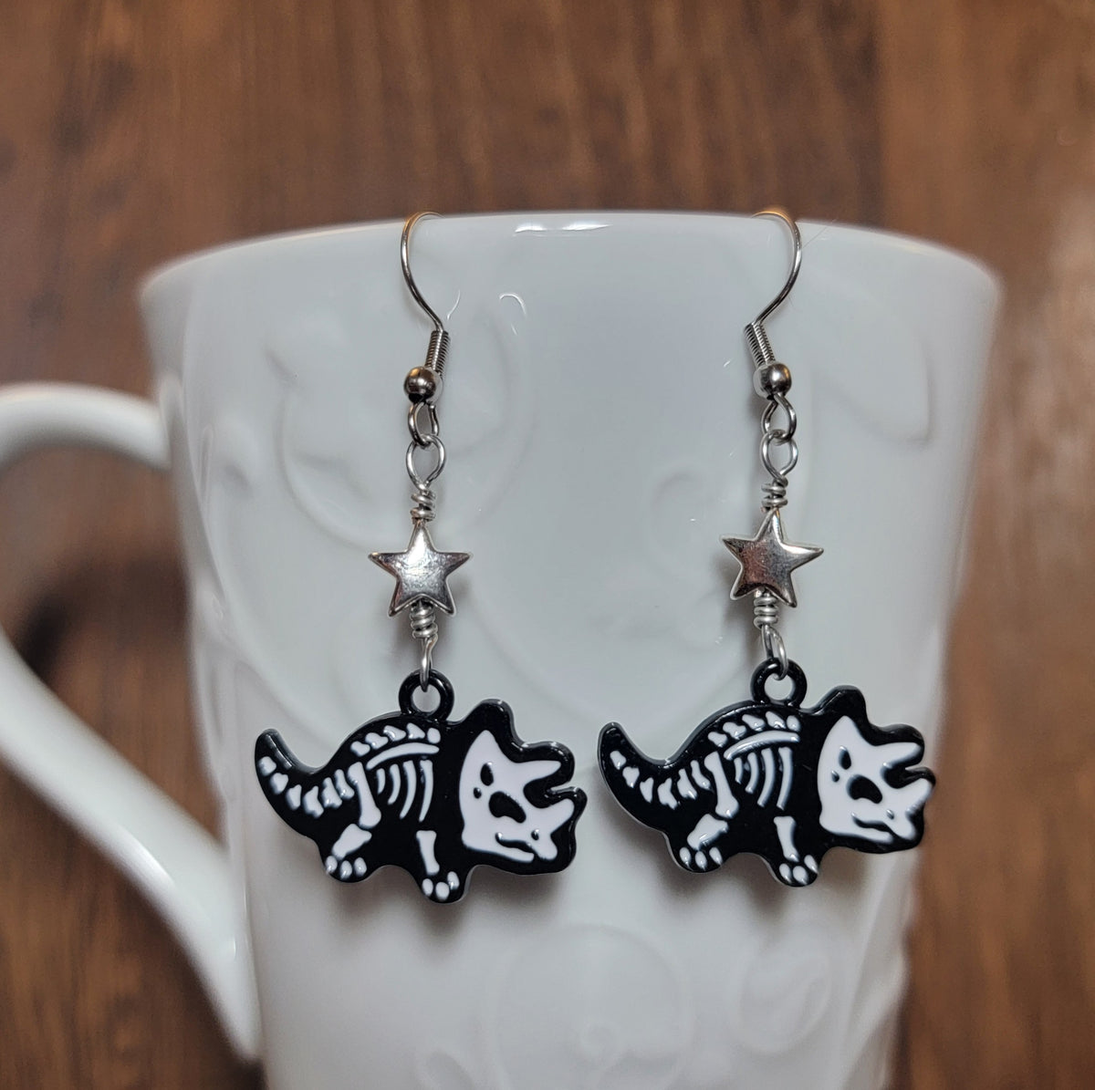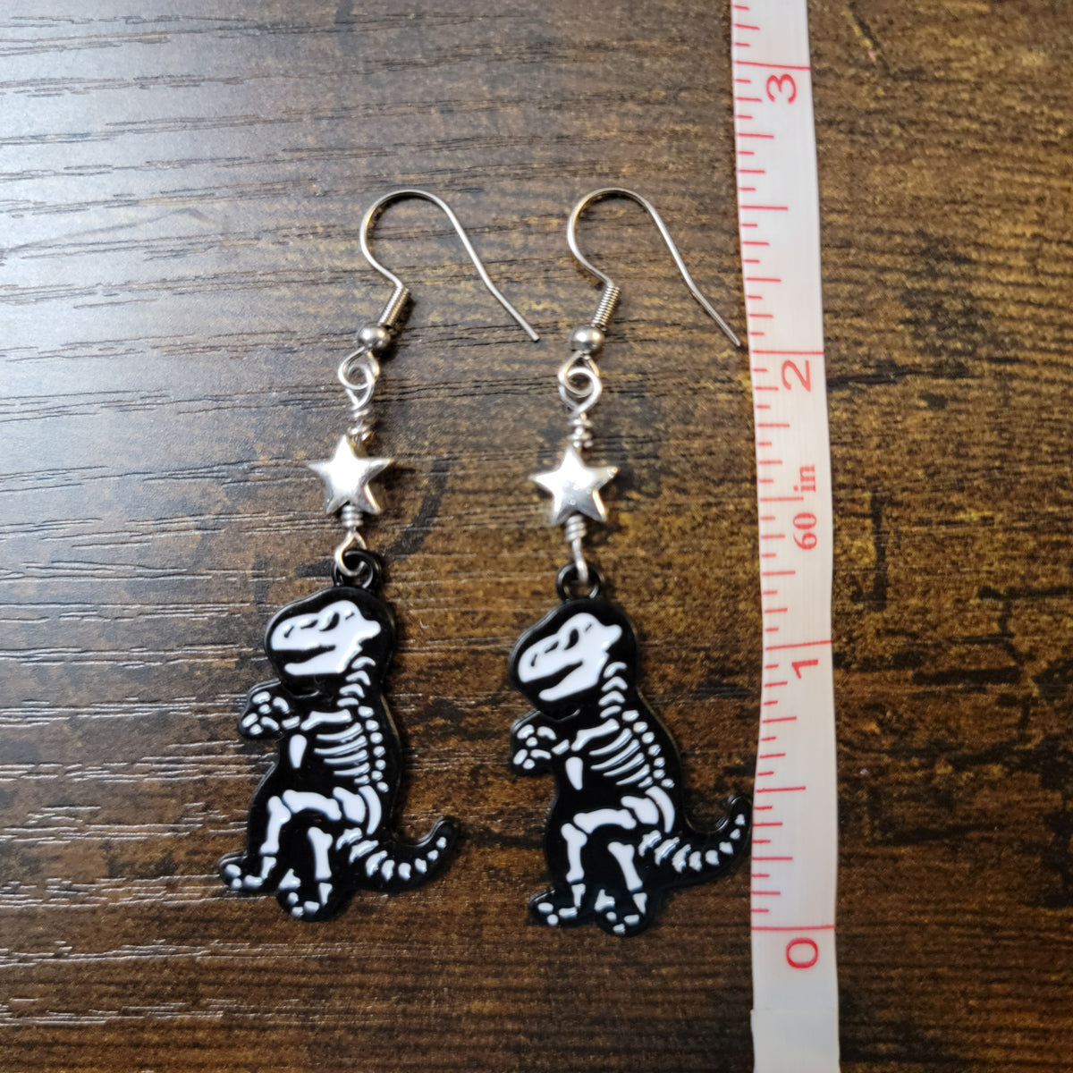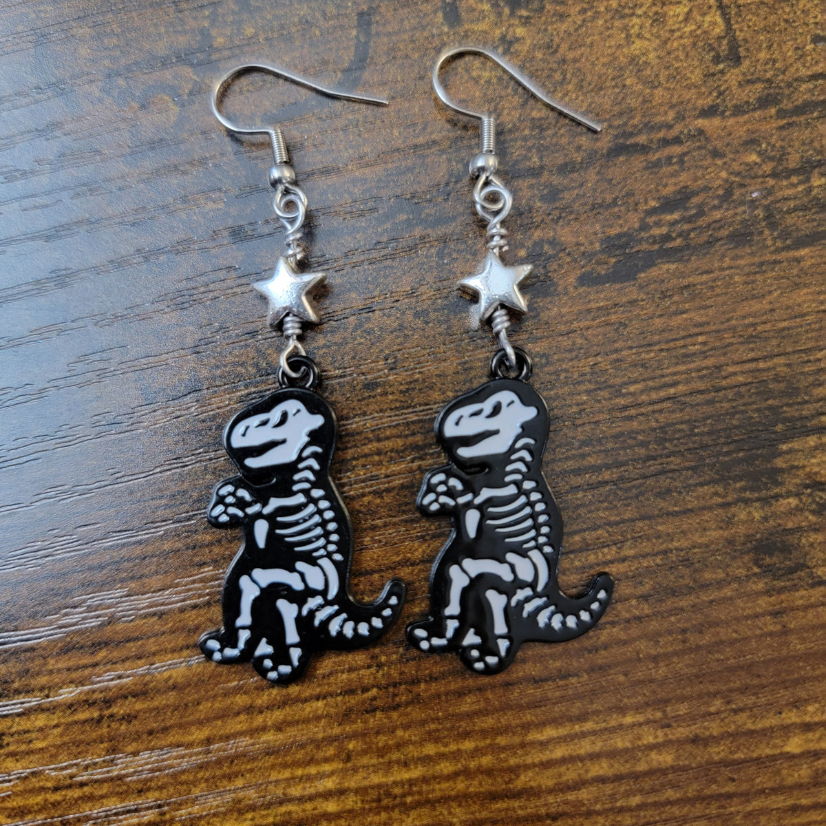 Adorable enamel dinosaur skeleton on an earrings with a shiny silver hematite stars on stainless steel ear wires.