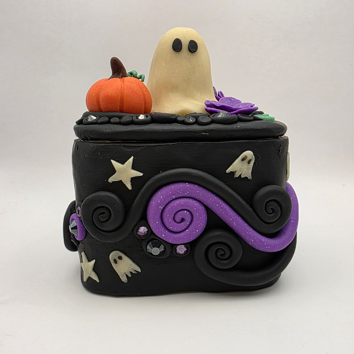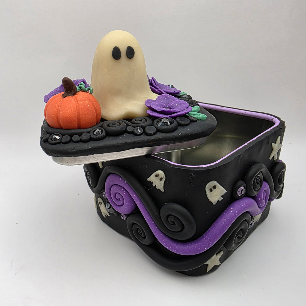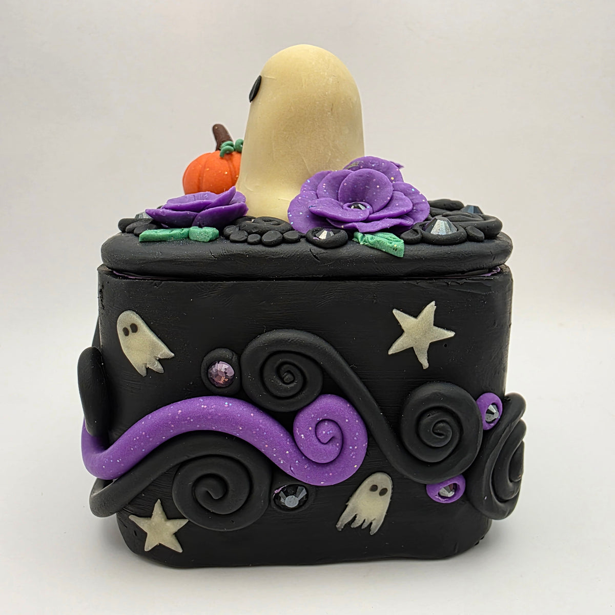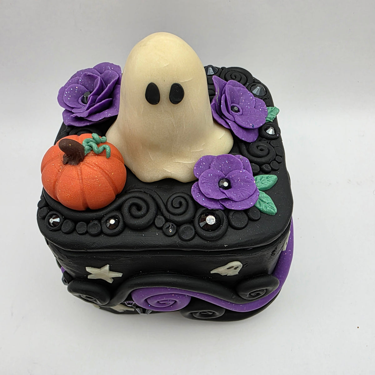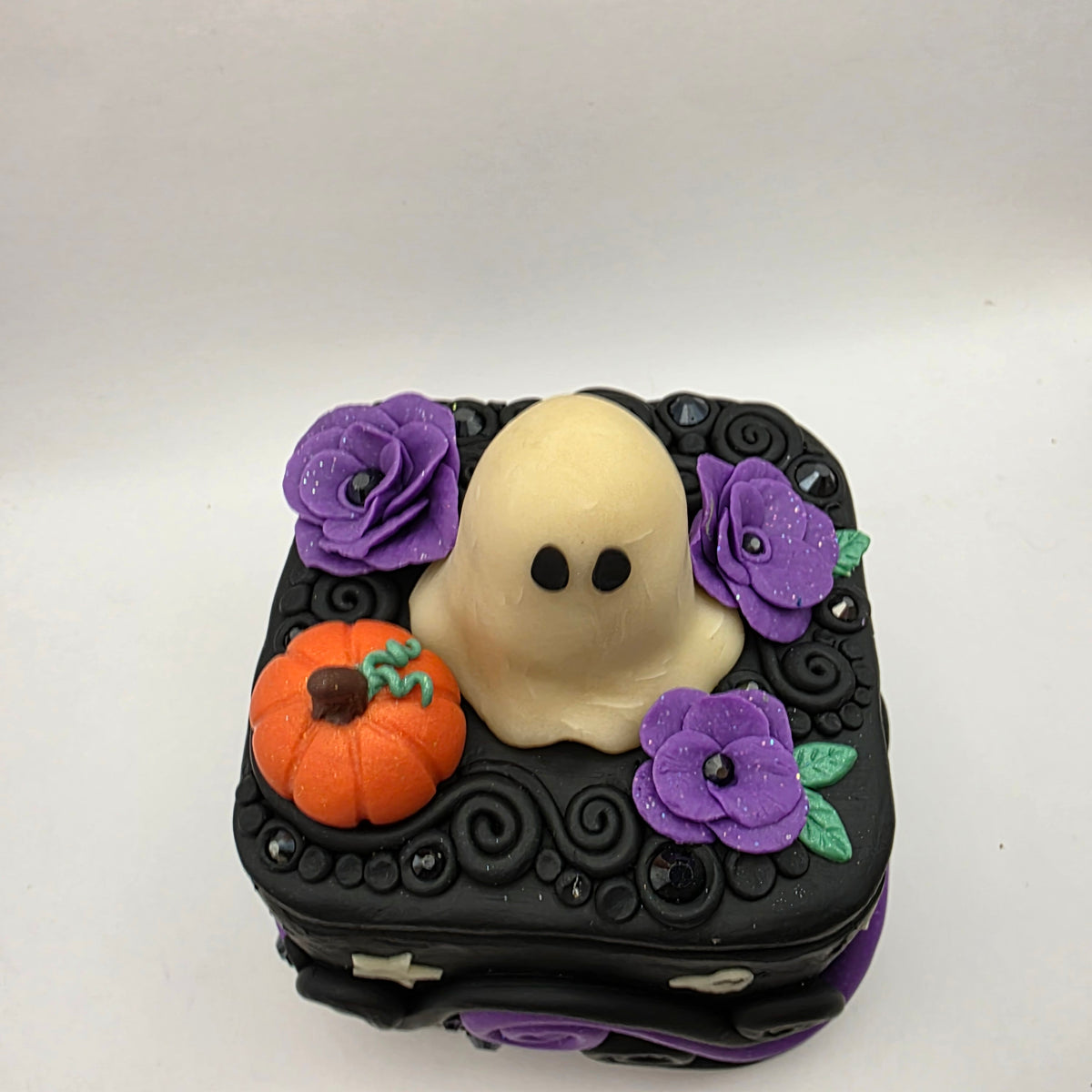 A ghostie trinket box! This ghost has taken up residence on top of a polymer clay box, surrounded by purple flowers and a lovely little pumpkin. Between the flowers and pumpkin, the top is also decorated with rhinestones and swirls of clay.