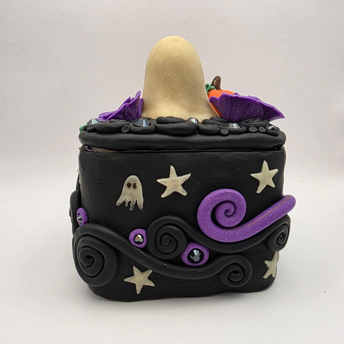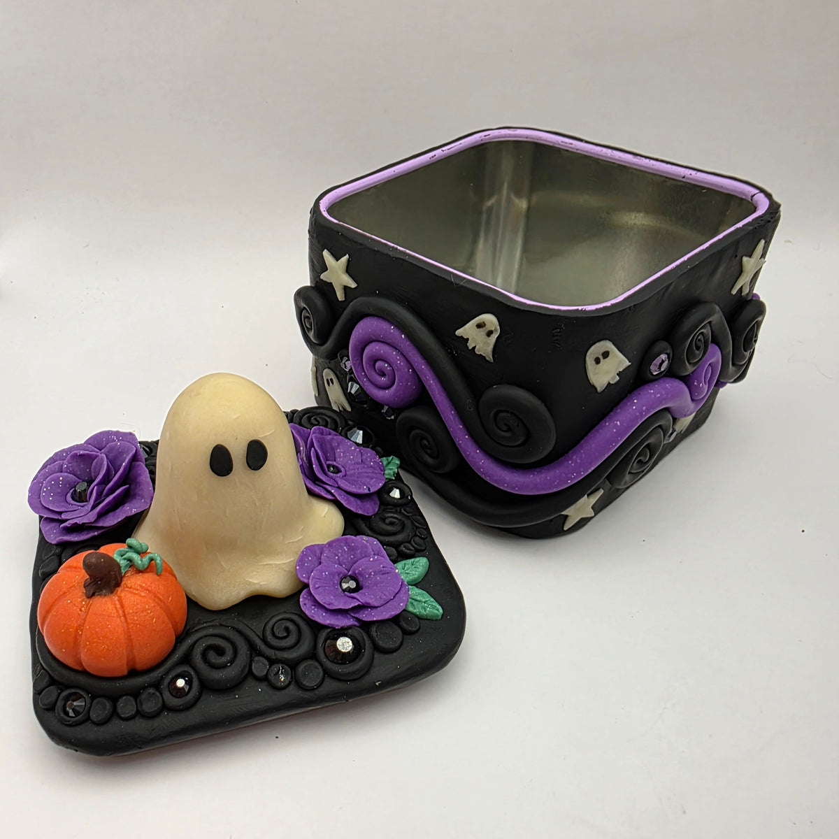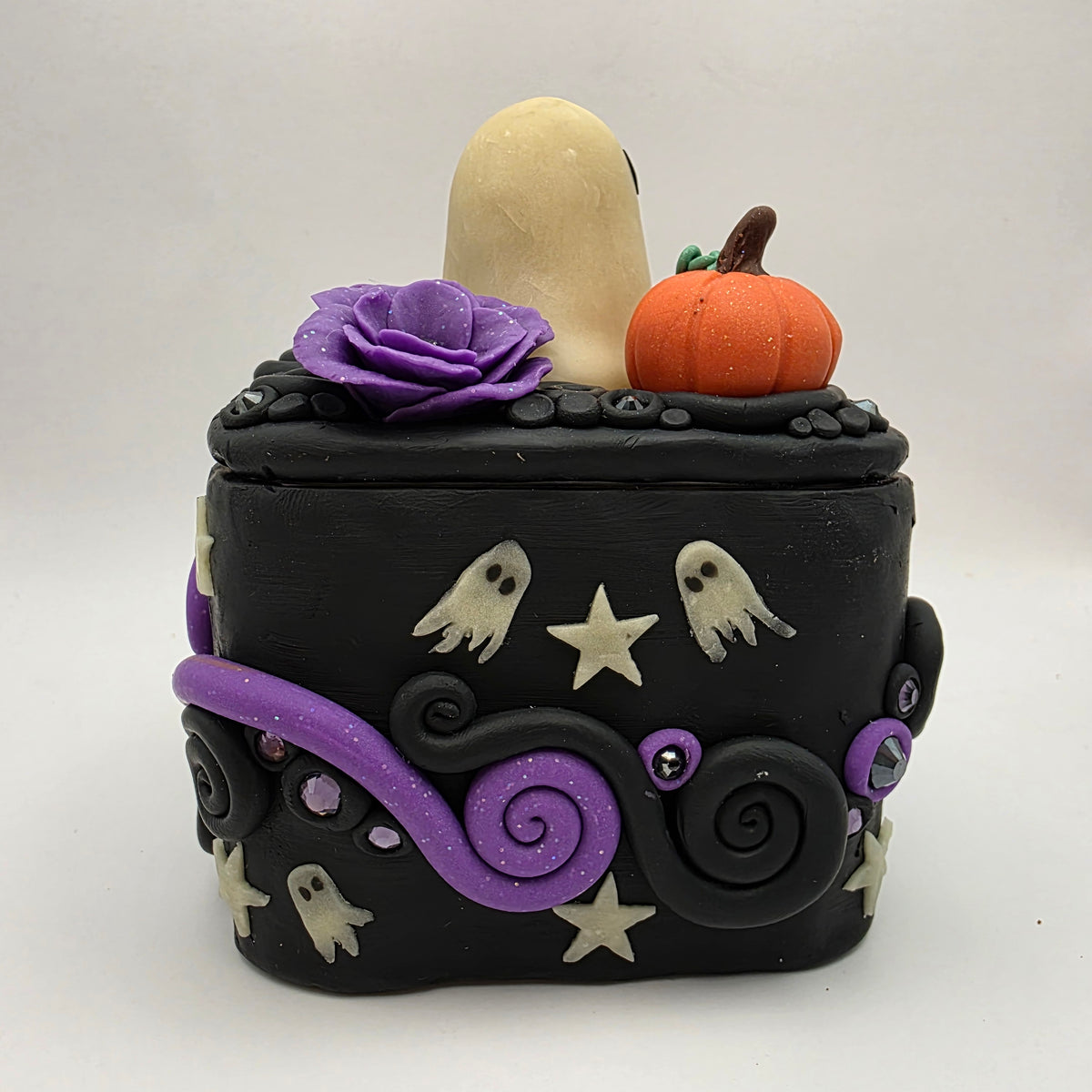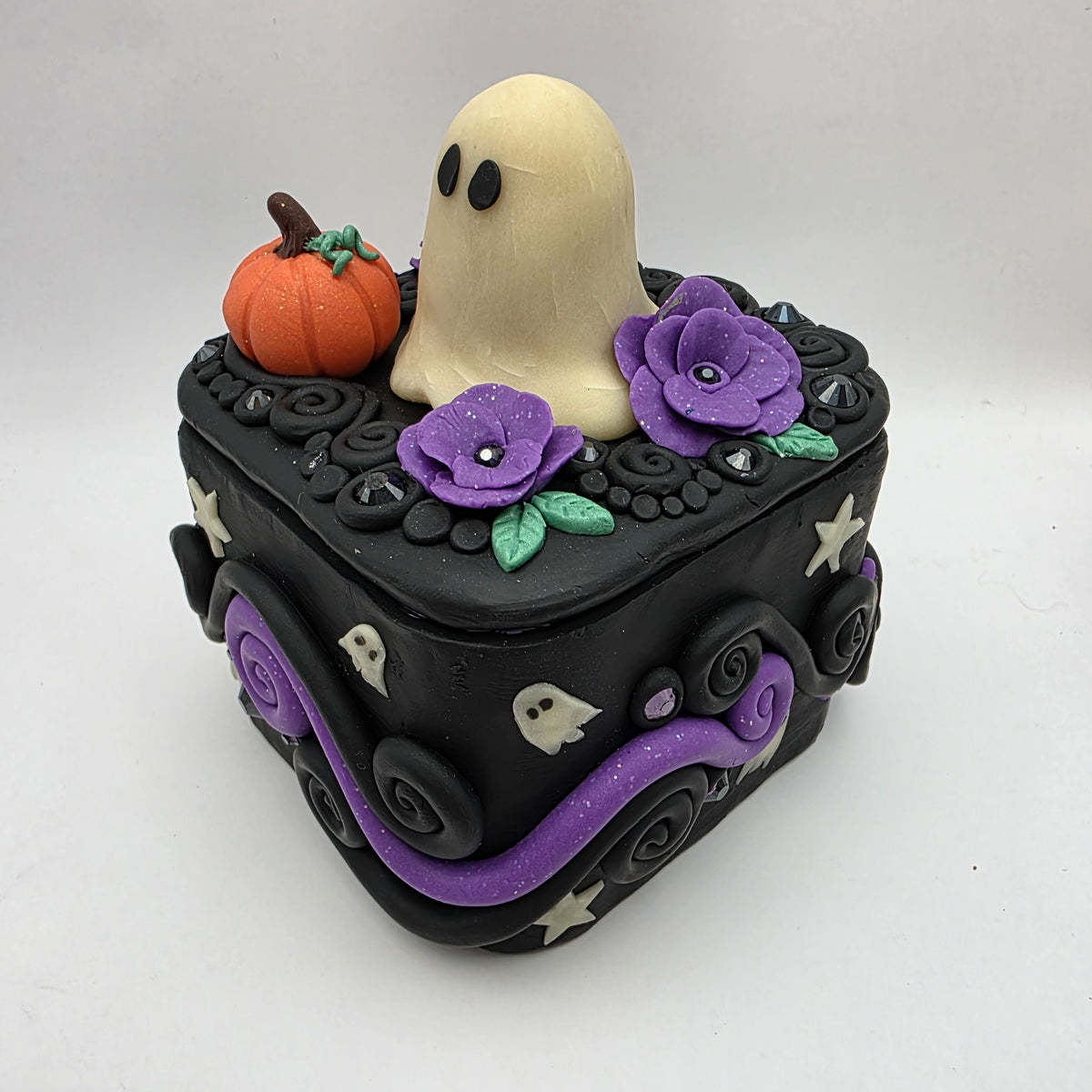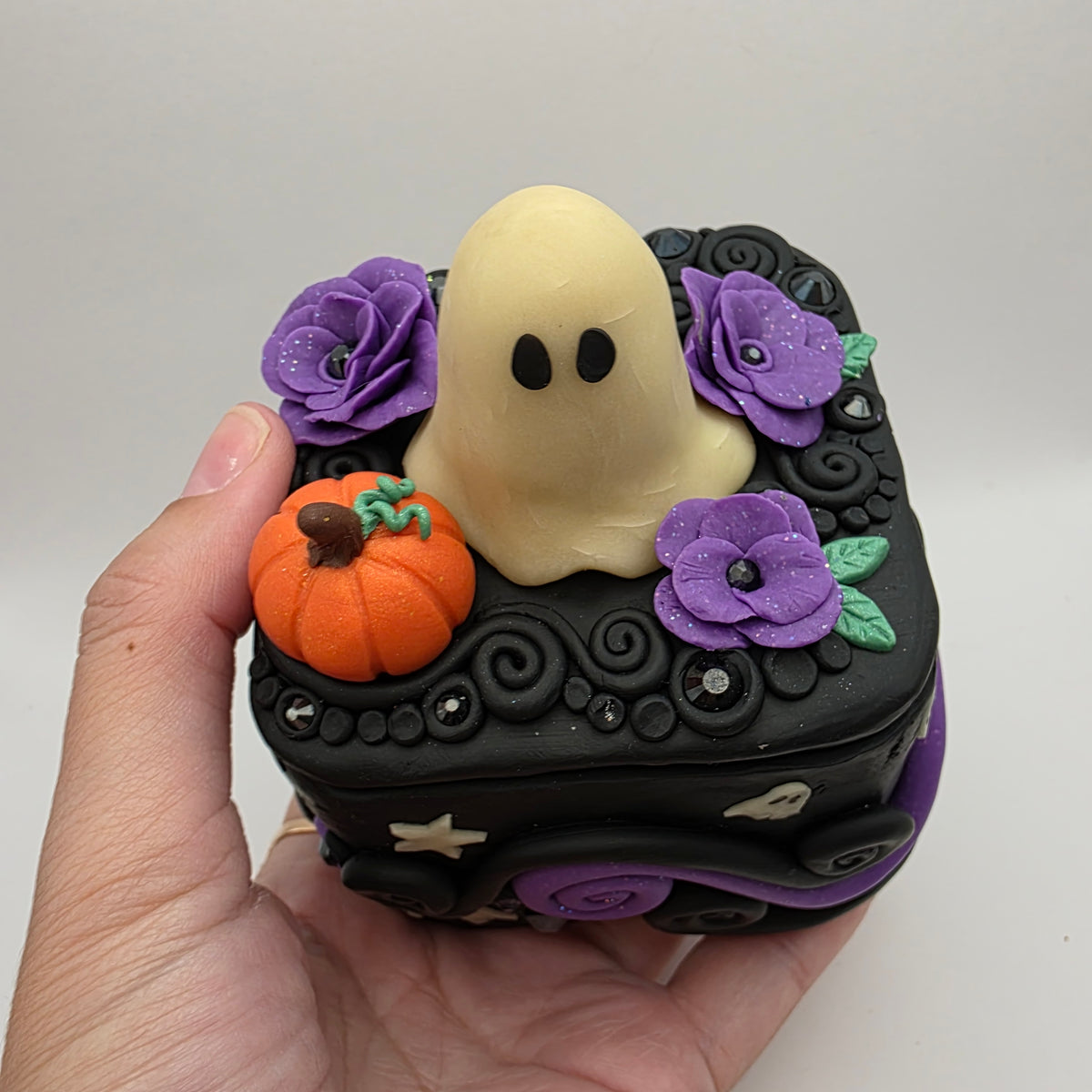 A ghostie trinket box! This ghost has taken up residence on top of a polymer clay box, surrounded by purple flowers and a lovely little pumpkin. Between the flowers and pumpkin, the top is also decorated with rhinestones and swirls of clay.