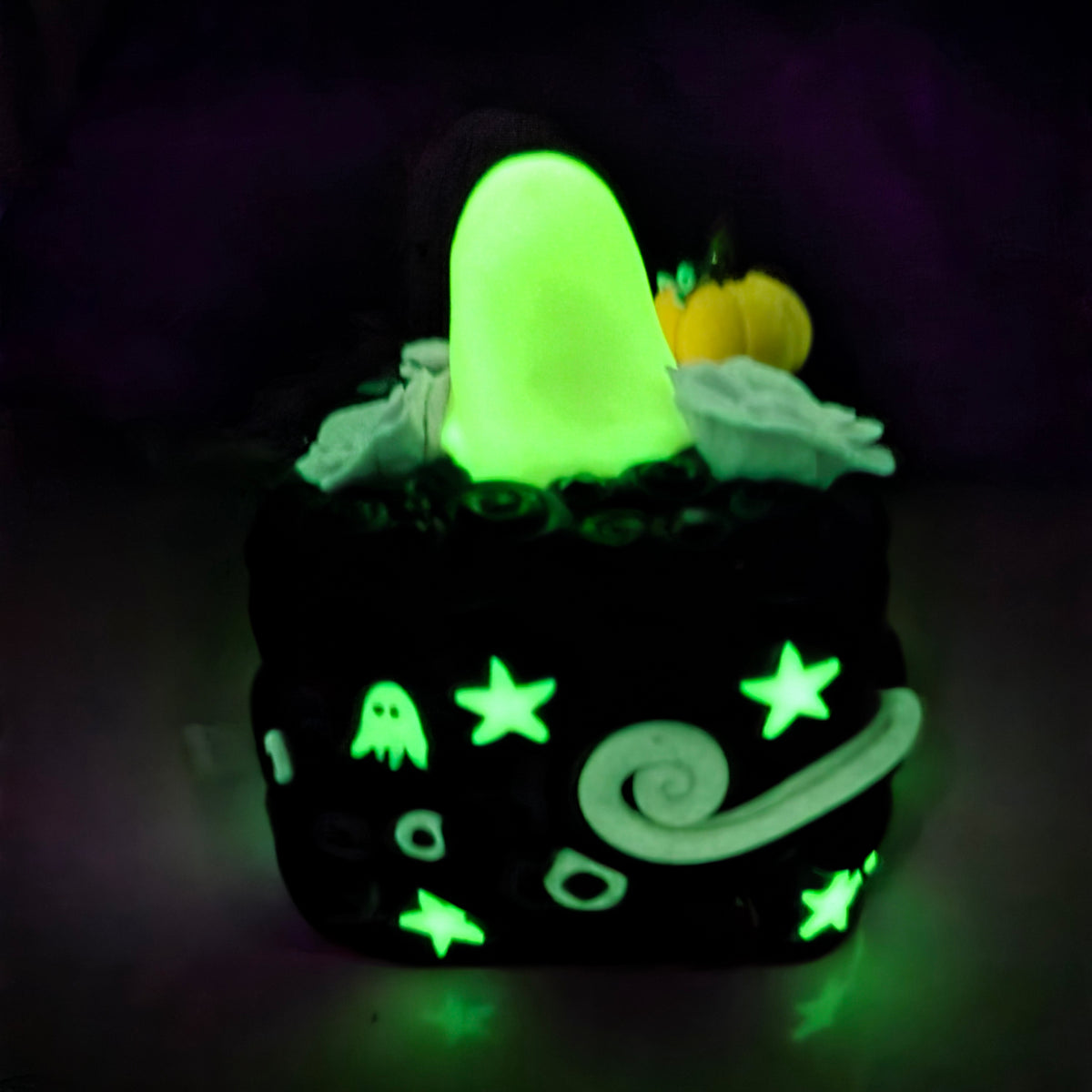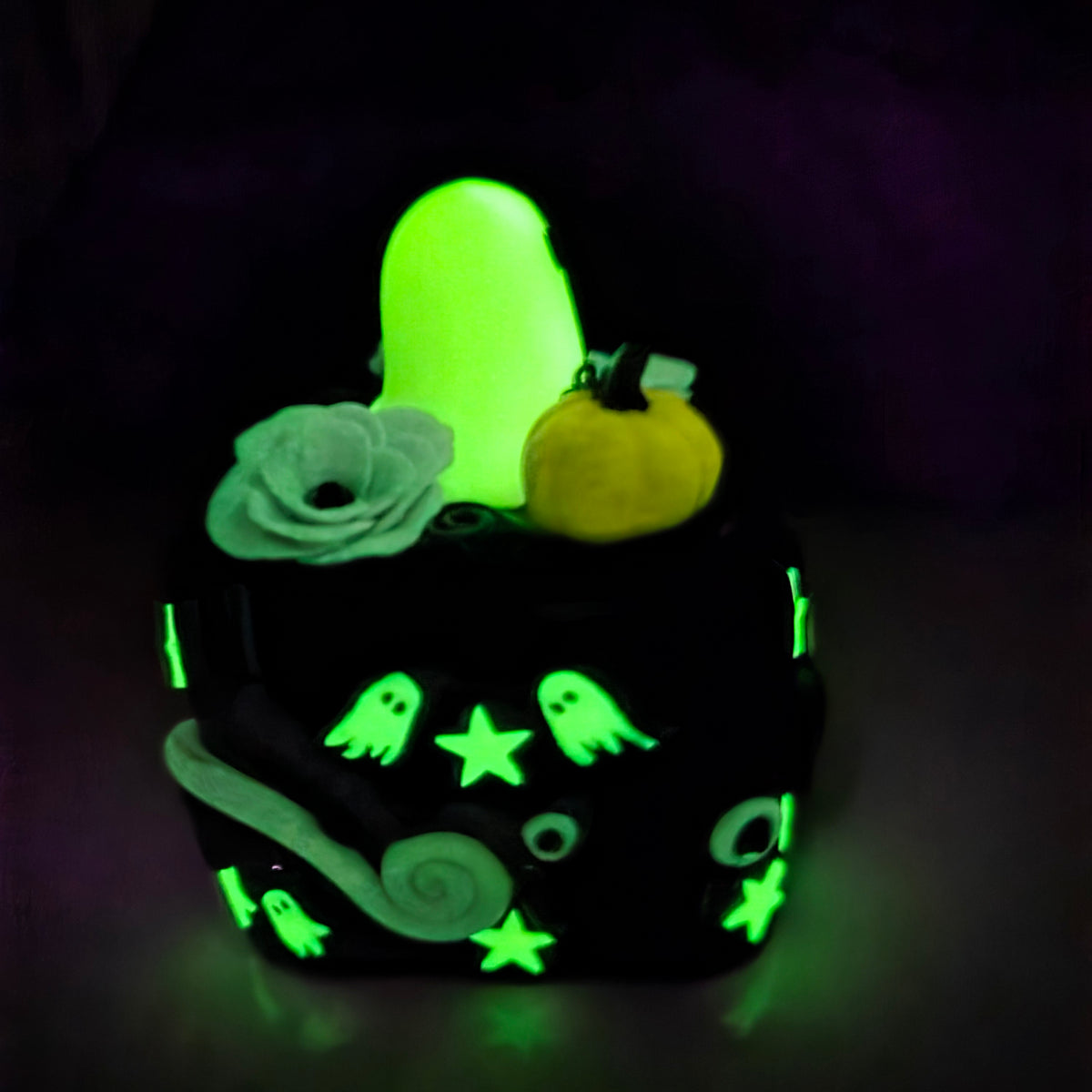 The ghosts, stars, purple swirls, flowers, and pumpkin all glow in the dark! Glowing photos taken after exposure to blacklight.