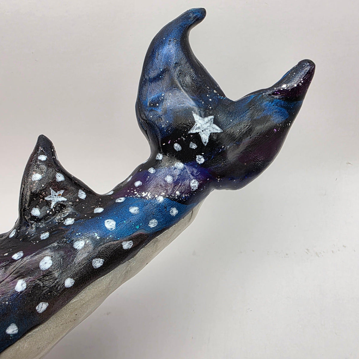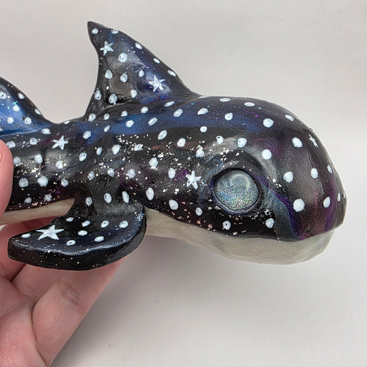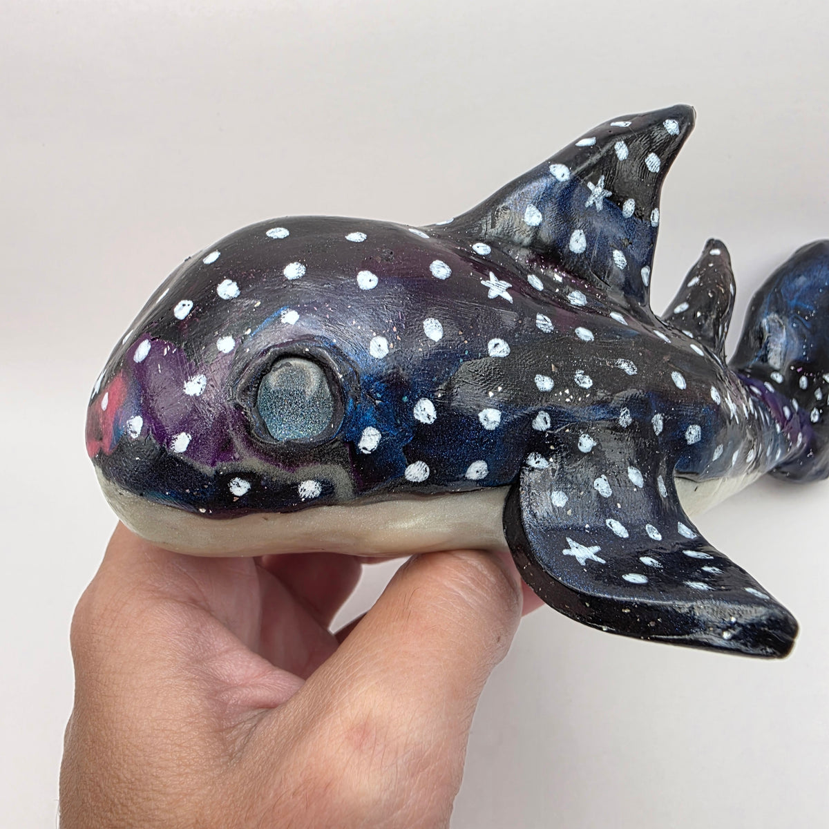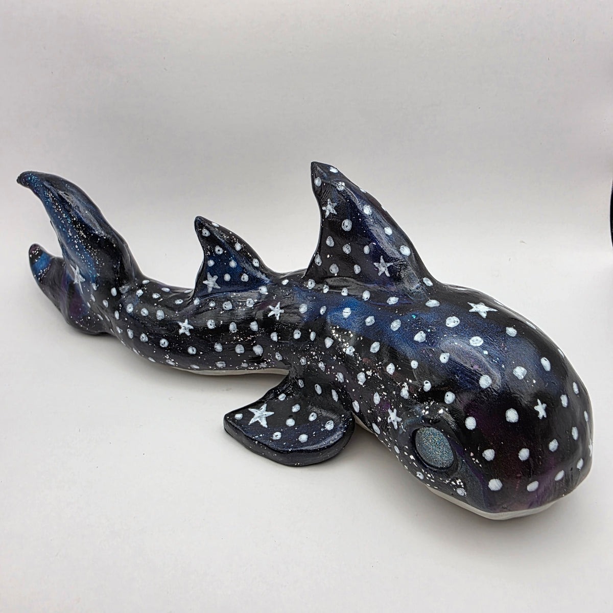 The first of the galaxy whale sharks, covered in white spots and stars. Made with a clay mix that shows bits of blues, purples, and pinks along with a good amount of foil glitter. Stars and spots are painted by hand, and sealed with a gloss glaze. The underside of the shark glows in the dark, and the top of it glows faintly in spots as well. Glowing photos taken after exposure to blacklight.