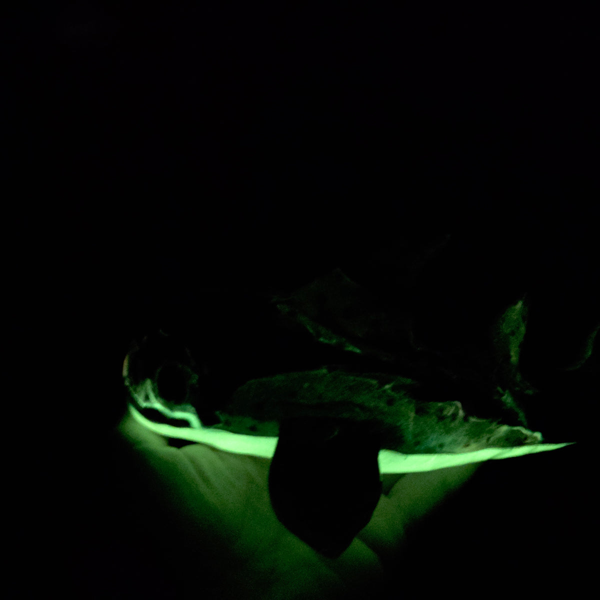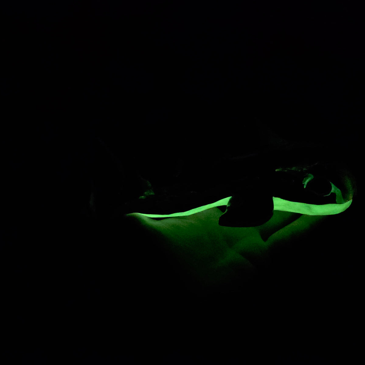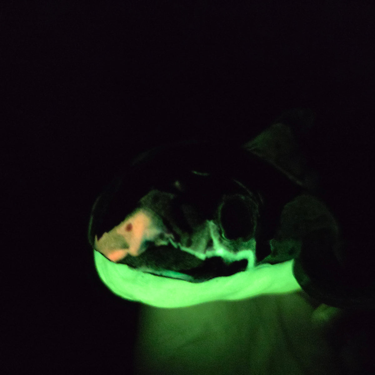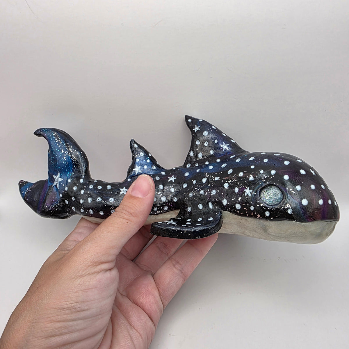 The first of the galaxy whale sharks, covered in white spots and stars. Made with a clay mix that shows bits of blues, purples, and pinks along with a good amount of foil glitter. Stars and spots are painted by hand, and sealed with a gloss glaze. The underside of the shark glows in the dark, and the top of it glows faintly in spots as well. Glowing photos taken after exposure to blacklight.