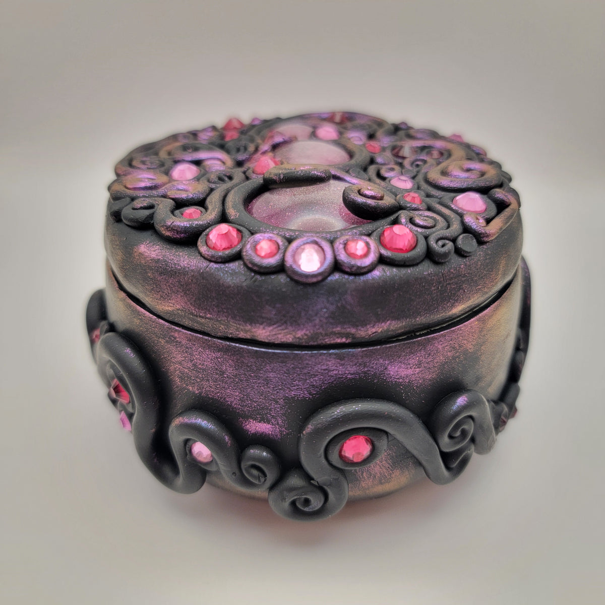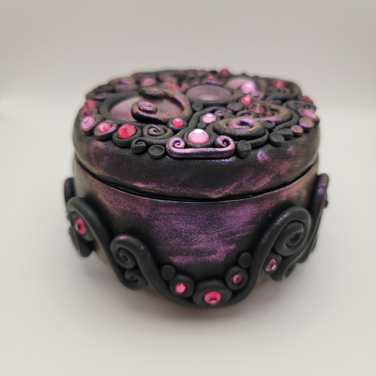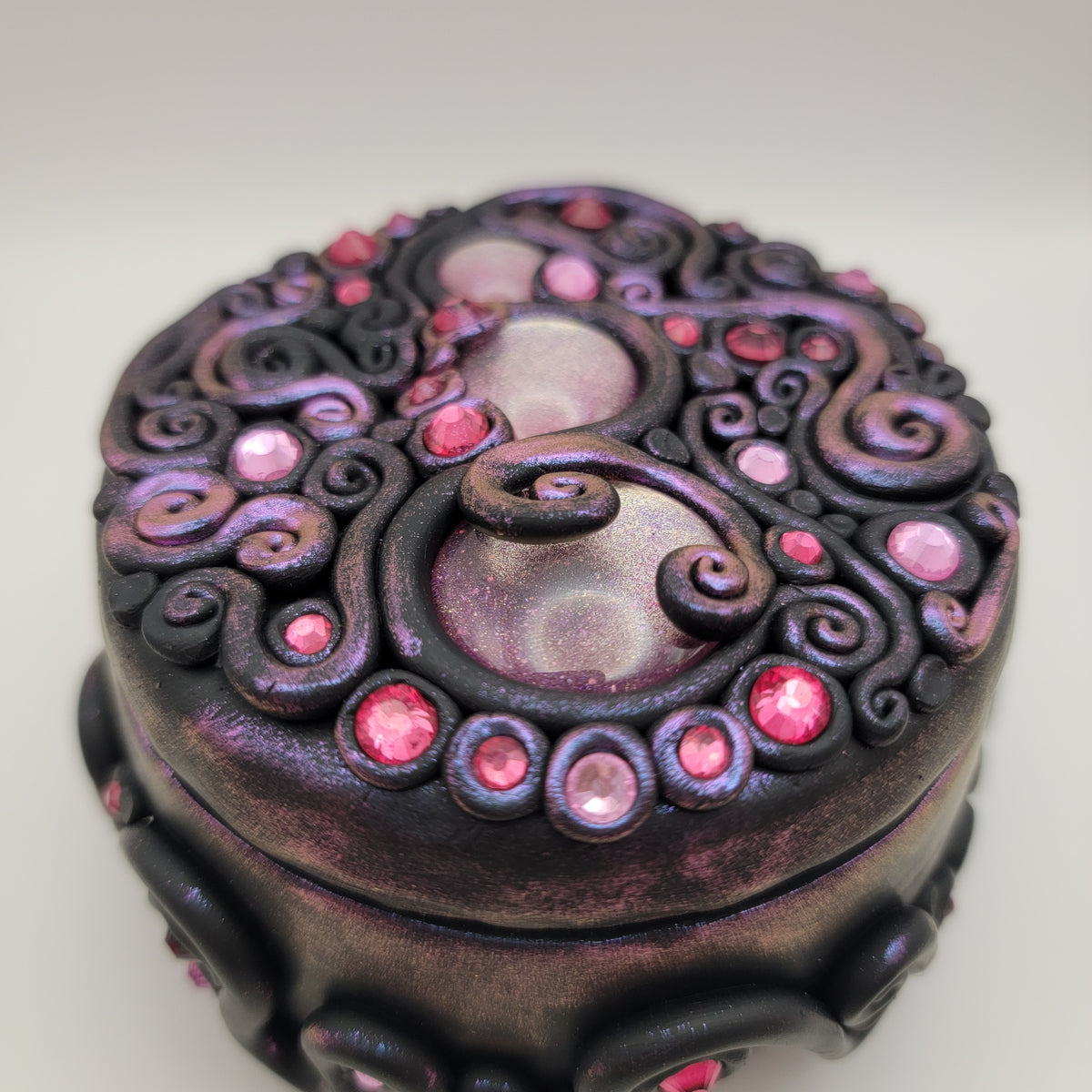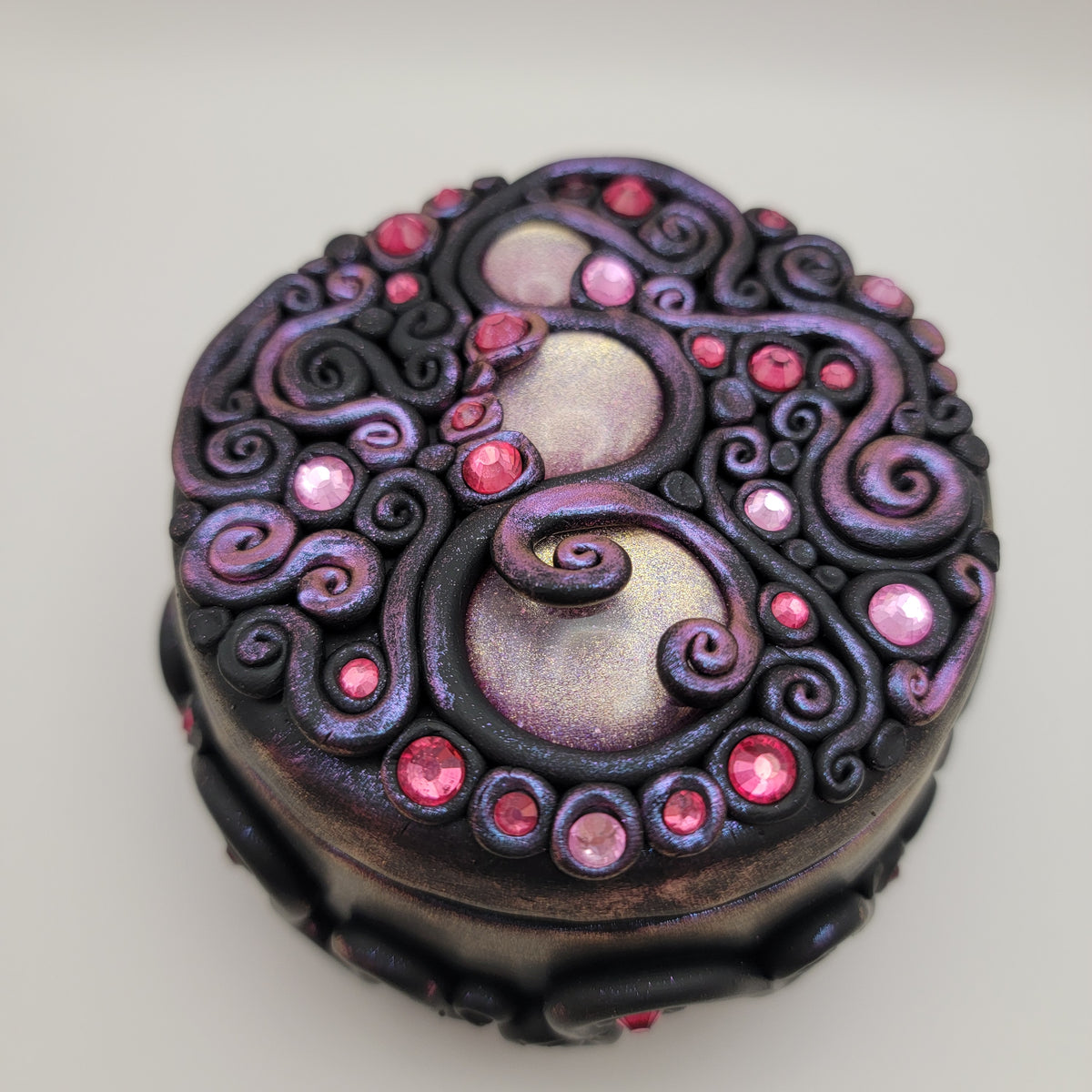 This polymer clay trinket box features three pale pink painted glass cabochons surrounded by swirls and pink rhinestones in two shades of pink. Brushed with a shimmering chameleon powder, it gives a dramatic contrast from the pinks and the base of black clay.