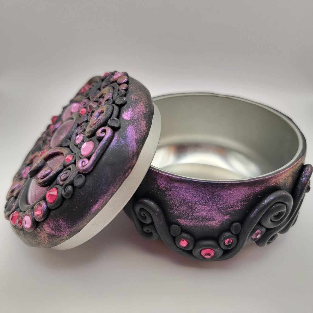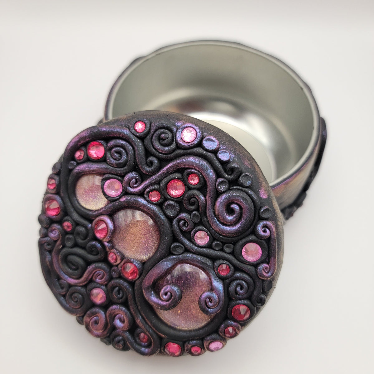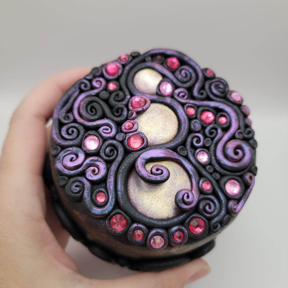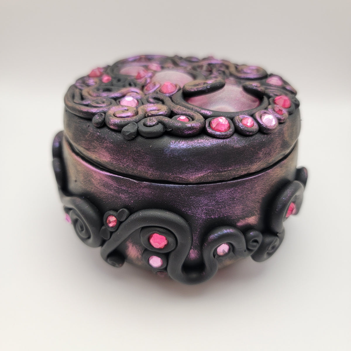 This polymer clay trinket box features three pale pink painted glass cabochons surrounded by swirls and pink rhinestones in two shades of pink. Brushed with a shimmering chameleon powder, it gives a dramatic contrast from the pinks and the base of black clay.
