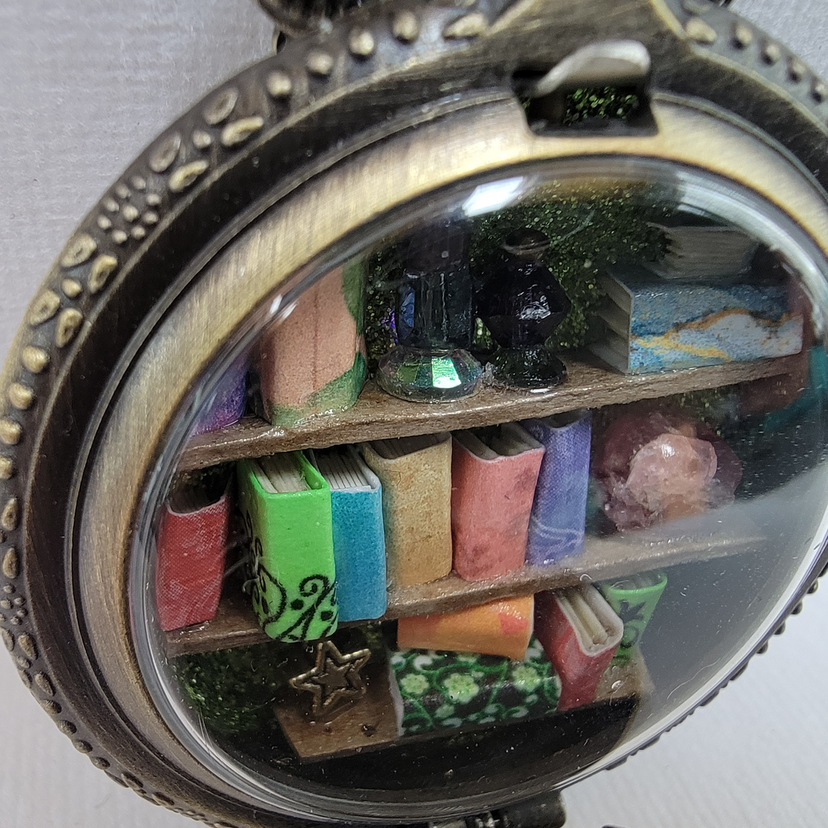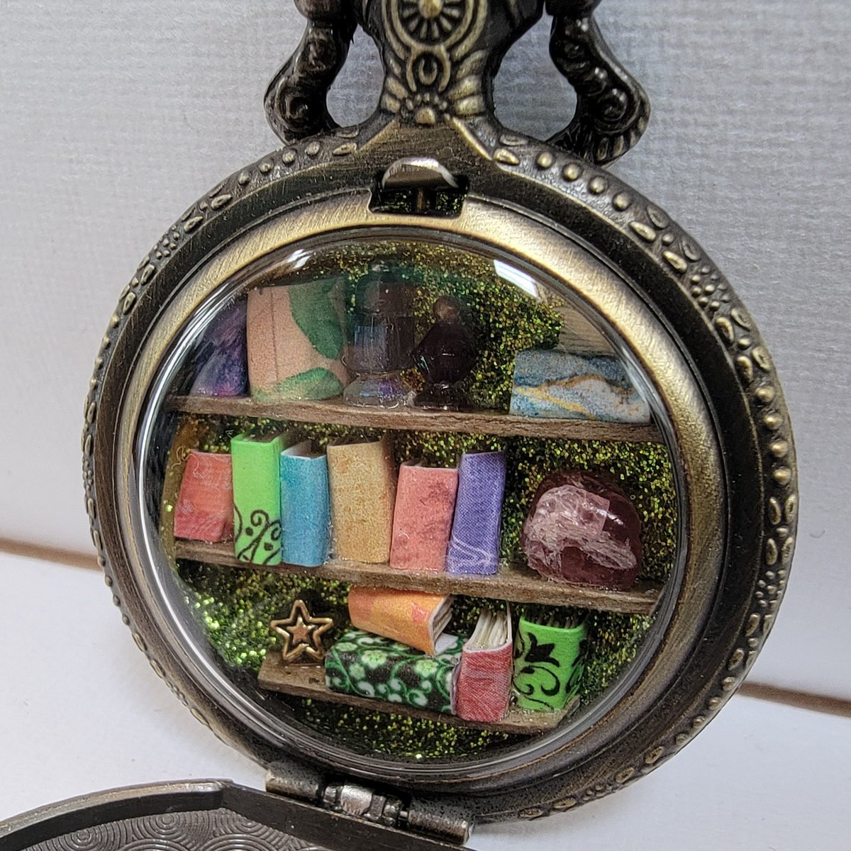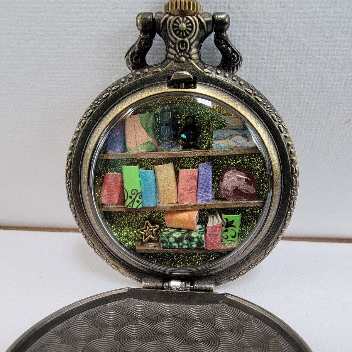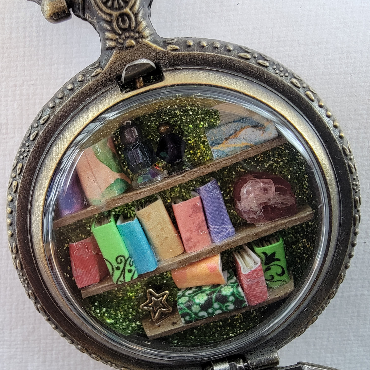 A miniature library hidden away inside of a beautiful pocket watch case. This magical library has a beautifully patterned books, a piece of spinel, a star, and two potion bottles set against a green glitter background.