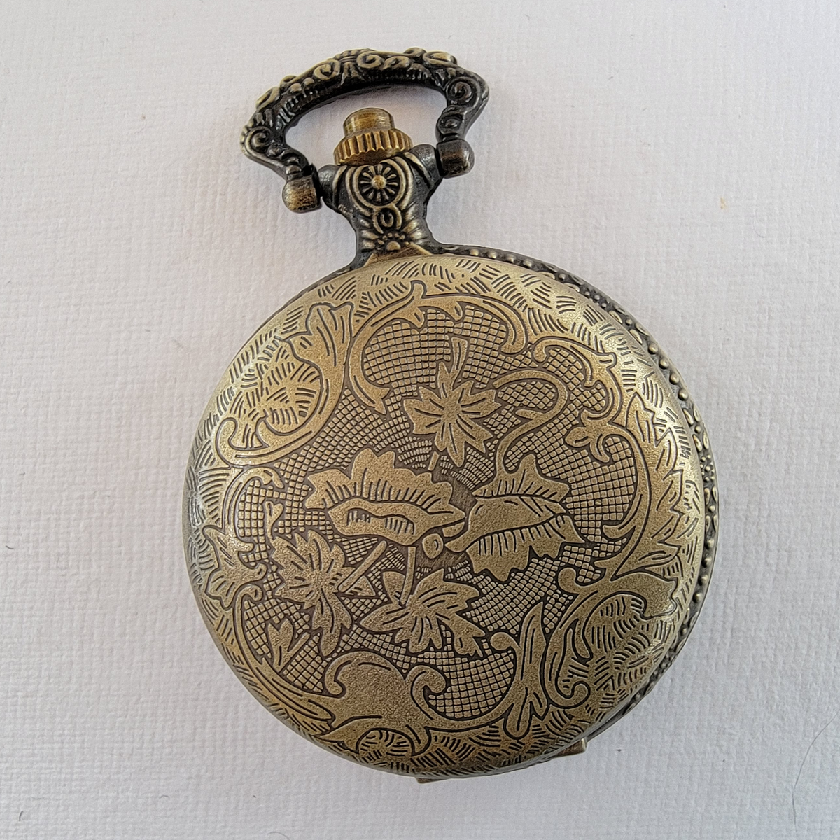 All elements are glued in place and sealed with acrylic varnish. Pocket watch cases have a diameter of 45mm (a bit under 2" see final photo of antique gold pocket watch case for reference). Comes on matching 36 inch chain.
