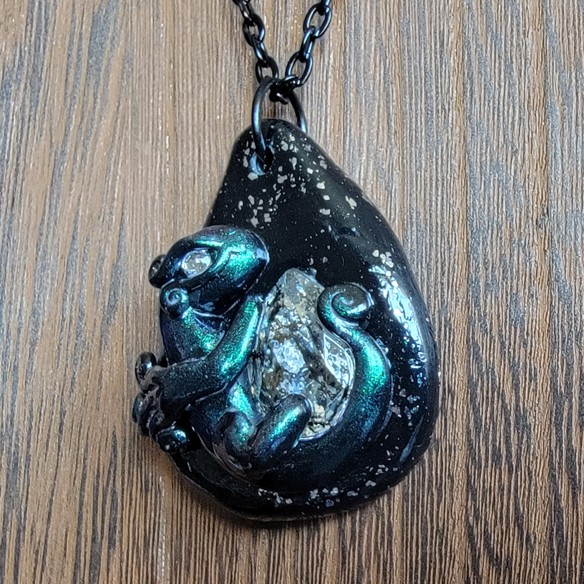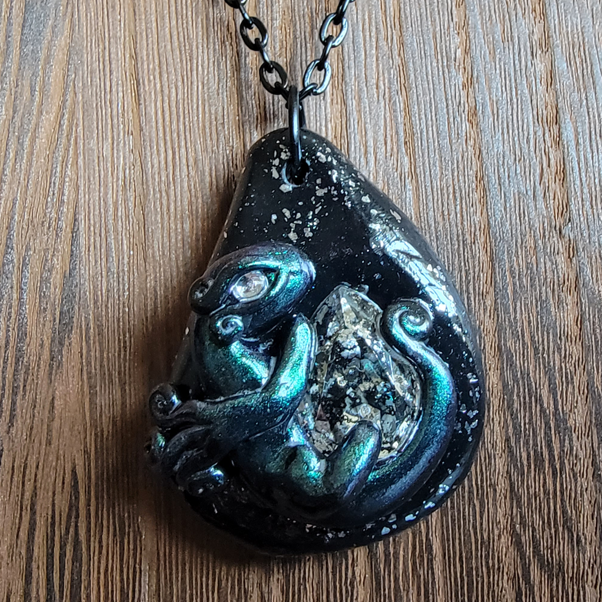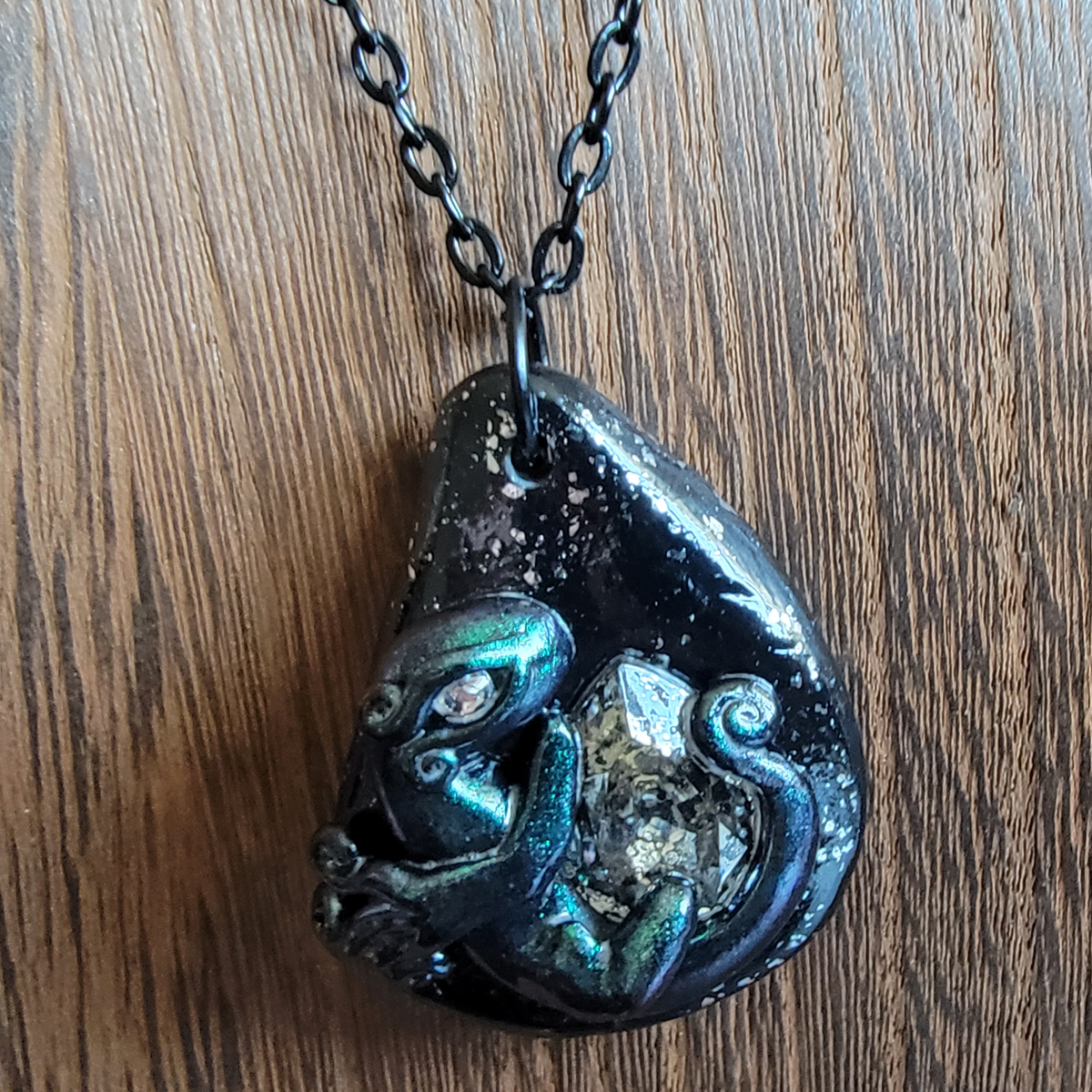 A polymer clay dragon pendant wrapped up around it's treasure. This little dragon has snagged the largest piece of treasure, a 18x13mm teardrop Swarovski crystal.