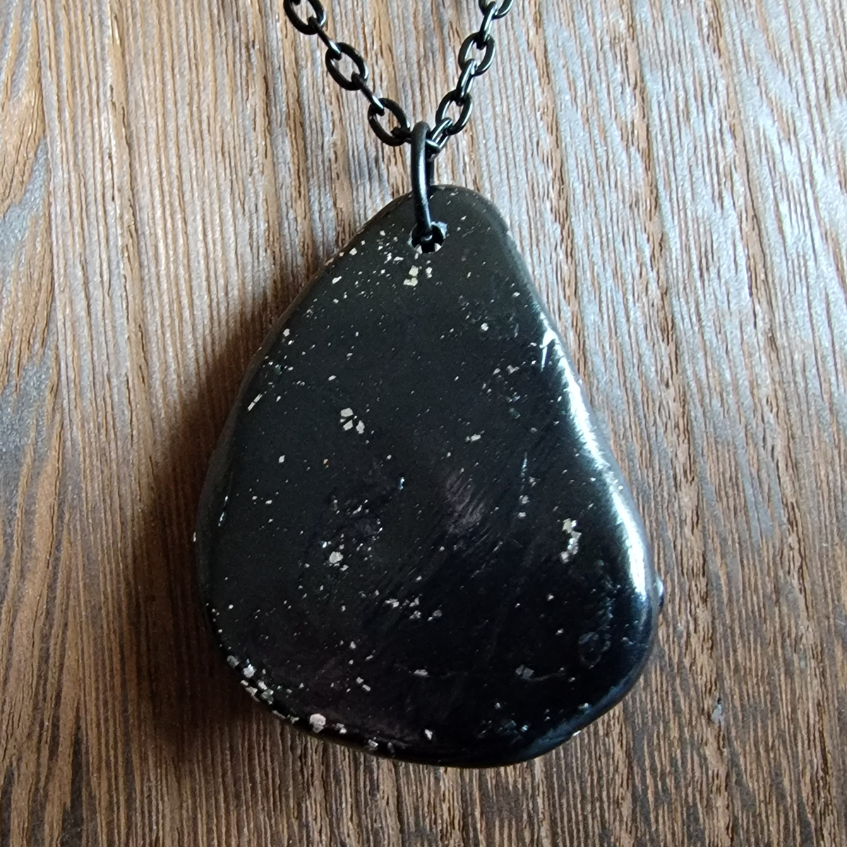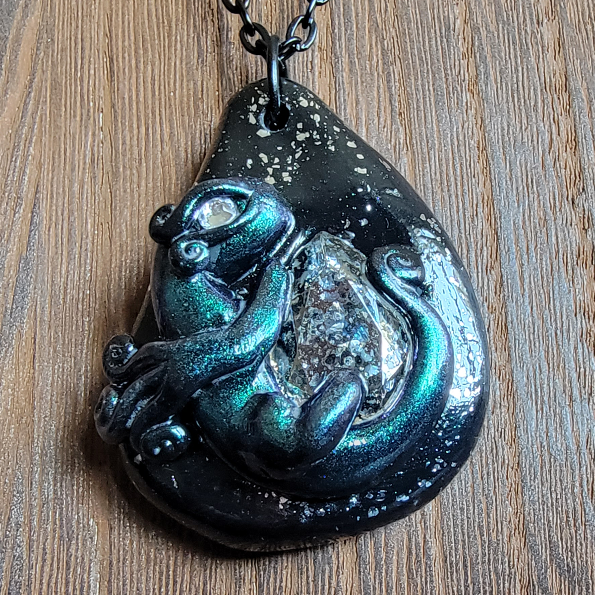 The dragon is hand sculpted and painted with a green mica powder. It has a Preciosa rhinestone eye. The background is black with imitation silver foil flakes. The pendant has been sealed with a glaze for extra shine and protection.