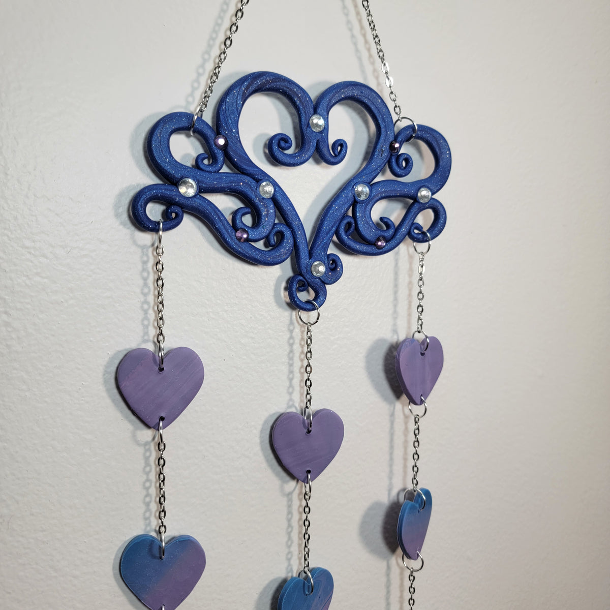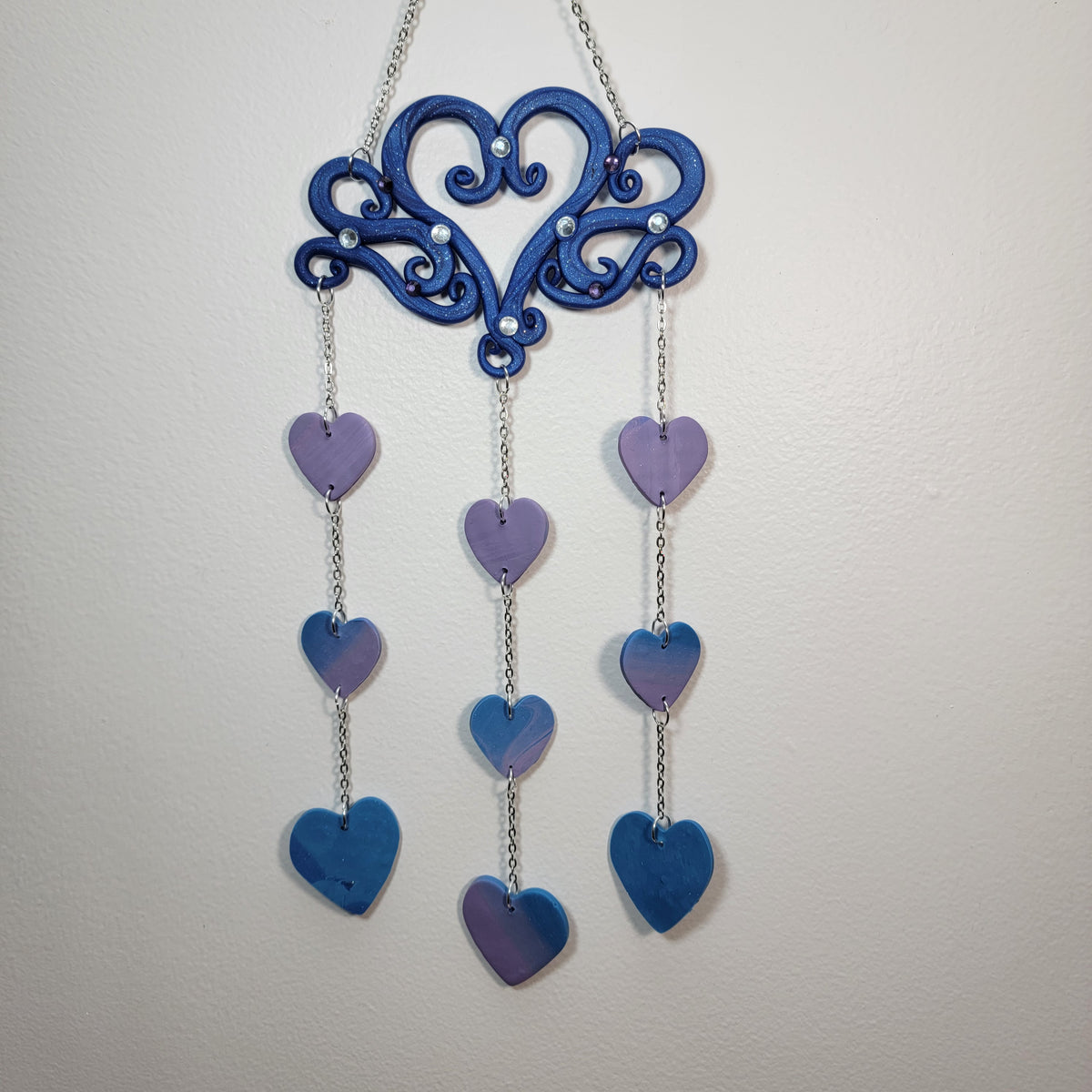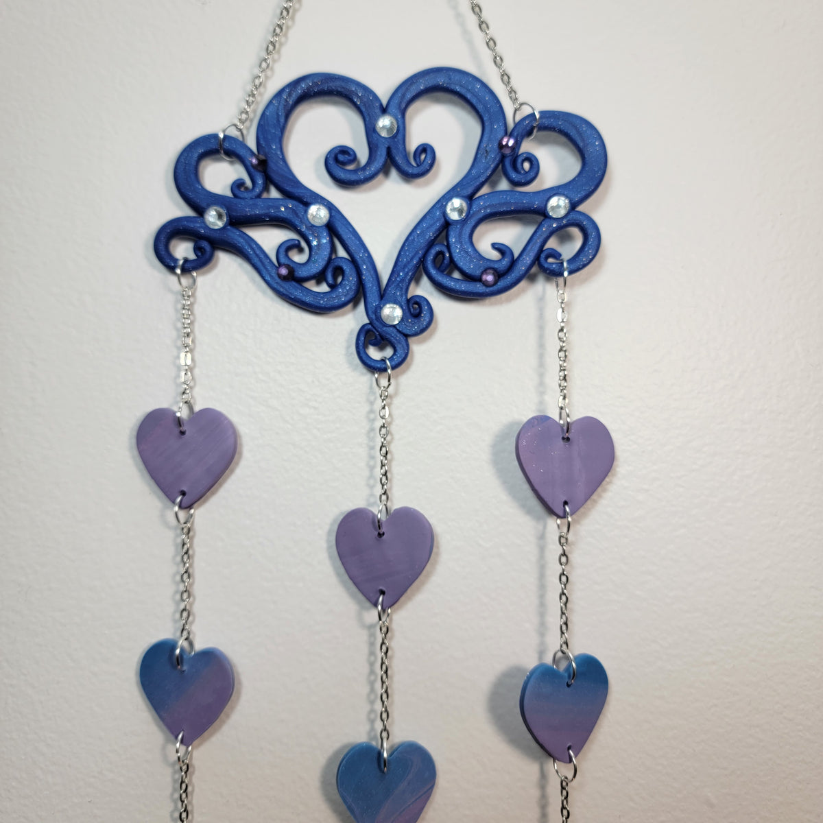 A whimsical heart wall hanging. The top of this one was hand built with swirling lines, centered with a swirly heart, with rhinestones added for extra sparkle added to the blue glitter clay. There are nine hearts hanging from it, ranging from purple to blue.
