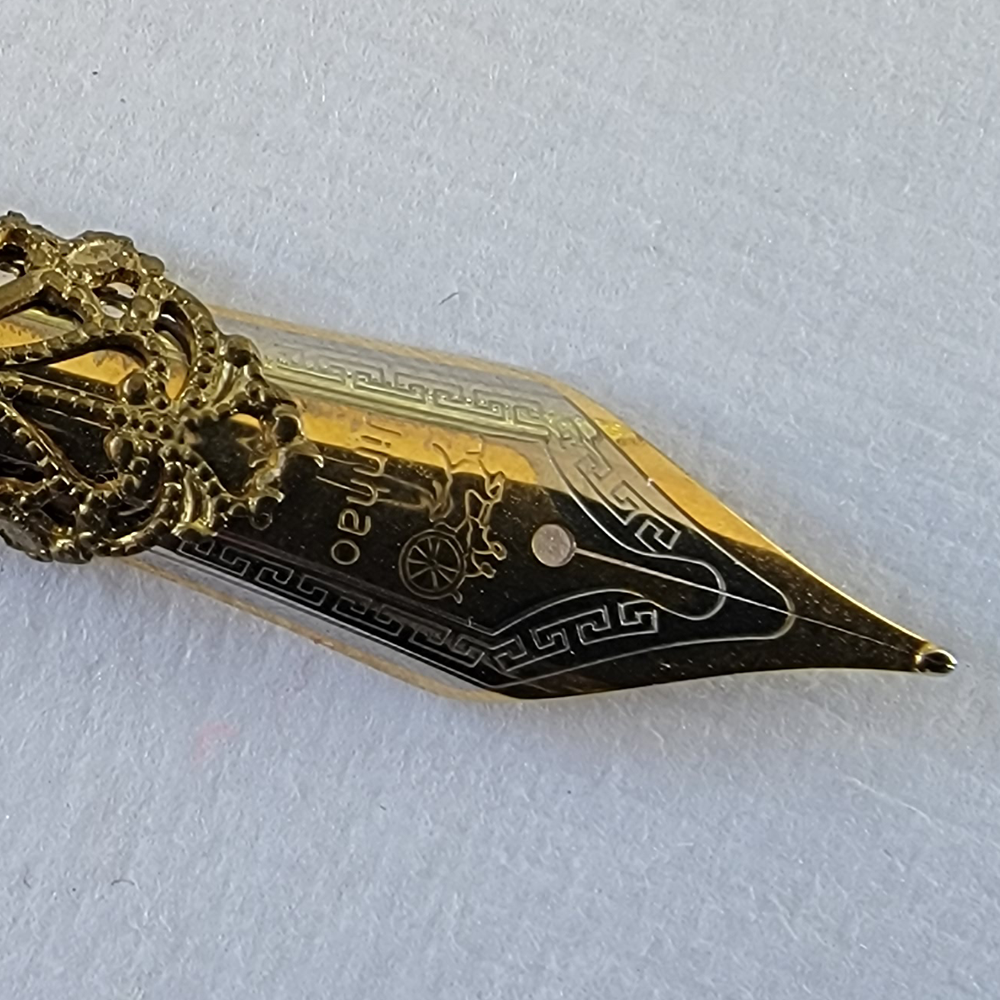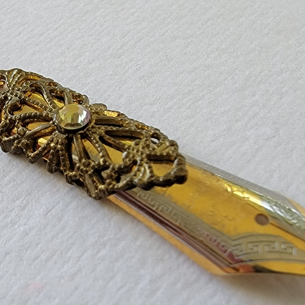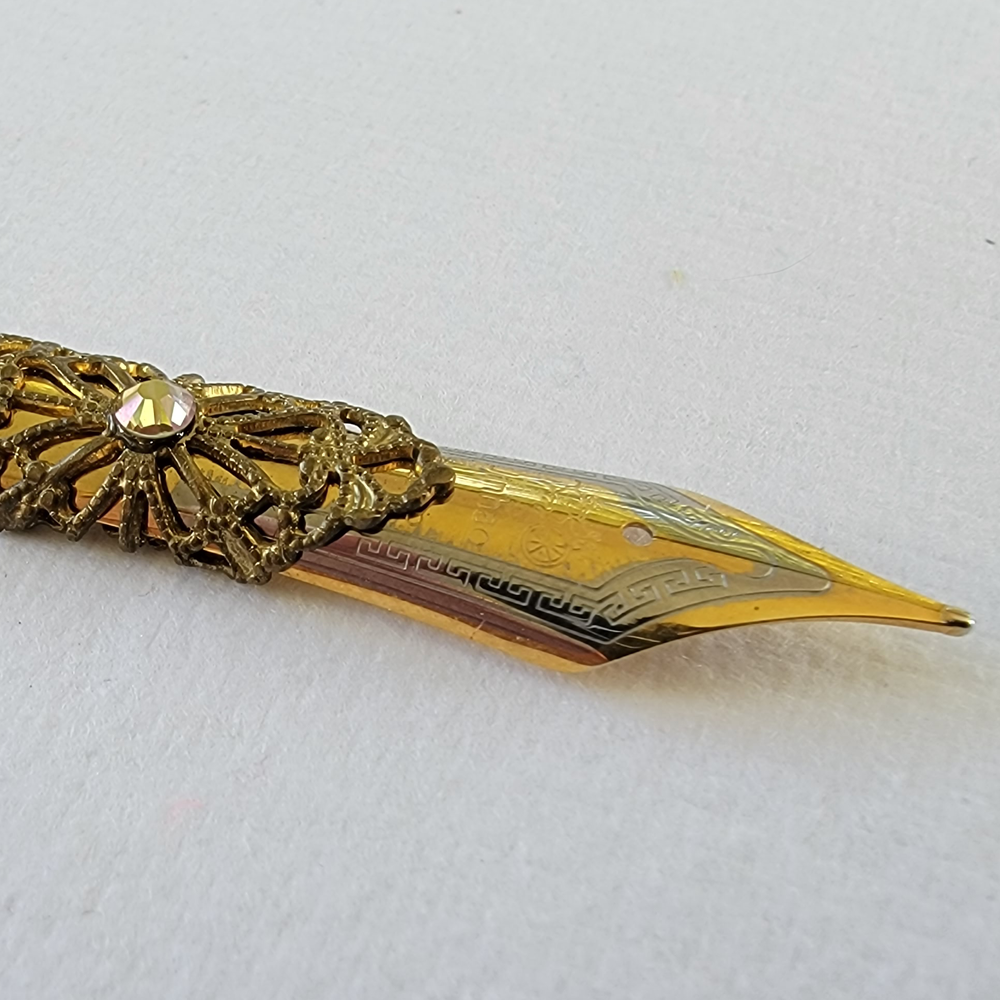 The pen nib is wrapped in an antique gold toned filigree piece and accented with an iridescent rhinestone.  If you look closely you can see the lovely design on this pen nib.