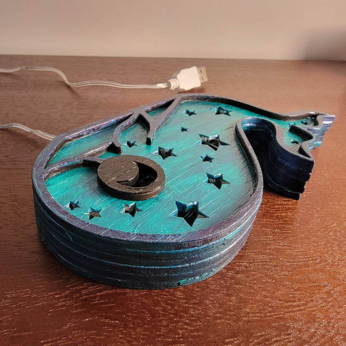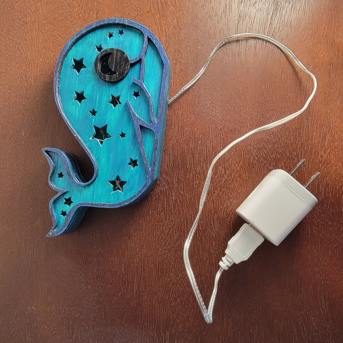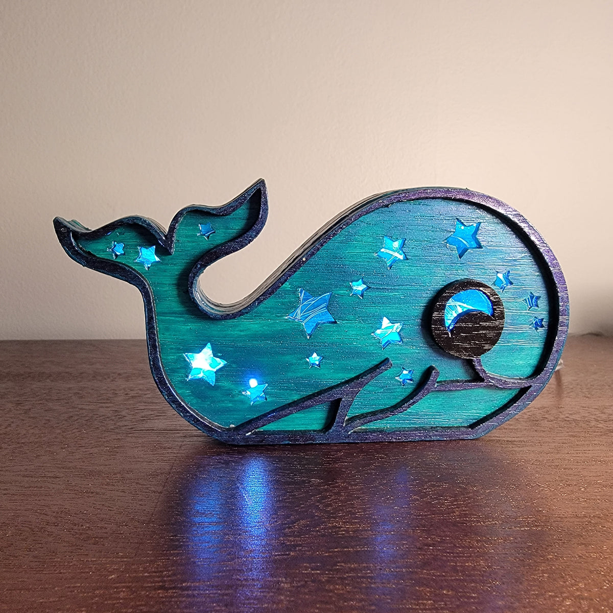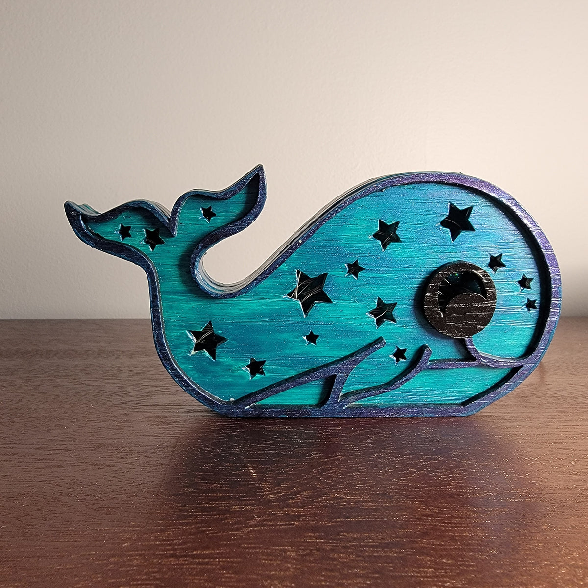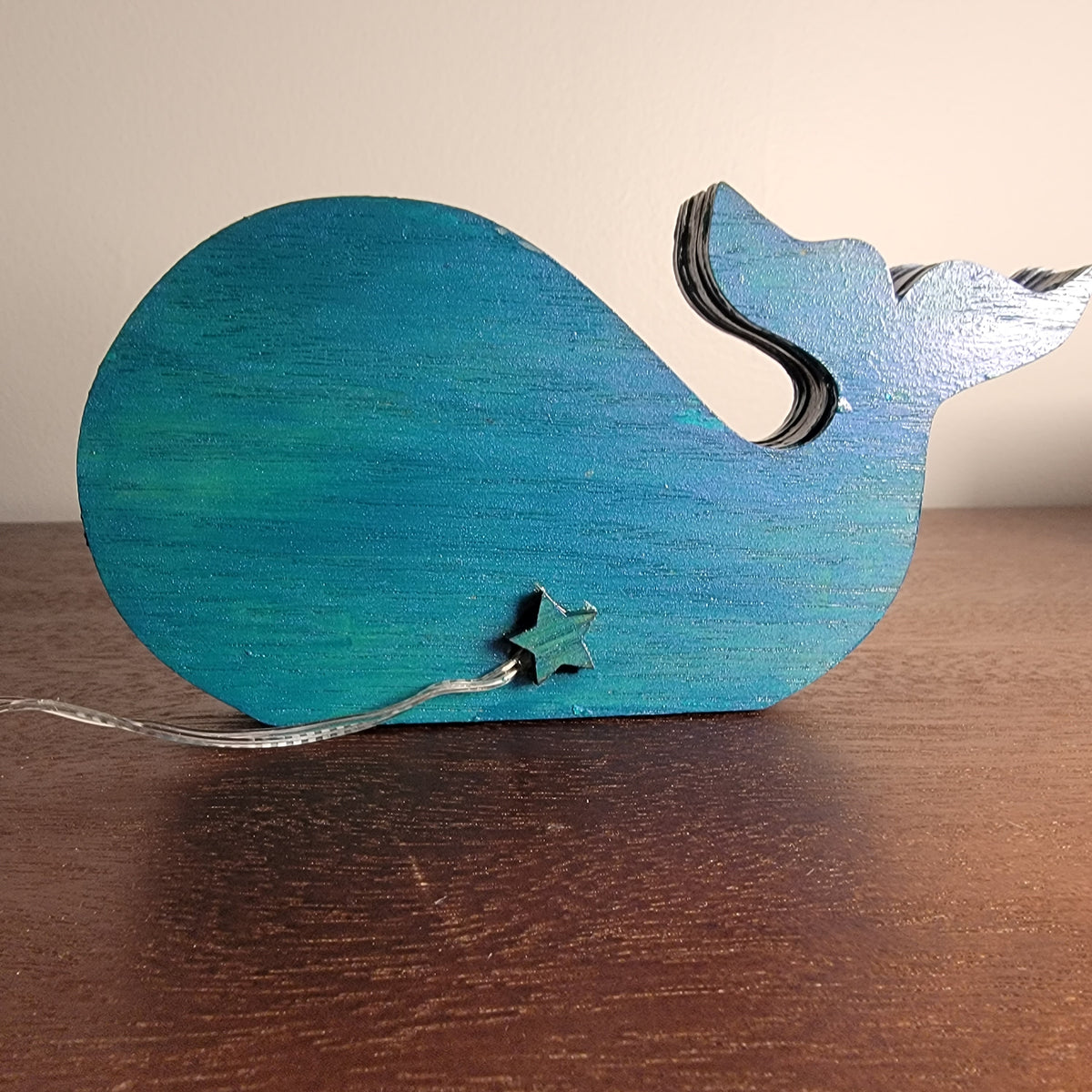 This adorable wooden night light is ready to light up a room! A wooden laser cut night light - the first of my original night light designs. Made with red oak plywood and painted with iridescent acrylic paint. The whale has been sealed with satin varnish to protect the wood and paint.