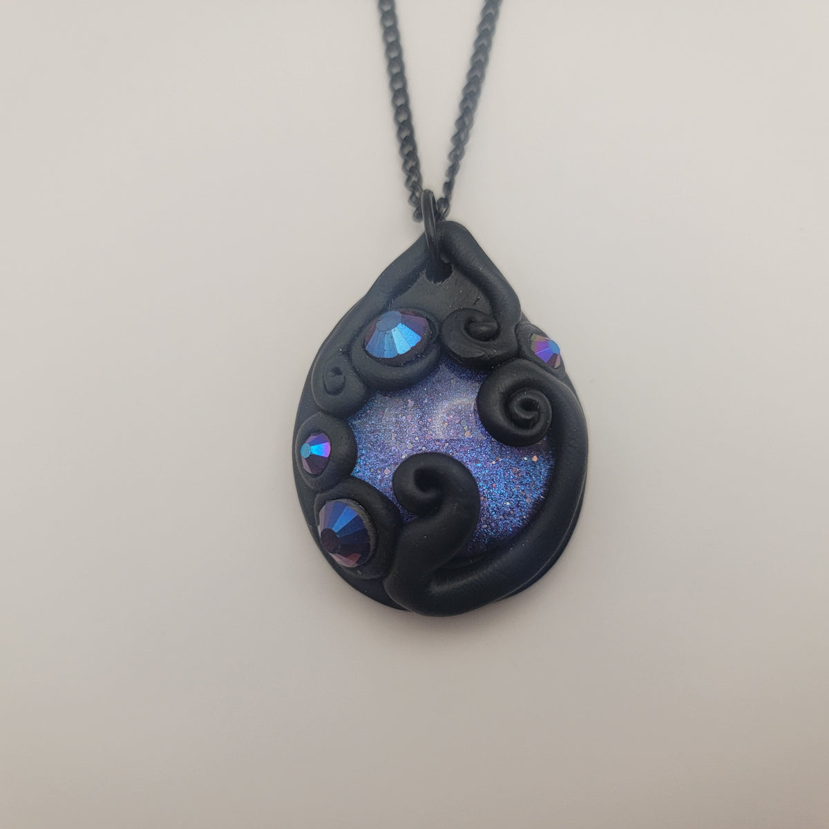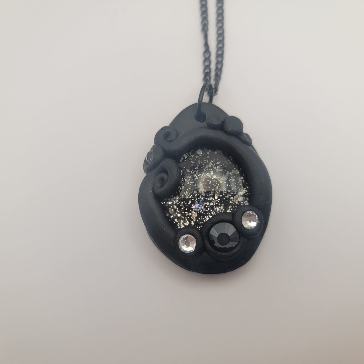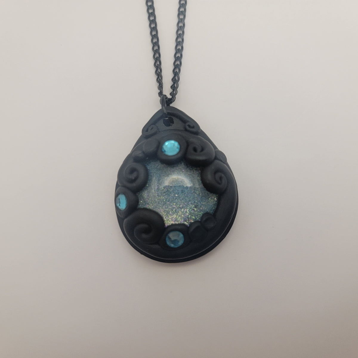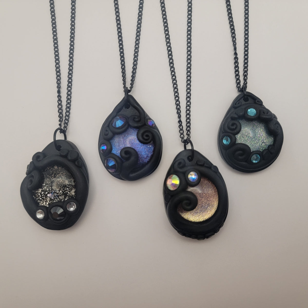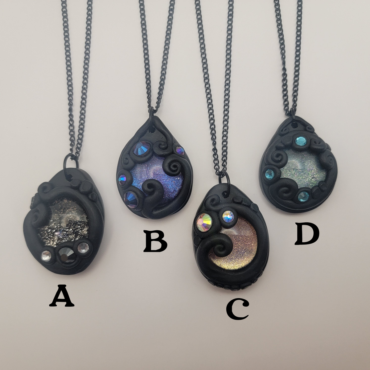 Medium sized polymer clay teardrop pendants. Black polymer clay pendants with hand painted glass cabochons surrounded with swirls of clay and rhinestones. Each pendant is made by hand and entirely unique.