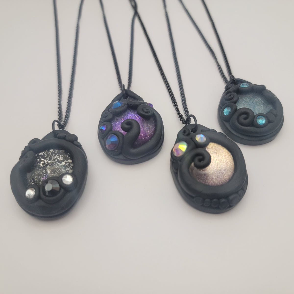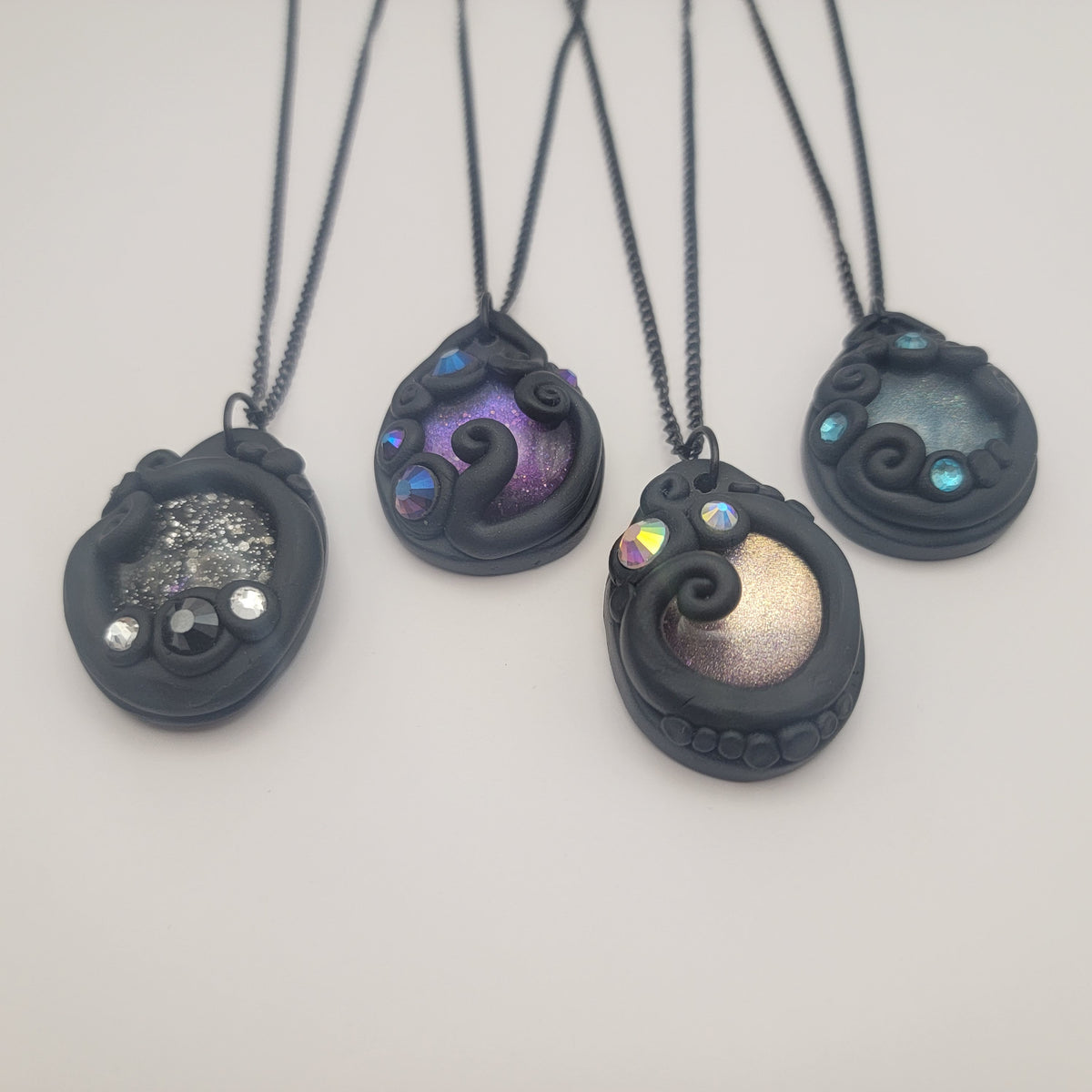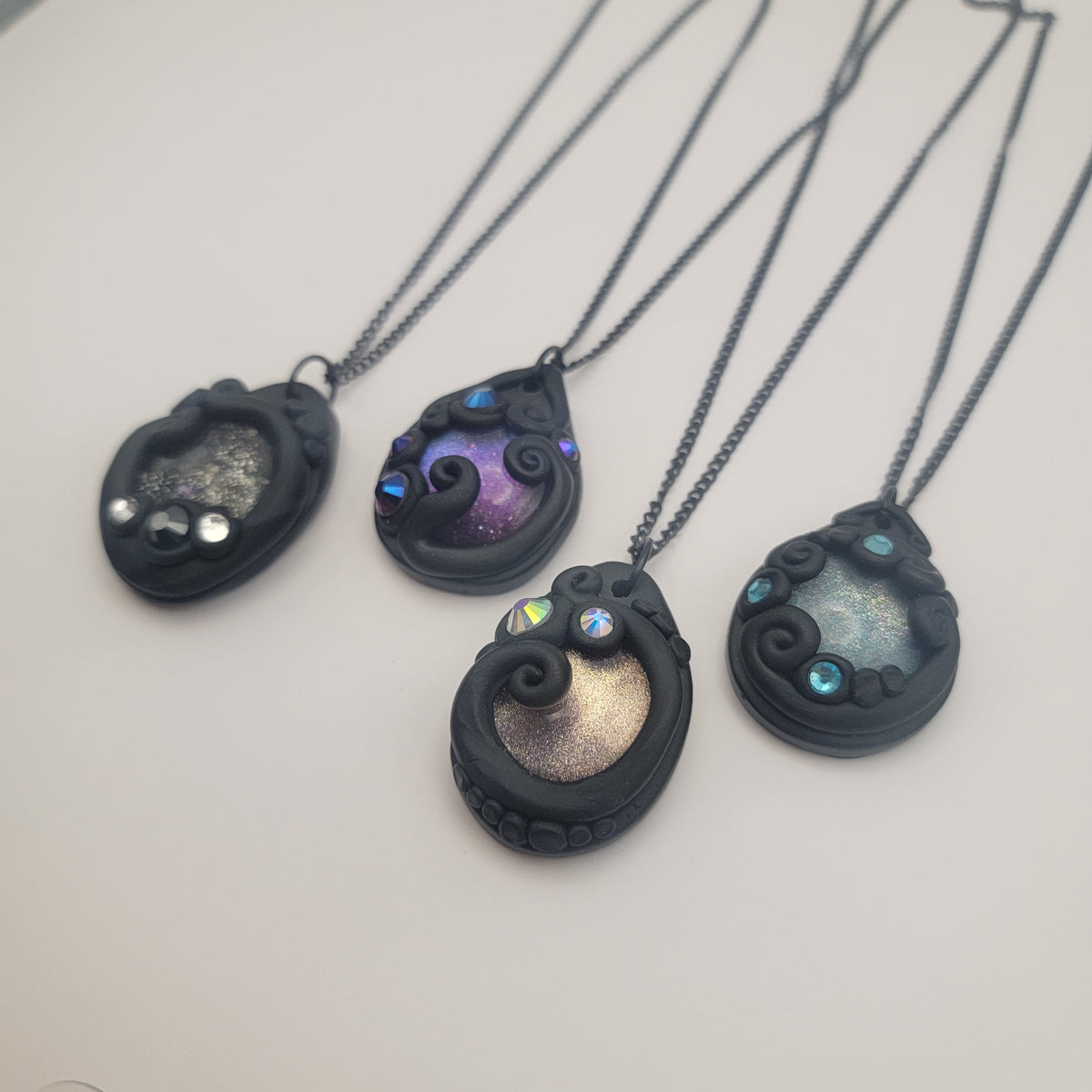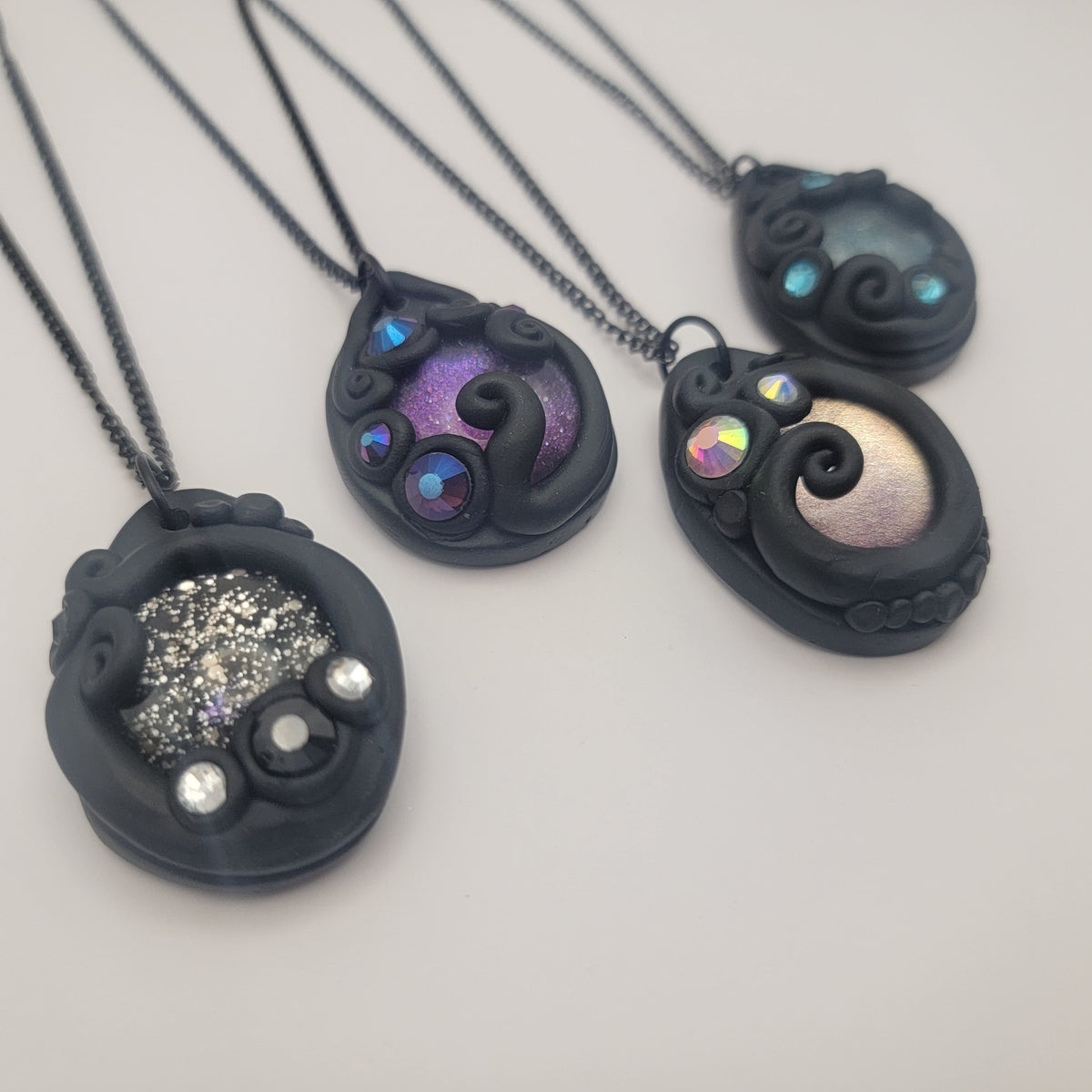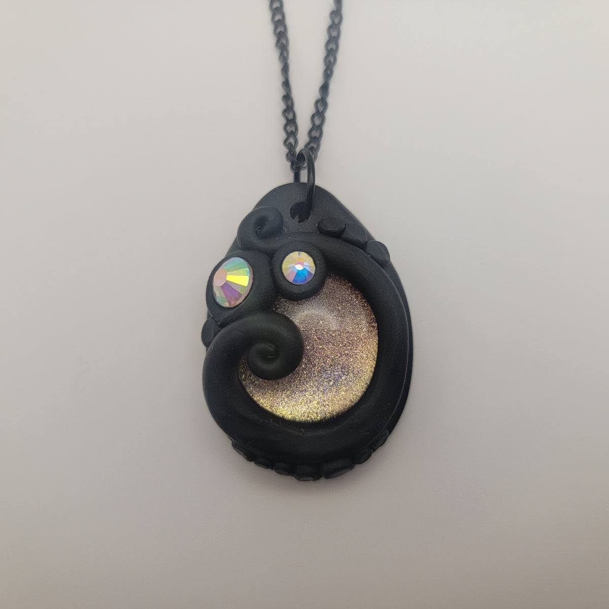 Medium sized polymer clay teardrop pendants. Black polymer clay pendants with hand painted glass cabochons surrounded with swirls of clay and rhinestones. Each pendant is made by hand and entirely unique.