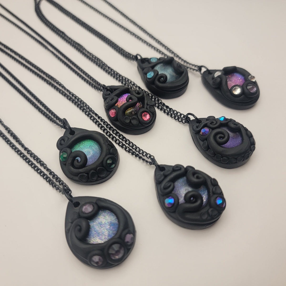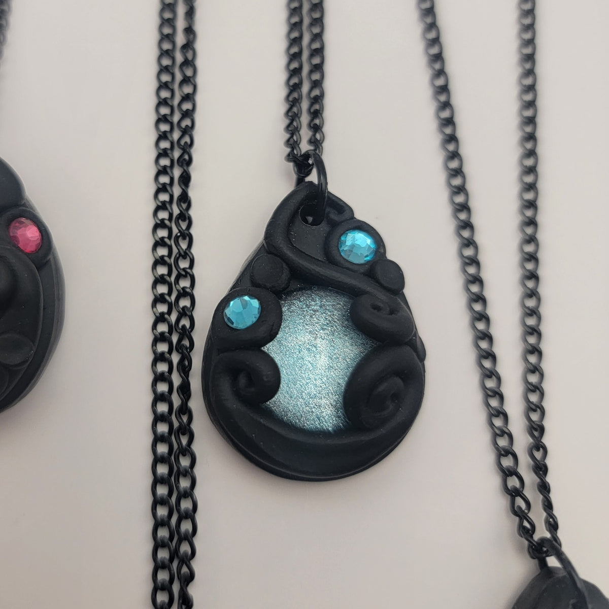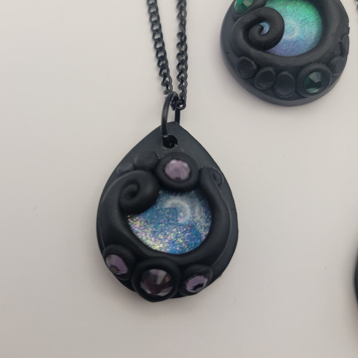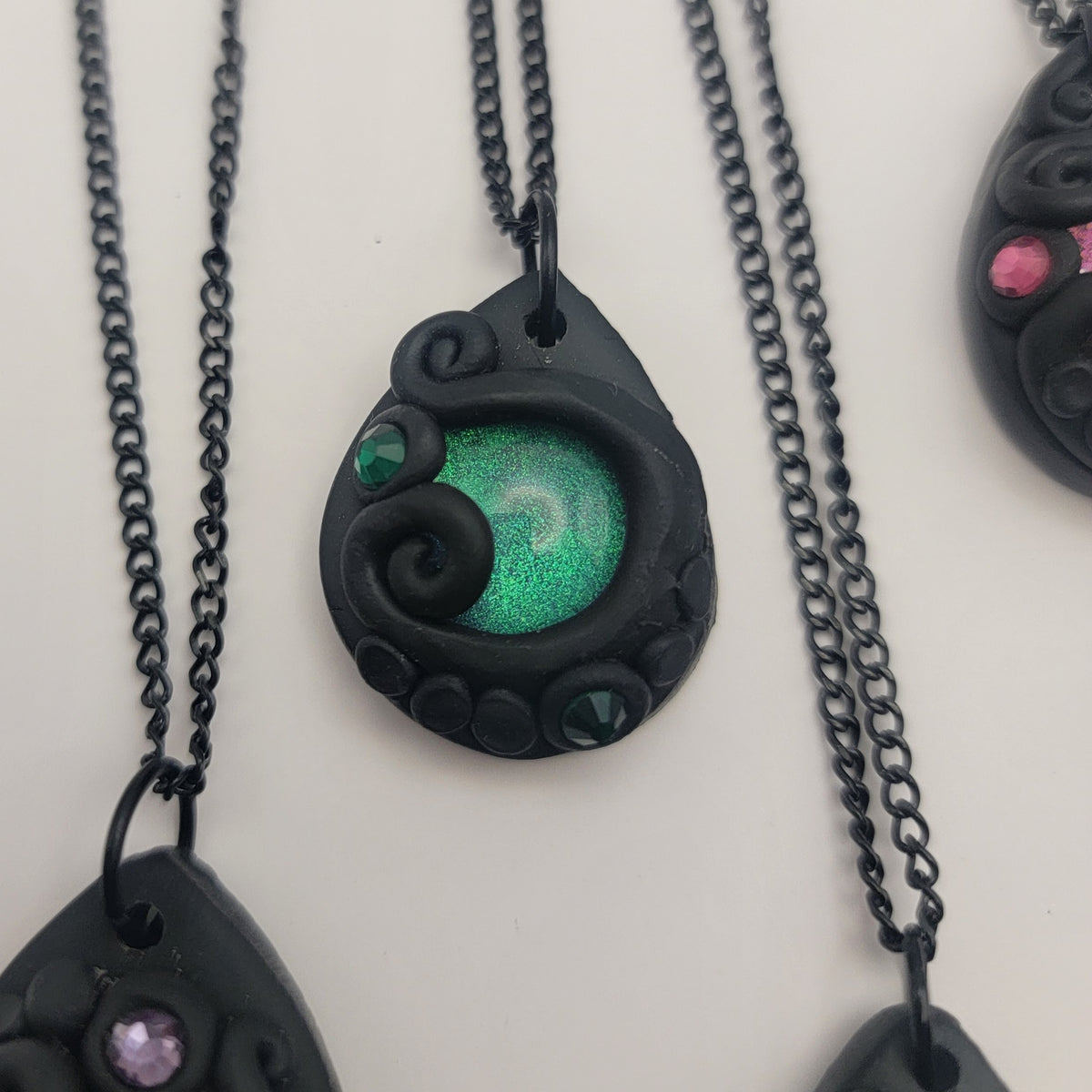 Black polymer clay pendants with hand painted glass cabochons surrounded with swirls of clay and rhinestones. Each pendant is made by hand and entirely unique.
