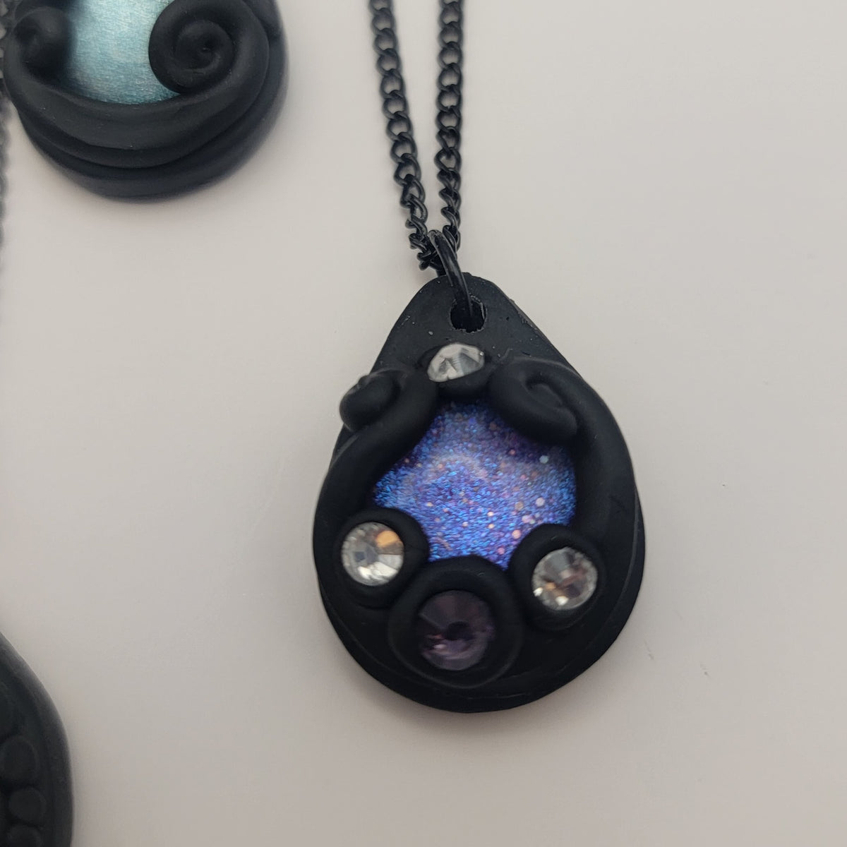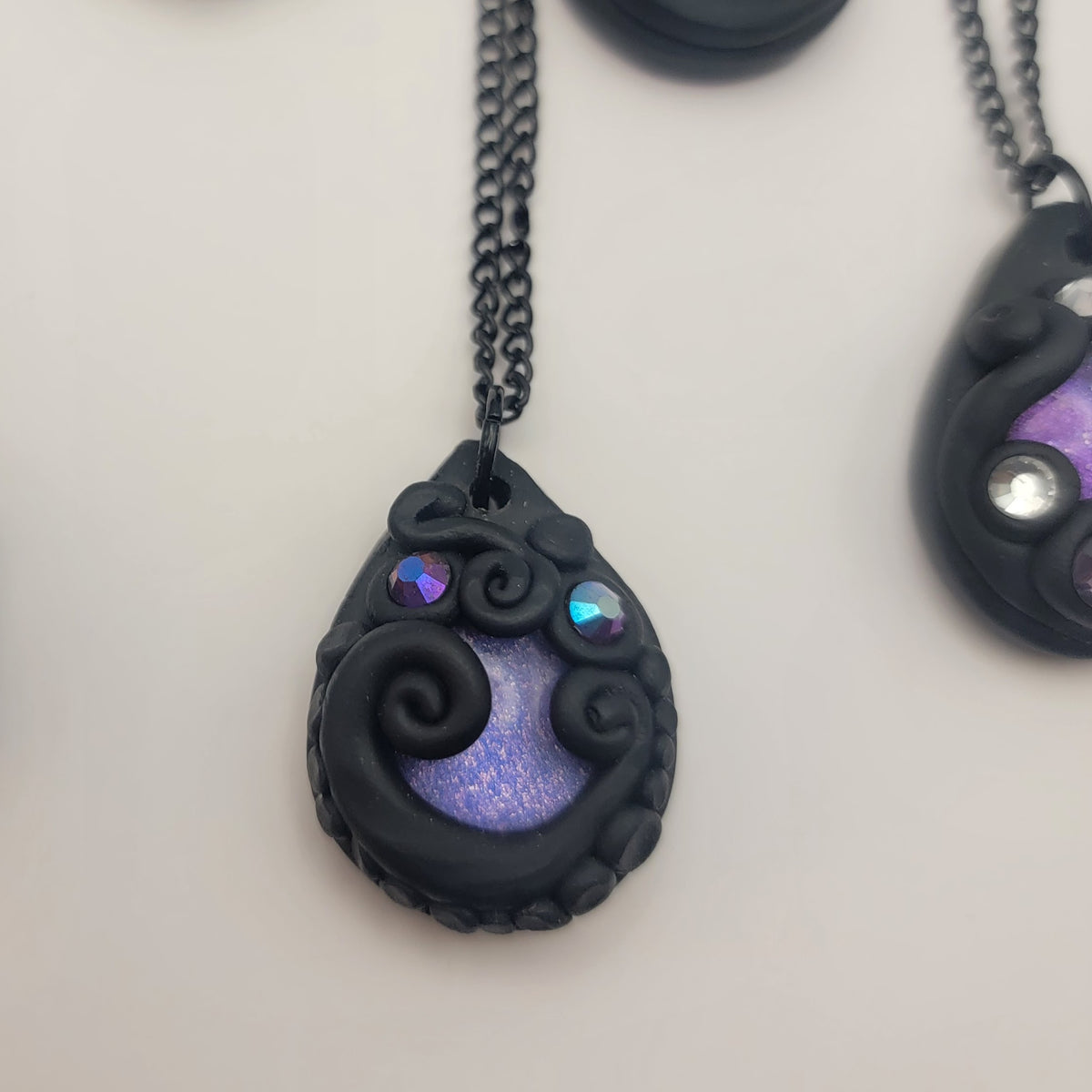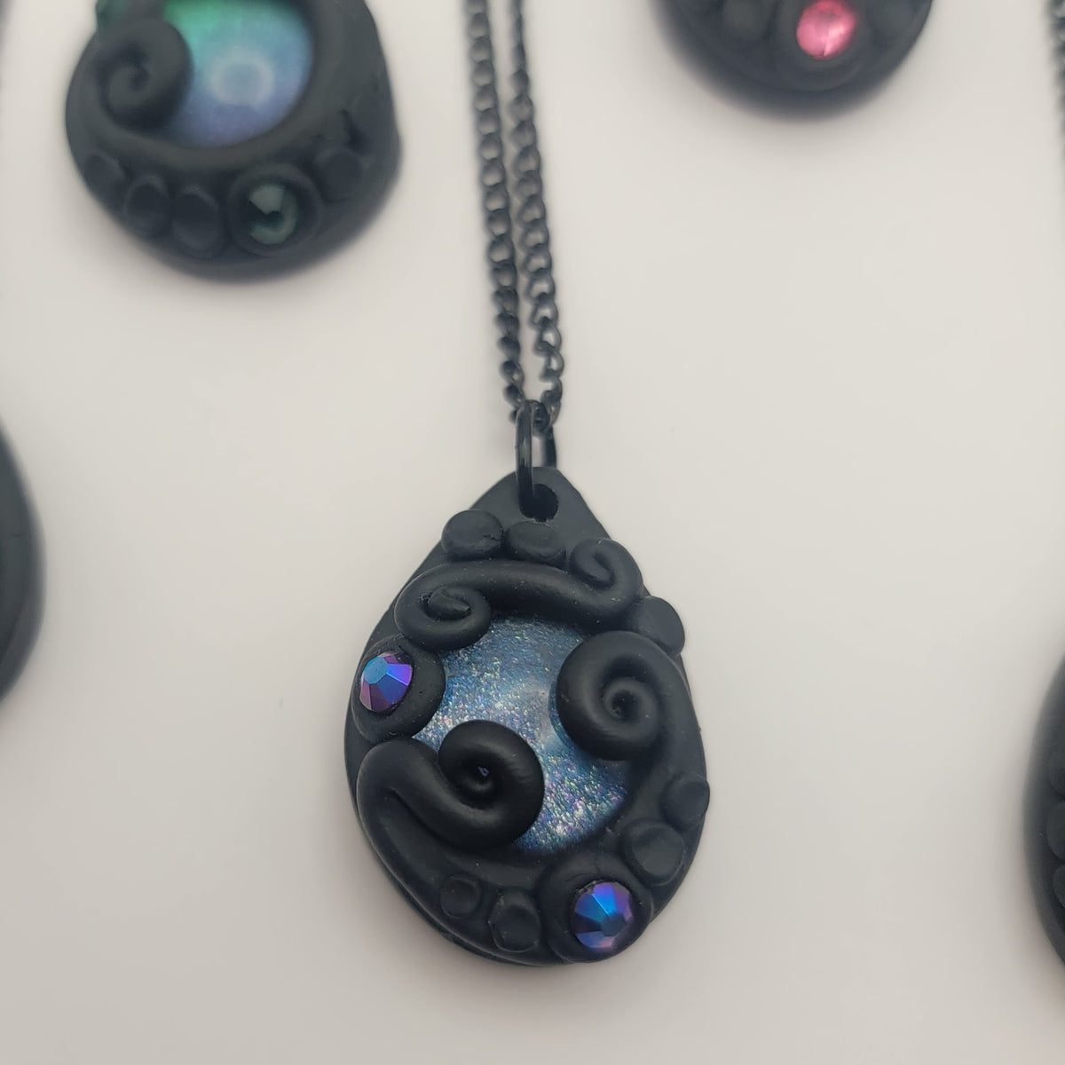 Black polymer clay pendants with hand painted glass cabochons surrounded with swirls of clay and rhinestones. Each pendant is made by hand and entirely unique.