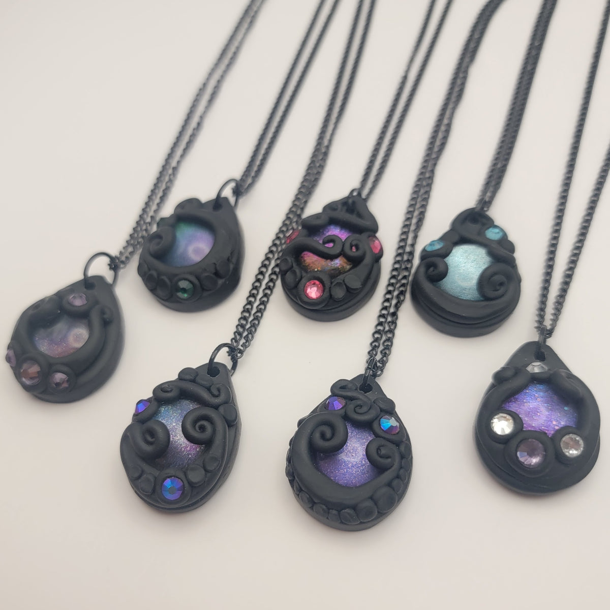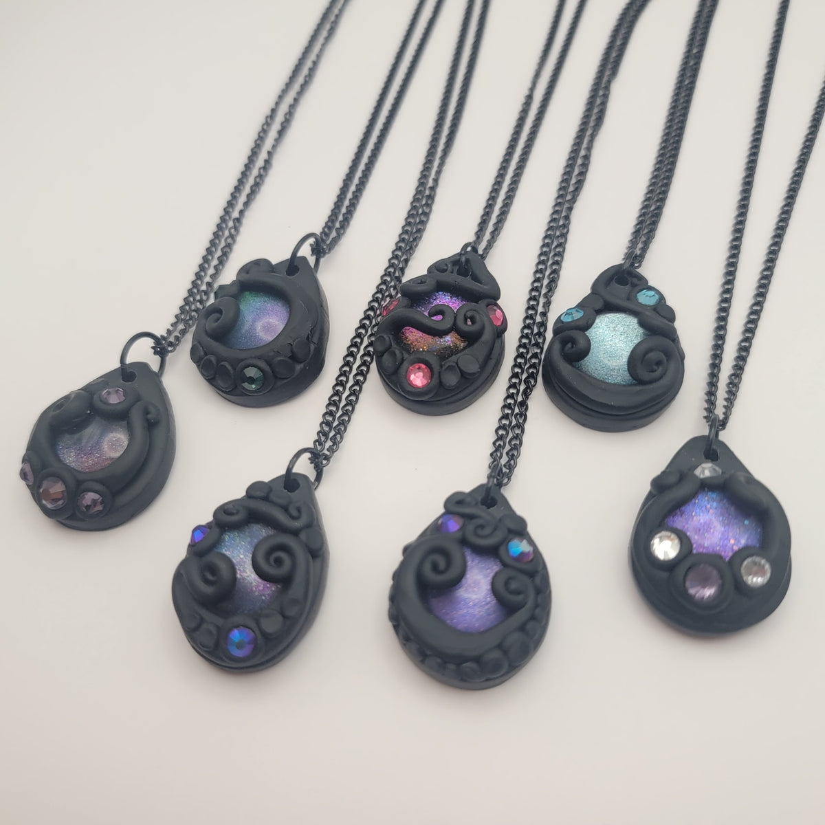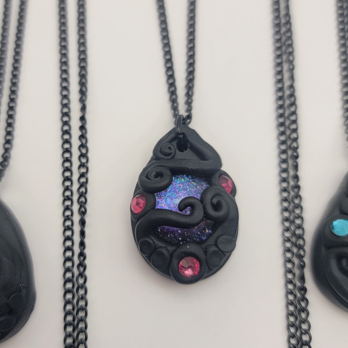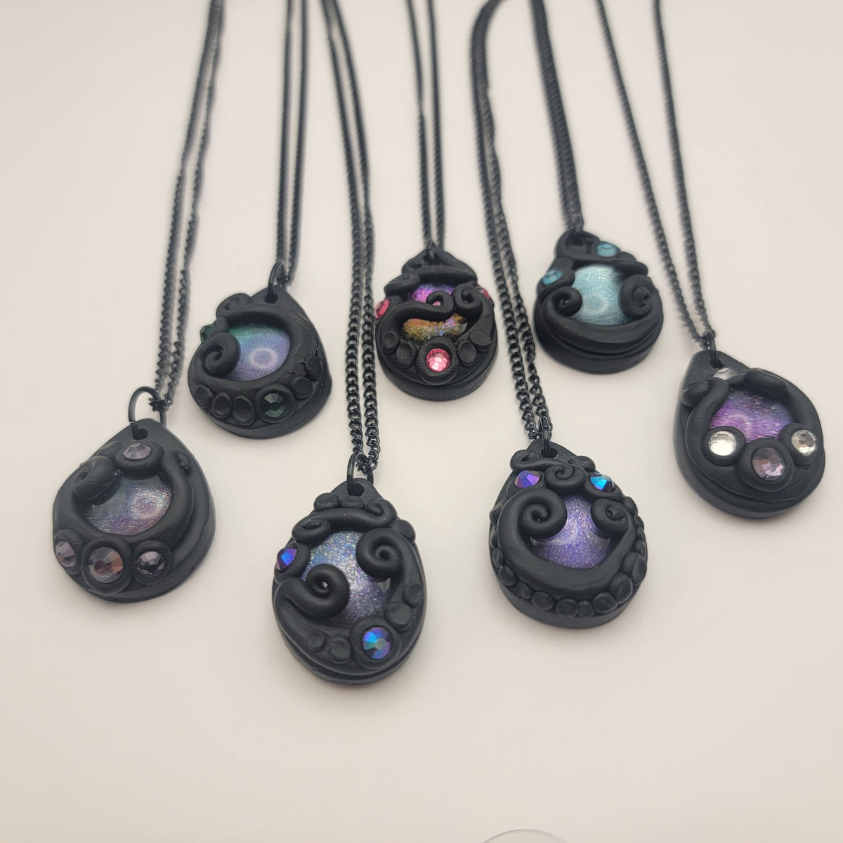 Black polymer clay pendants with hand painted glass cabochons surrounded with swirls of clay and rhinestones. Each pendant is made by hand and entirely unique.