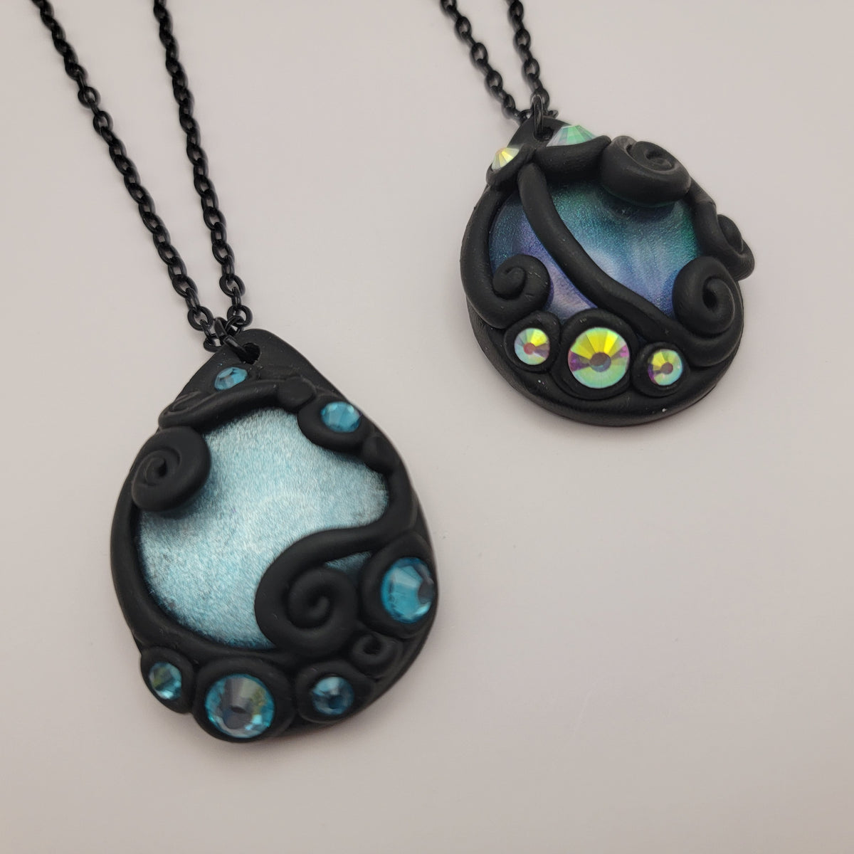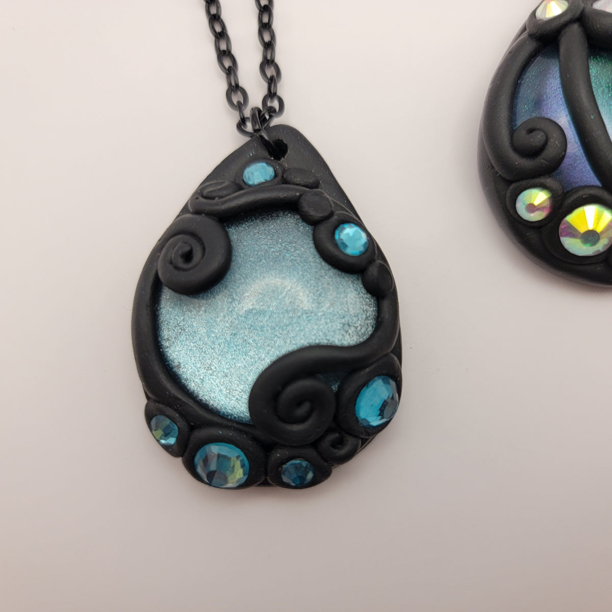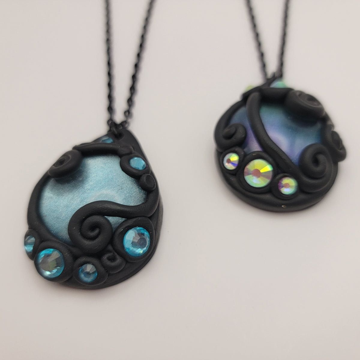 Black polymer clay pendants with hand painted glass cabochons surrounded with swirls of clay and rhinestones. Each pendant is made by hand and entirely unique.