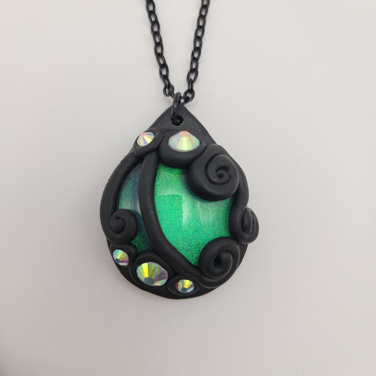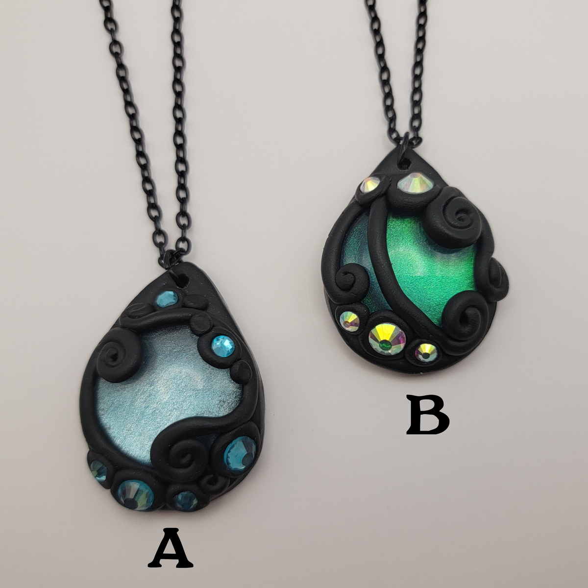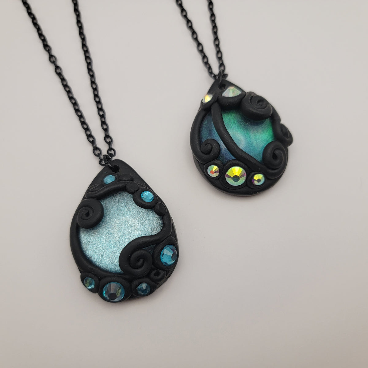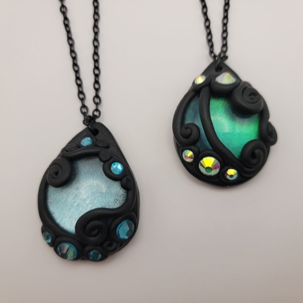 Black polymer clay pendants with hand painted glass cabochons surrounded with swirls of clay and rhinestones. Each pendant is made by hand and entirely unique.