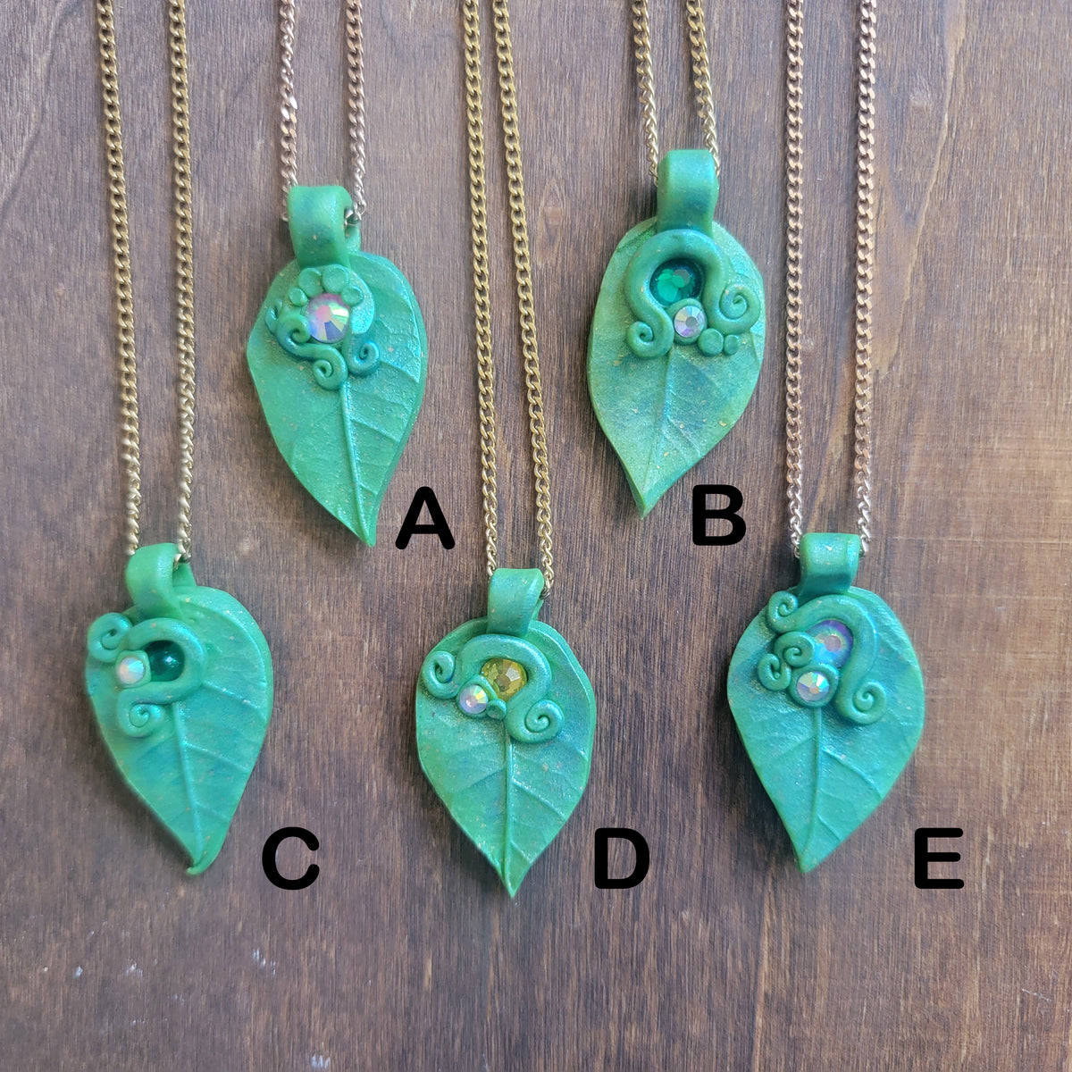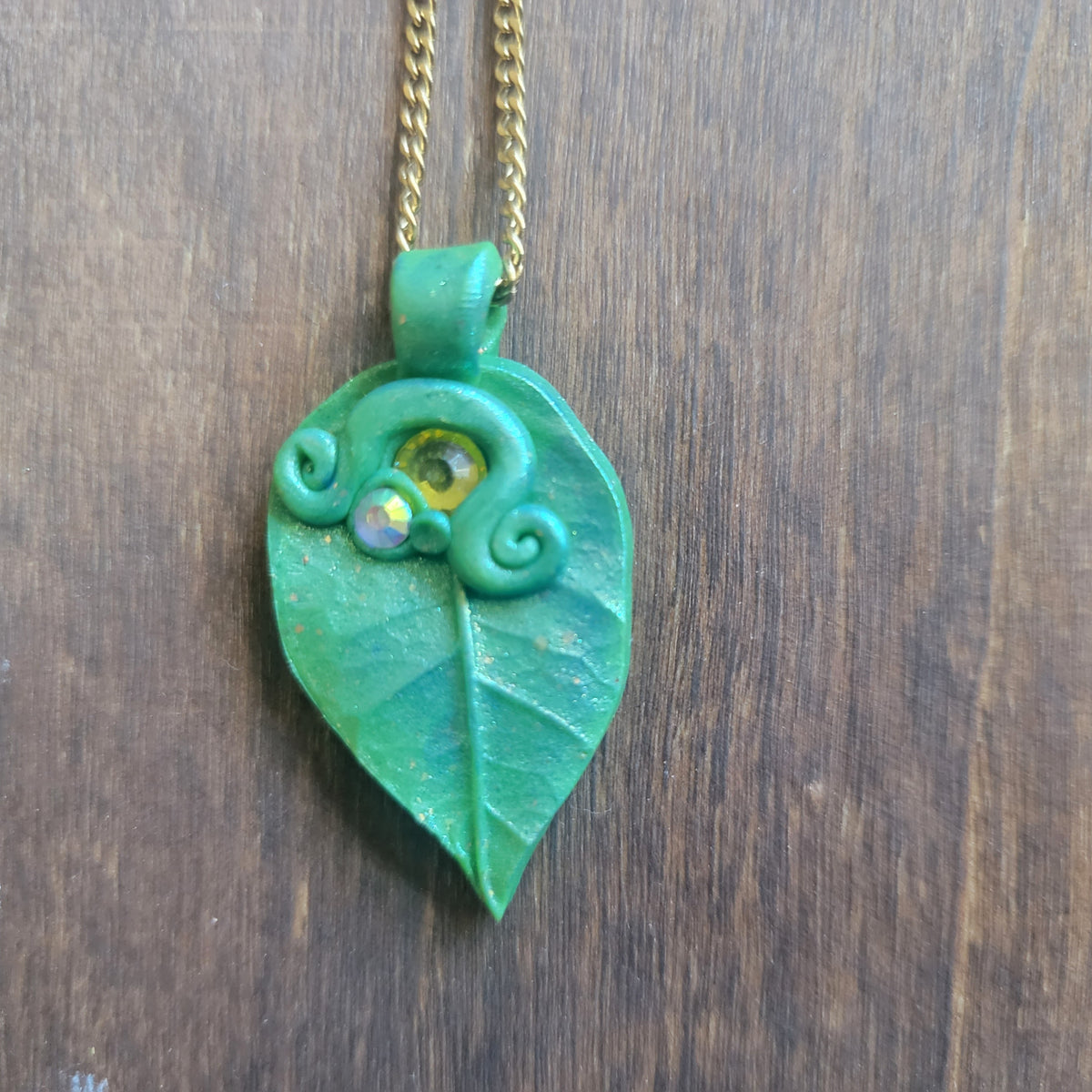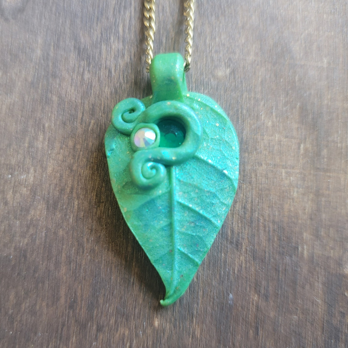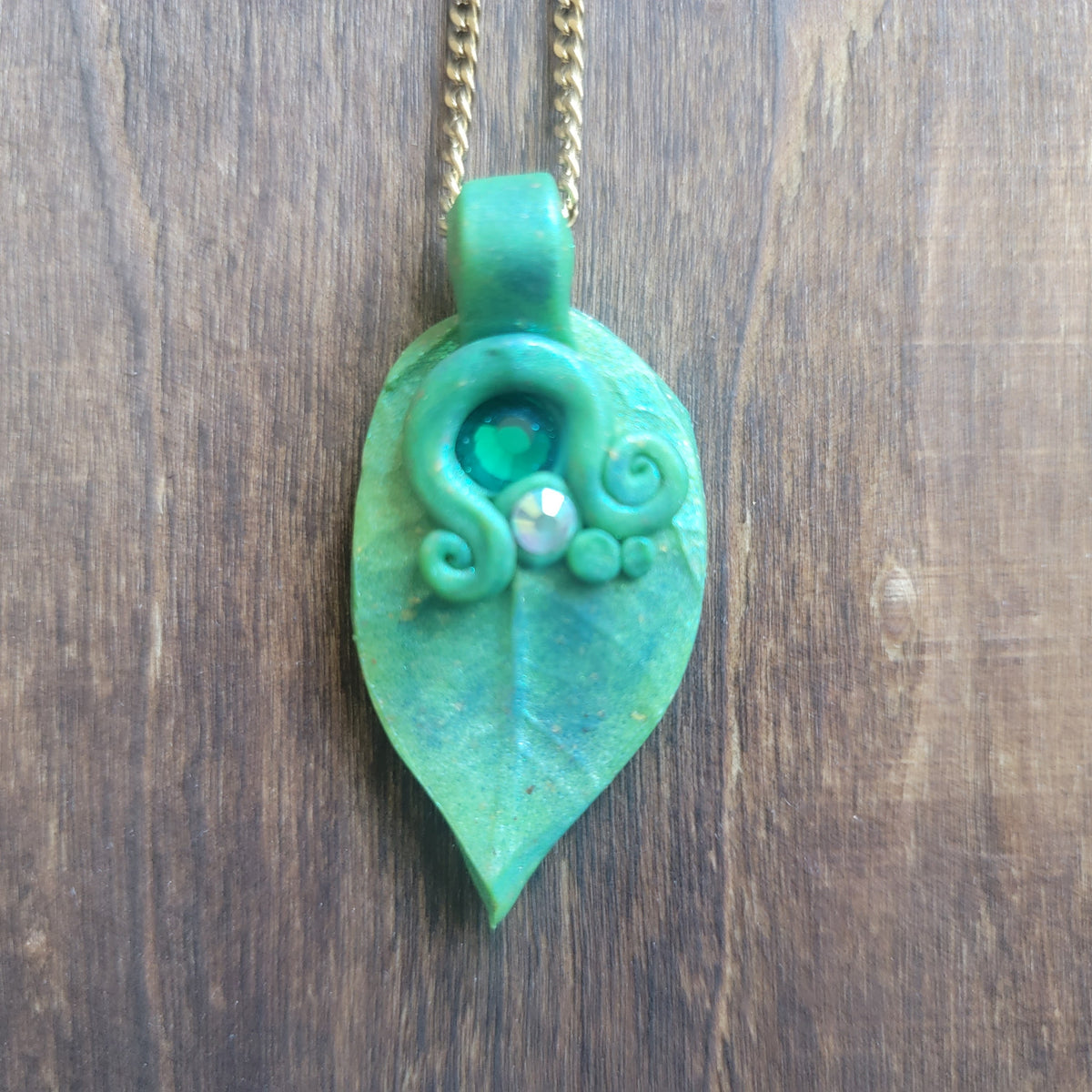 A magical leaf pendant, perfect for excursions into the enchanted forest or any fairy realm! These leaves are on the smaller side, measuring approximately 1.75 long (including bail) by about .9 inches wide. Each leaf accented with rhinestones and swirling clay, and painted with chameleon powder, giving it a shimmery appearance.