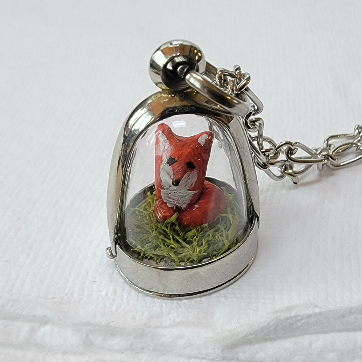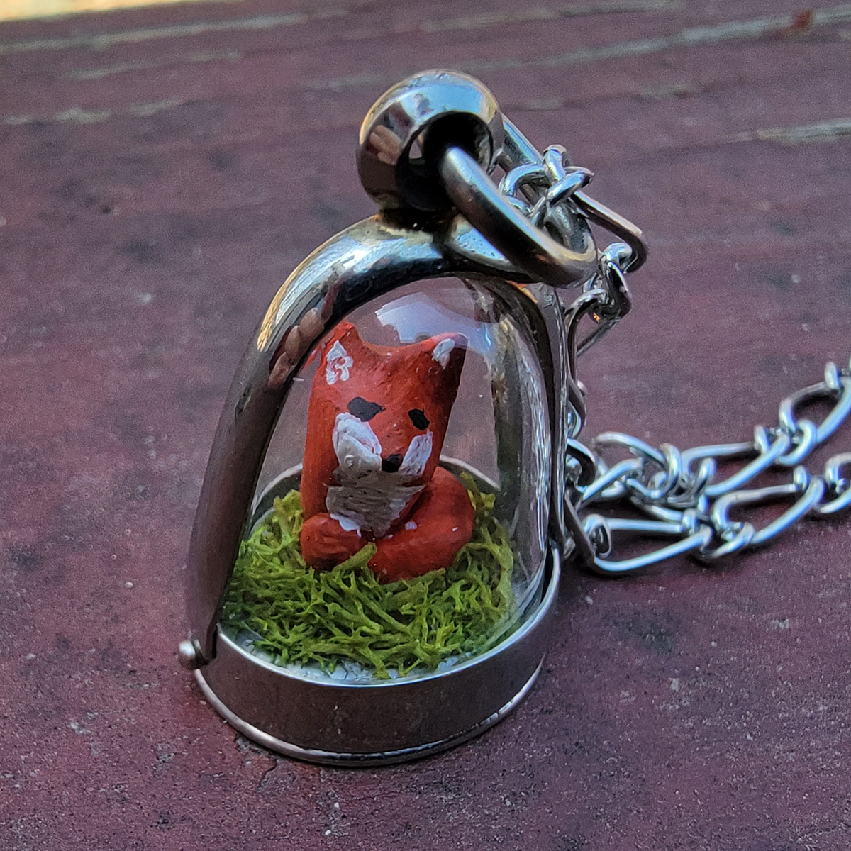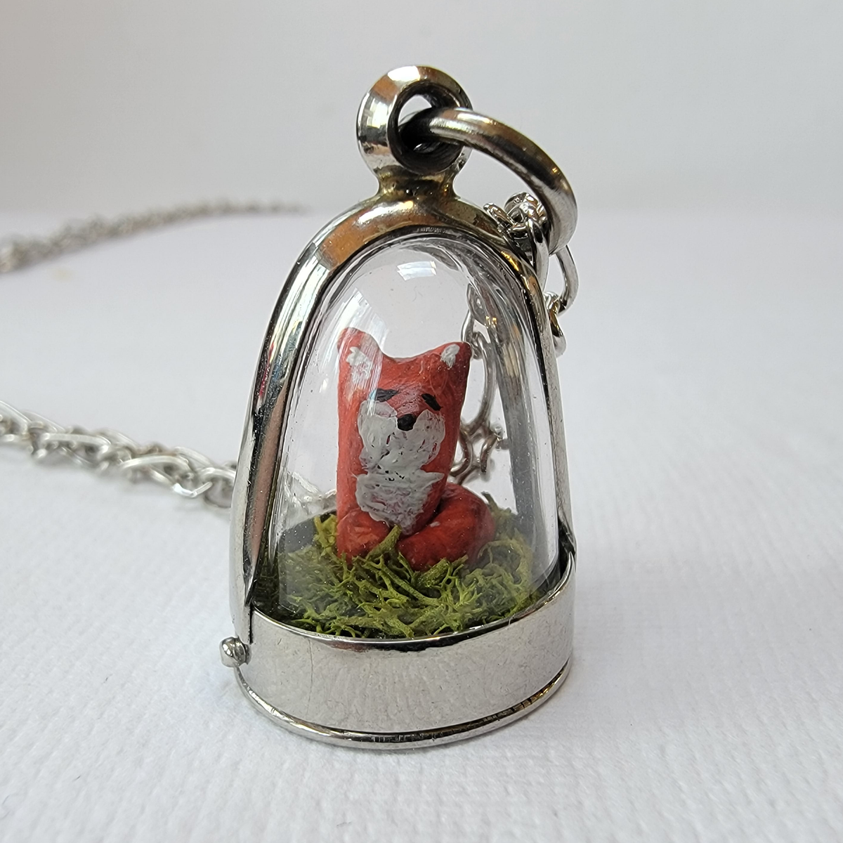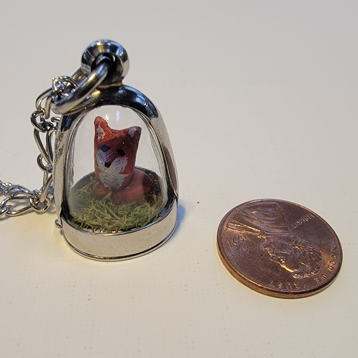 A tiny fox sits in the moss in this miniature dome pendant. The fox is made of polymer clay, painted, and sealed with varnish. Fox and moss are secured in place.