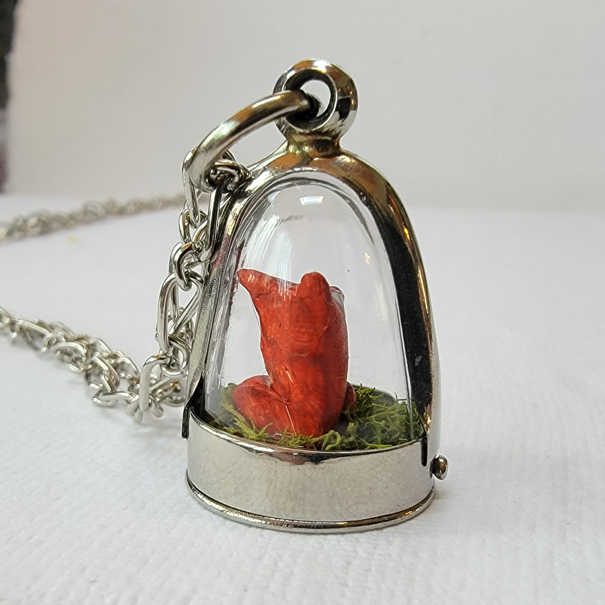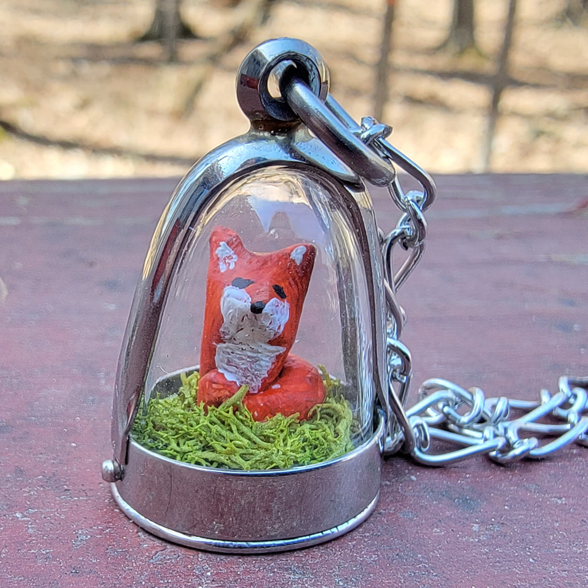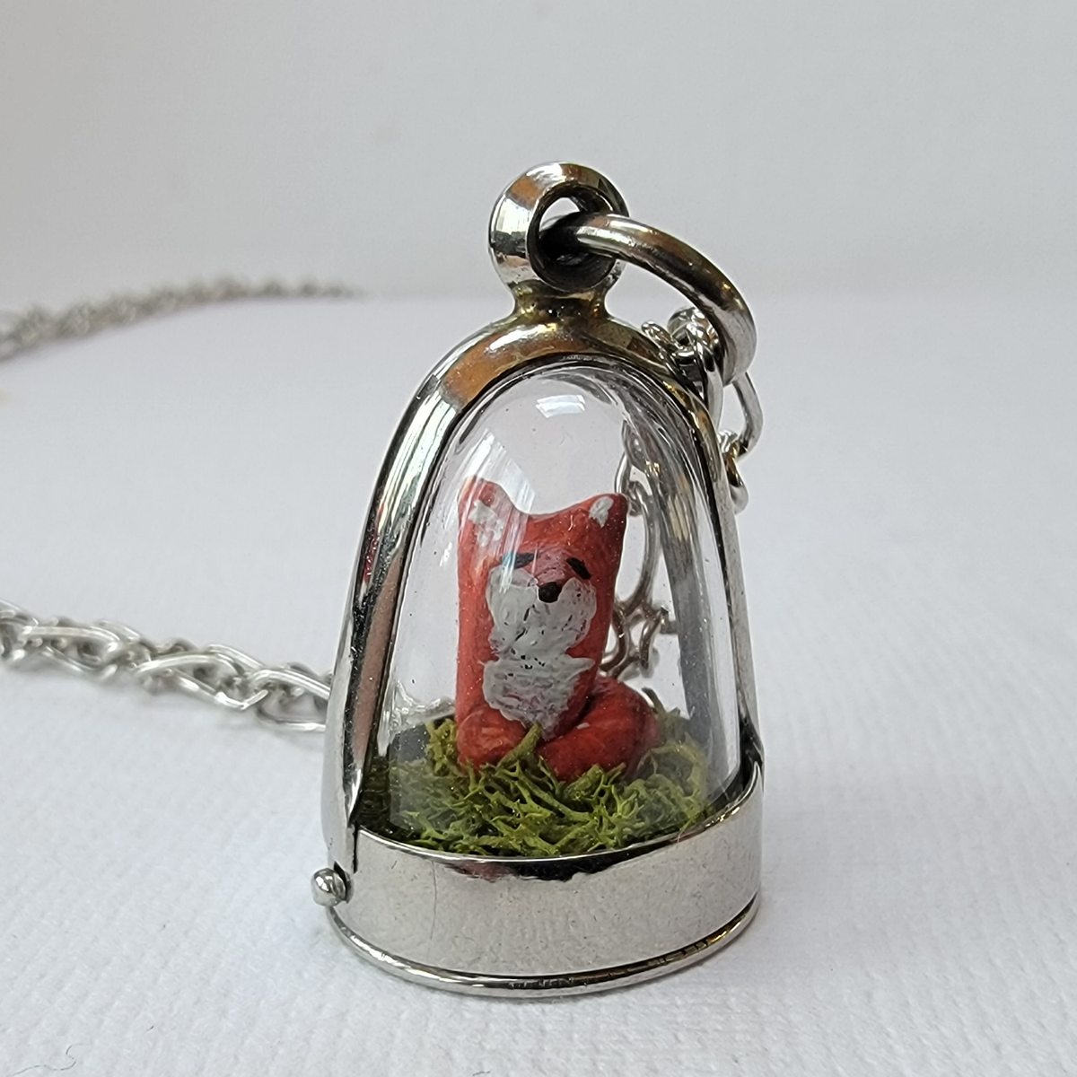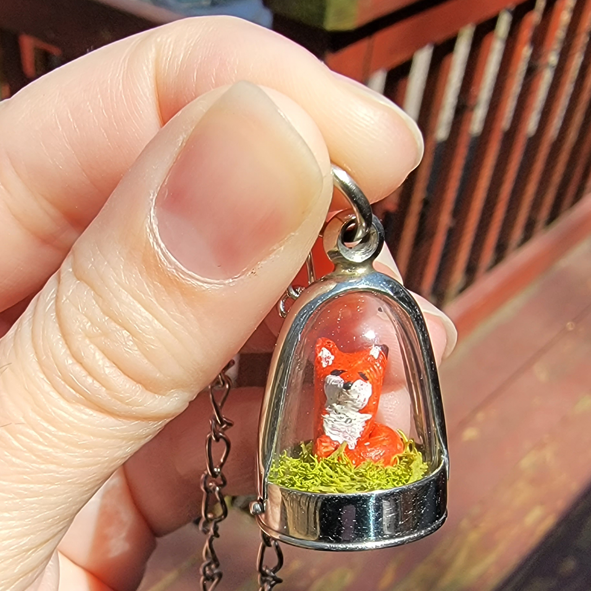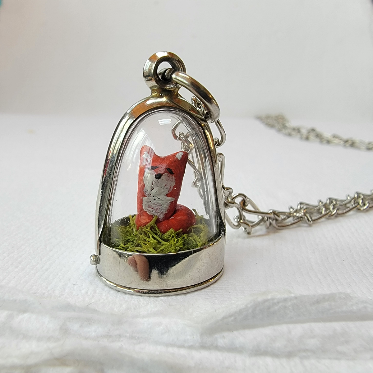 A tiny fox sits in the moss in this miniature dome pendant. The fox is made of polymer clay, painted, and sealed with varnish. Fox and moss are secured in place.