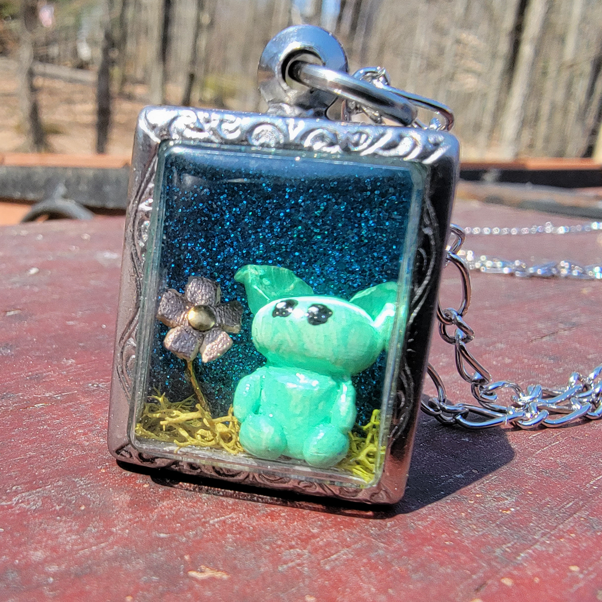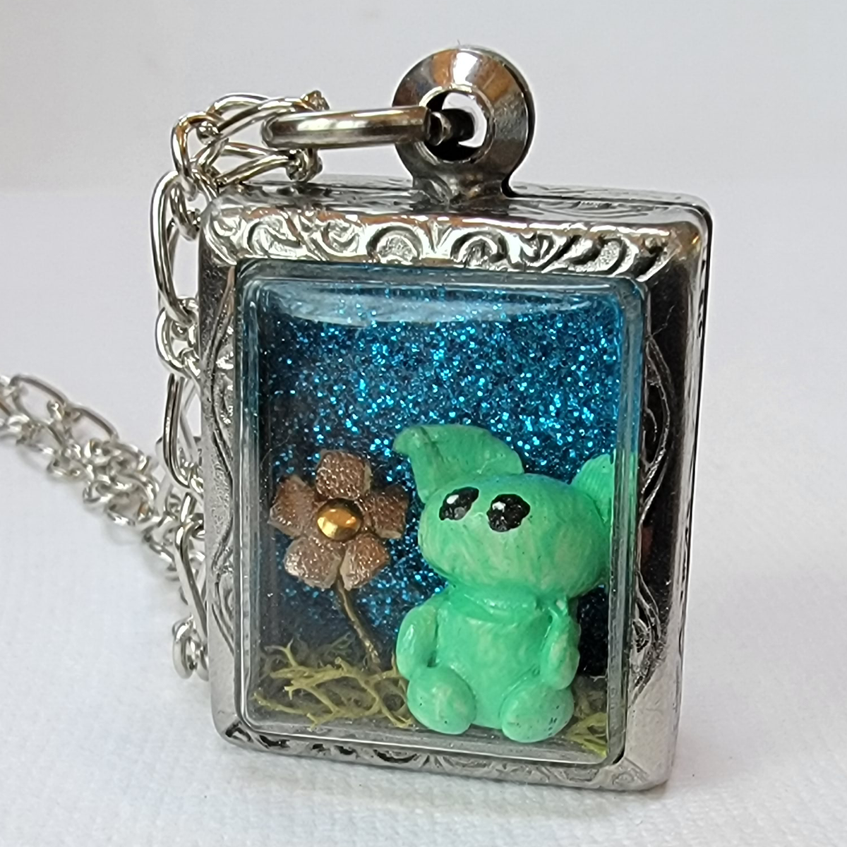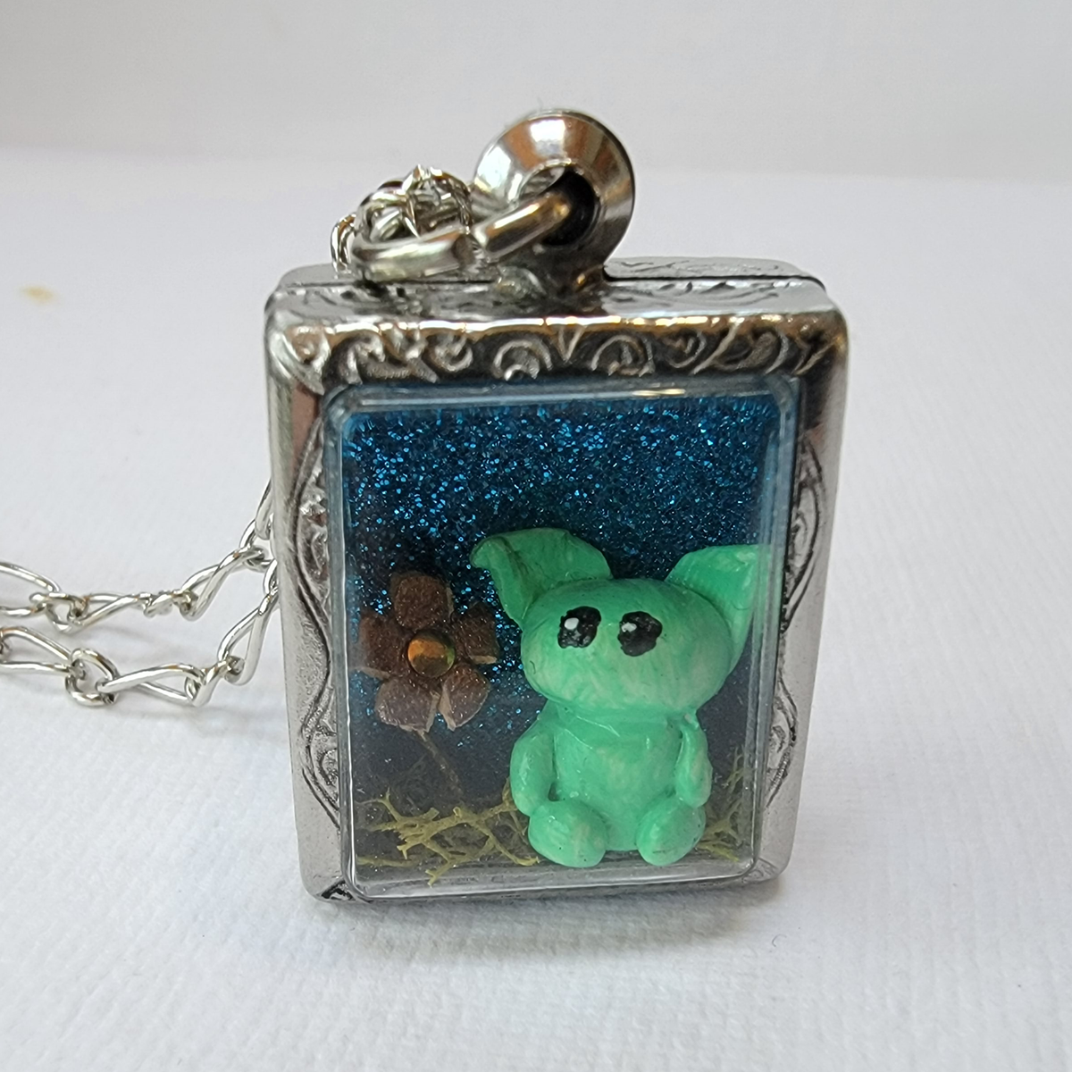 A tiny green gremlin sits on some moss beside a rose gold flower. They're set against a glittery blue background in this tiny pendant world. The gremlin is made with polymer clay, painted with acrylic and sealed with varnish. The flower is made of metal and leather. Everything is secured in place.
