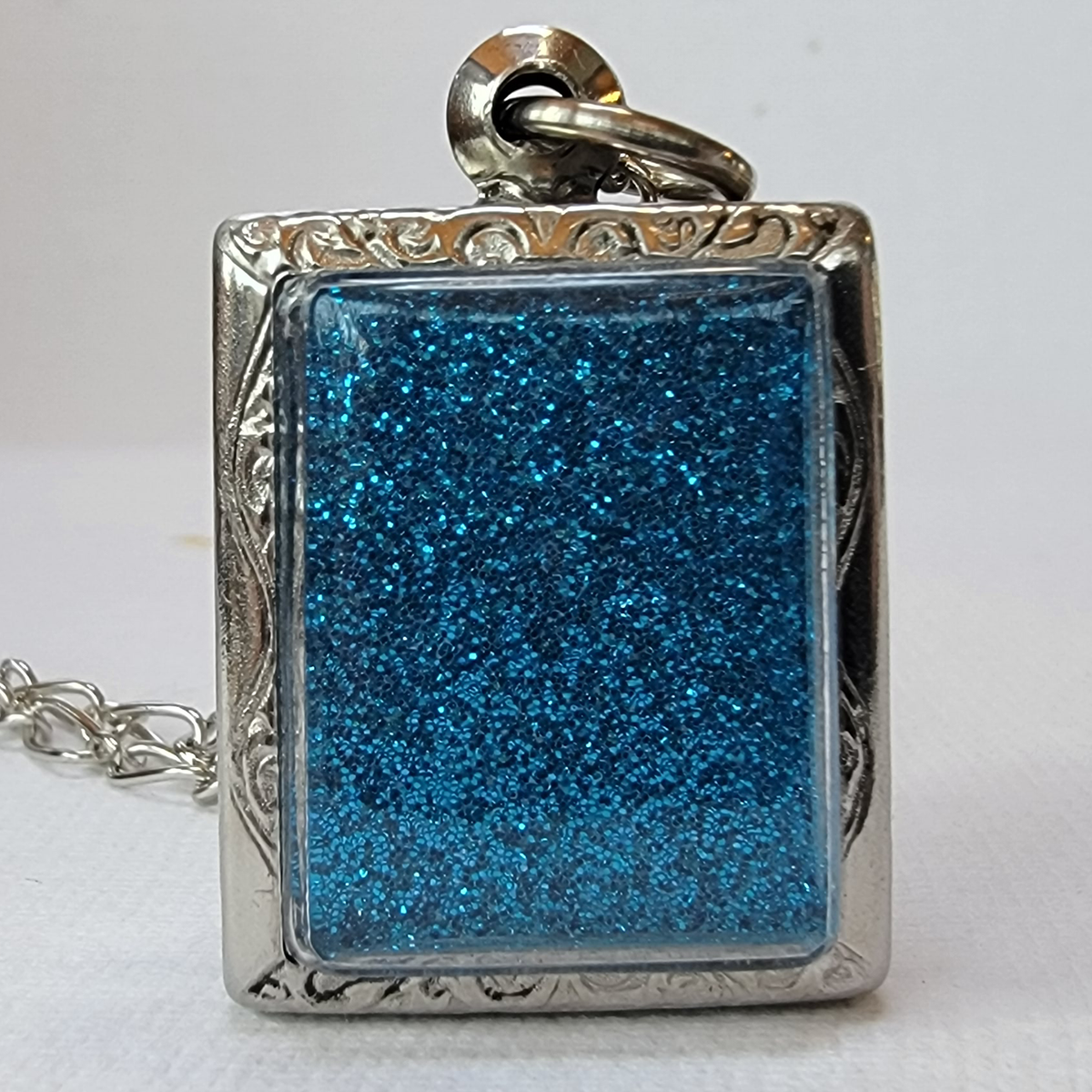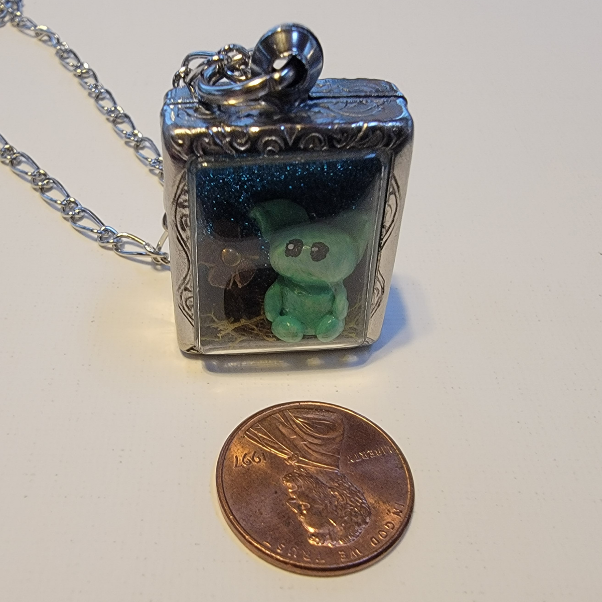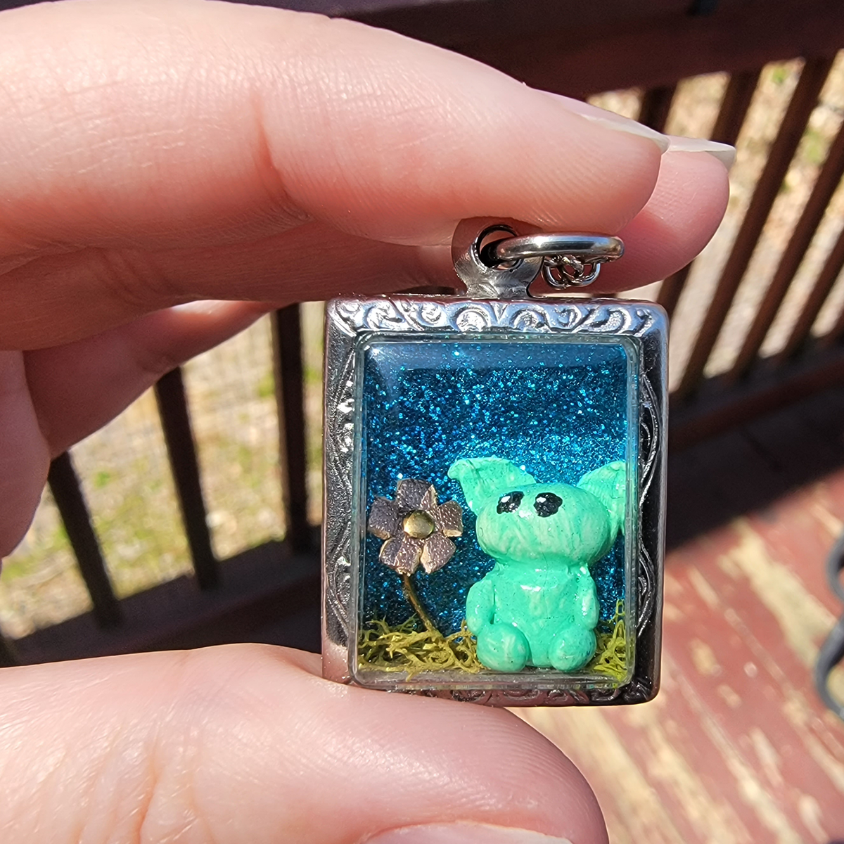 A tiny green gremlin sits on some moss beside a rose gold flower. They're set against a glittery blue background in this tiny pendant world. The gremlin is made with polymer clay, painted with acrylic and sealed with varnish. The flower is made of metal and leather. Everything is secured in place.
